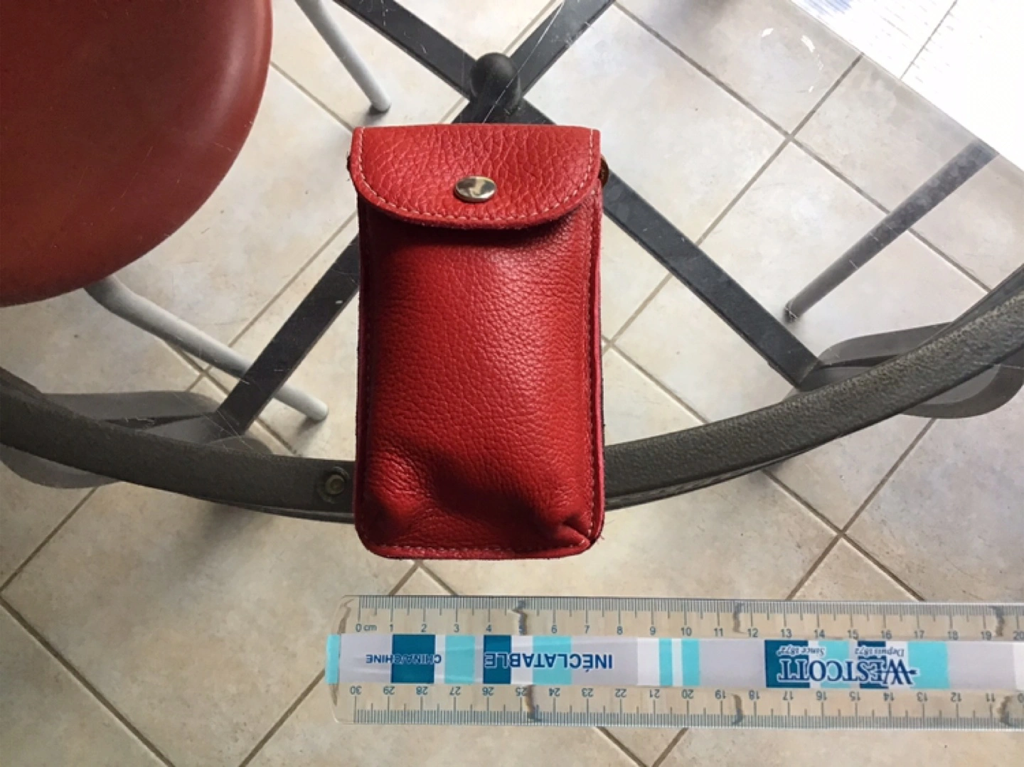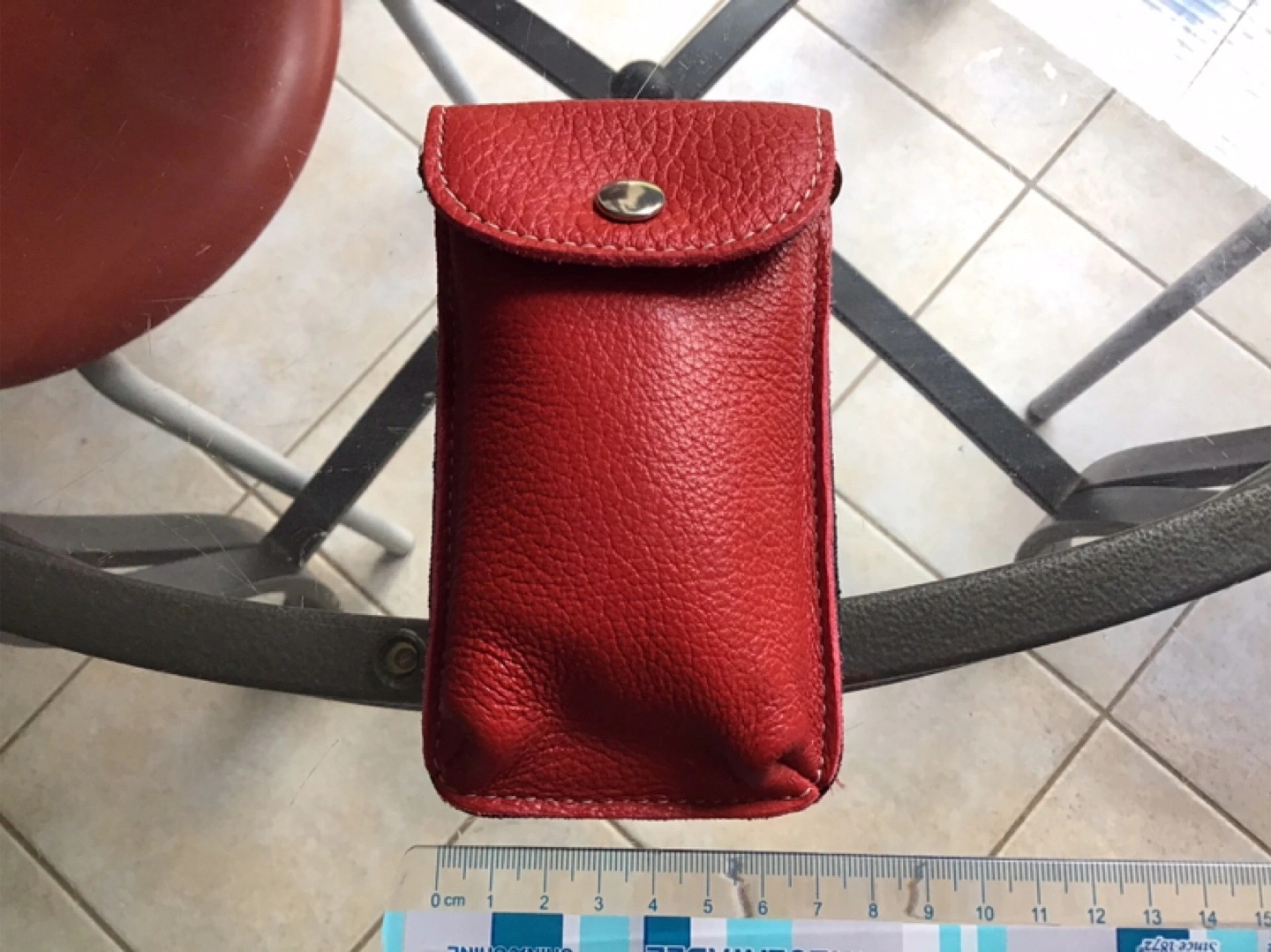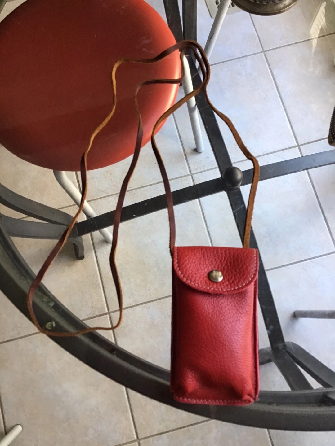 Red leather mini pouch with a long leather strap. Small, compact design. Snap closure 🤩