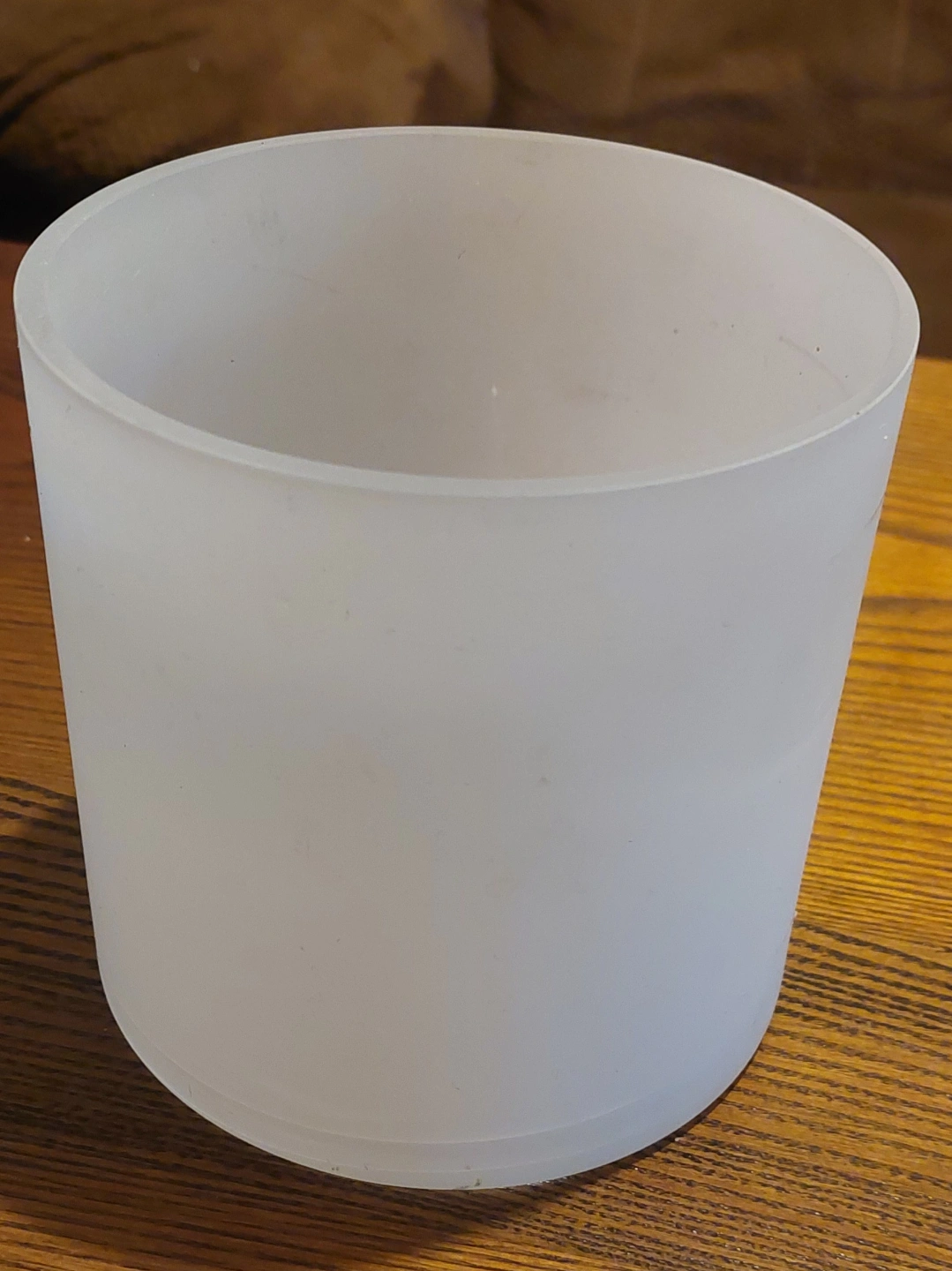 586Short cylindrical candle holder. Frosted glass exterior, clear glass interior. Perfect for pillar candles or other decorative purposes. Small size, ideal for smaller spaces.