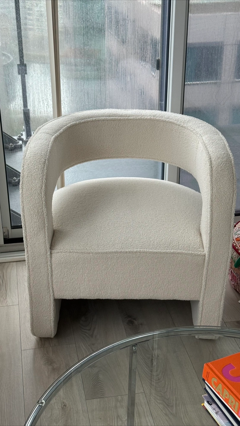 Set of 2. Unique accent chair. Cream boucle fabric. Rounded design. Modern style. Comfortable seating.