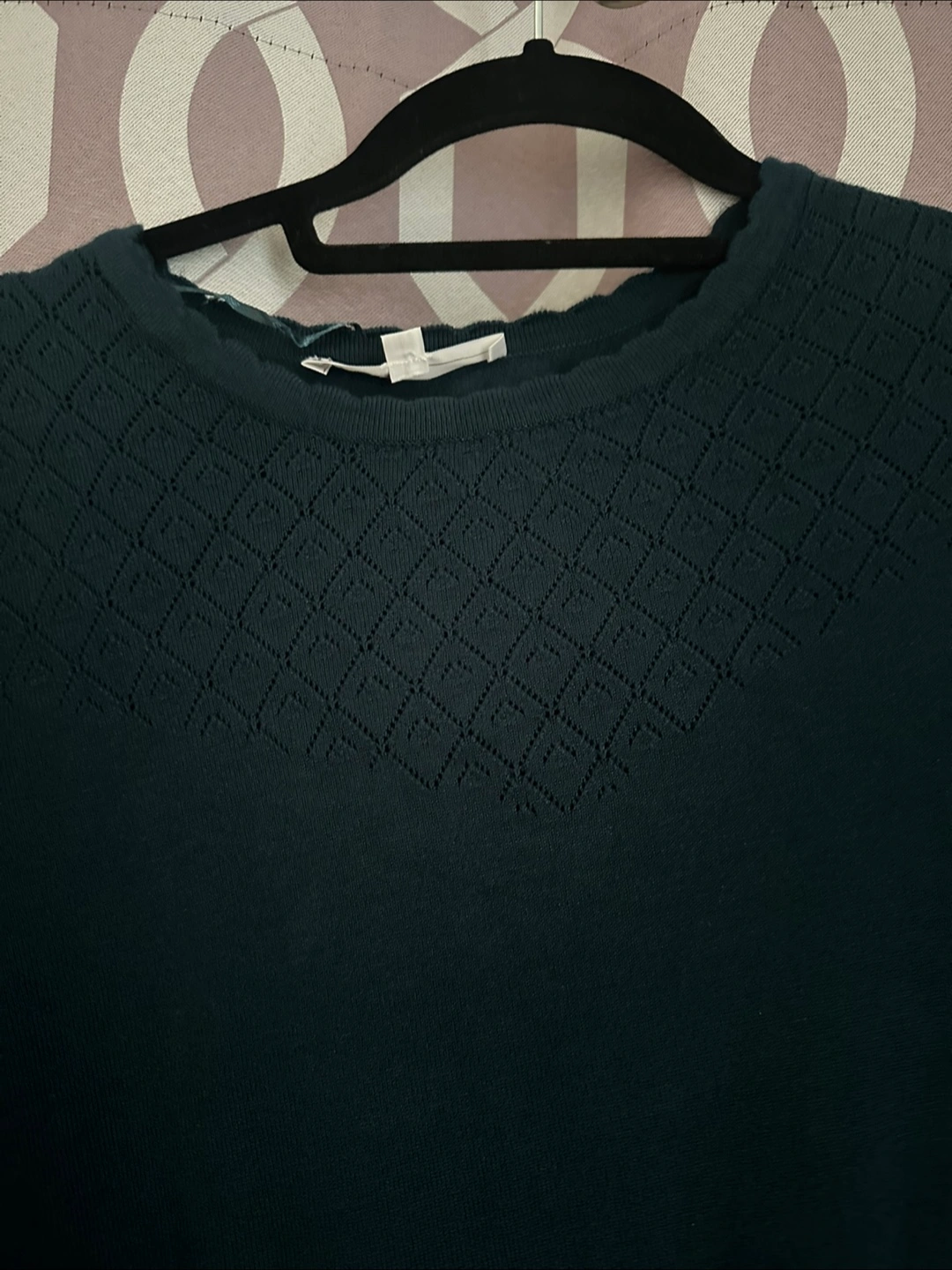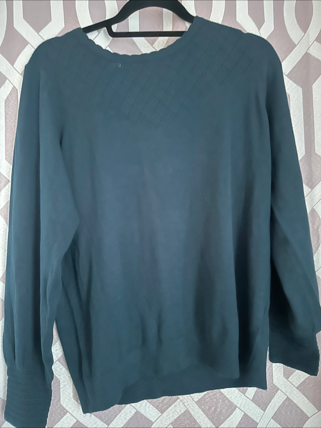 *Like new, only worn once* Women's dark green sweater. Features a unique textured neckline and cuffs. Long sleeves. Soft knit material.