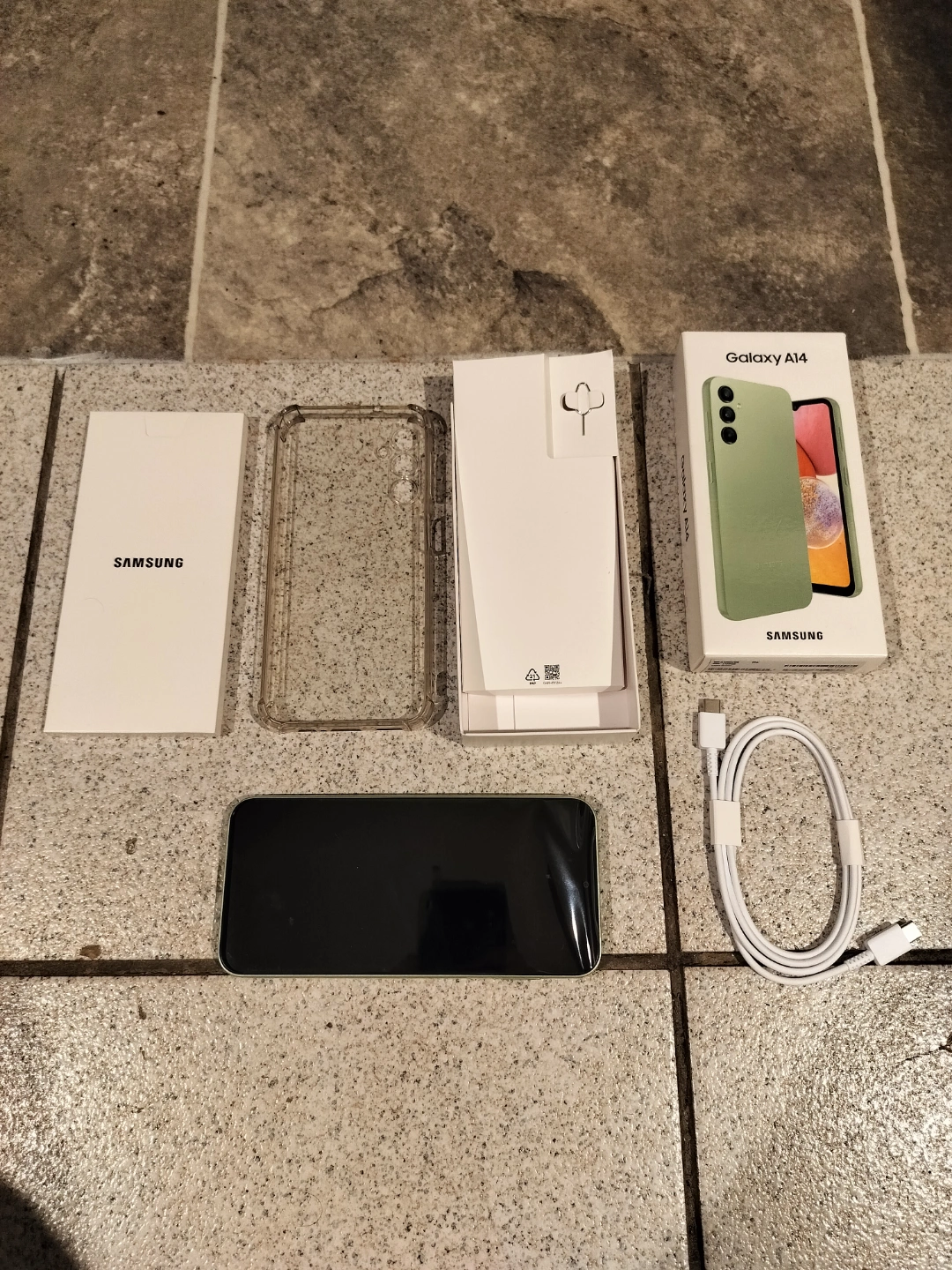 Sansung Galaxy A14 in light green. Includes phone, box, charger, and case. Unlocked and great condition.