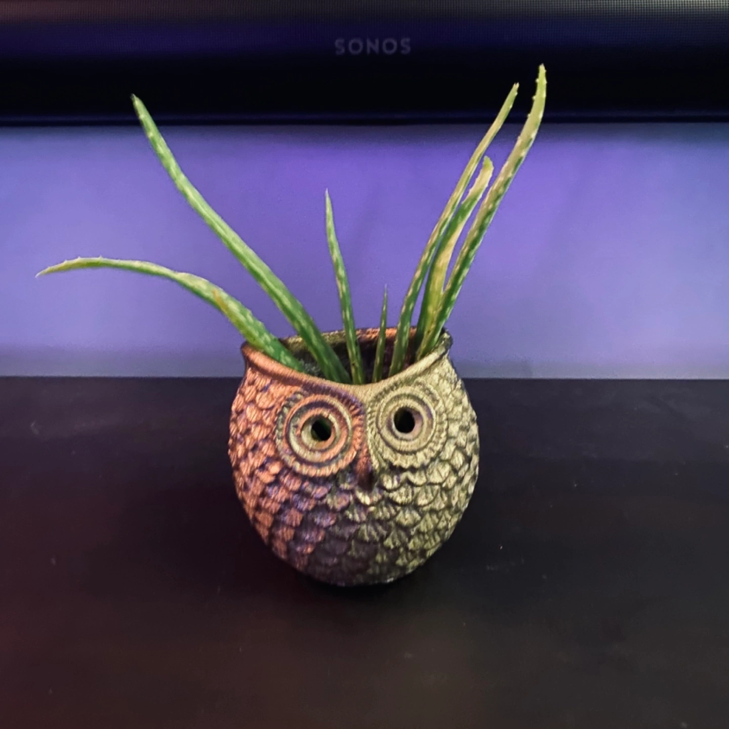 Cute owl-shaped metal planter. Contains a healthy aloe vera plant. Pot is dark golden bronze. Natural aloe vera gel can be squeezed from the leaves to help heal cuts, scrapes, sunburn, and make homemade skin care products!
