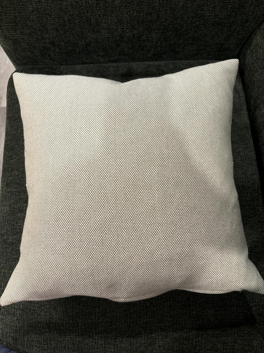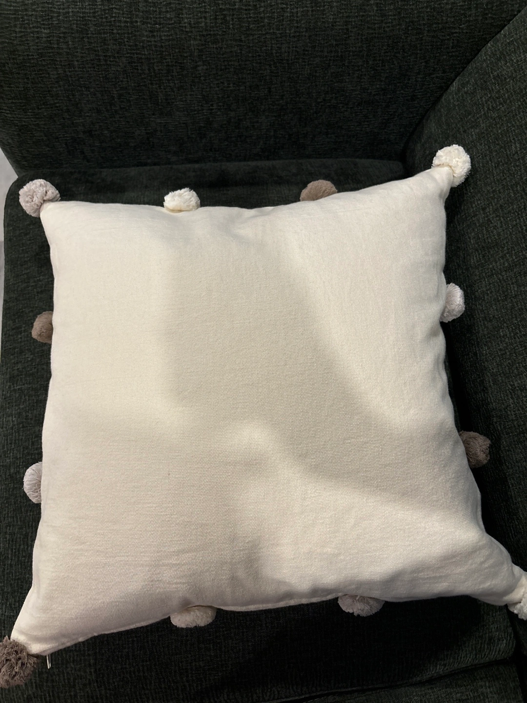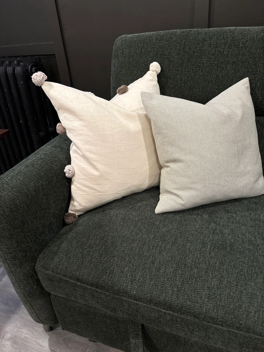 Two IKEA throw pillows. One off-white with pom-poms, one light green. Neutral colours. Perfect for adding a touch of style to your living room.