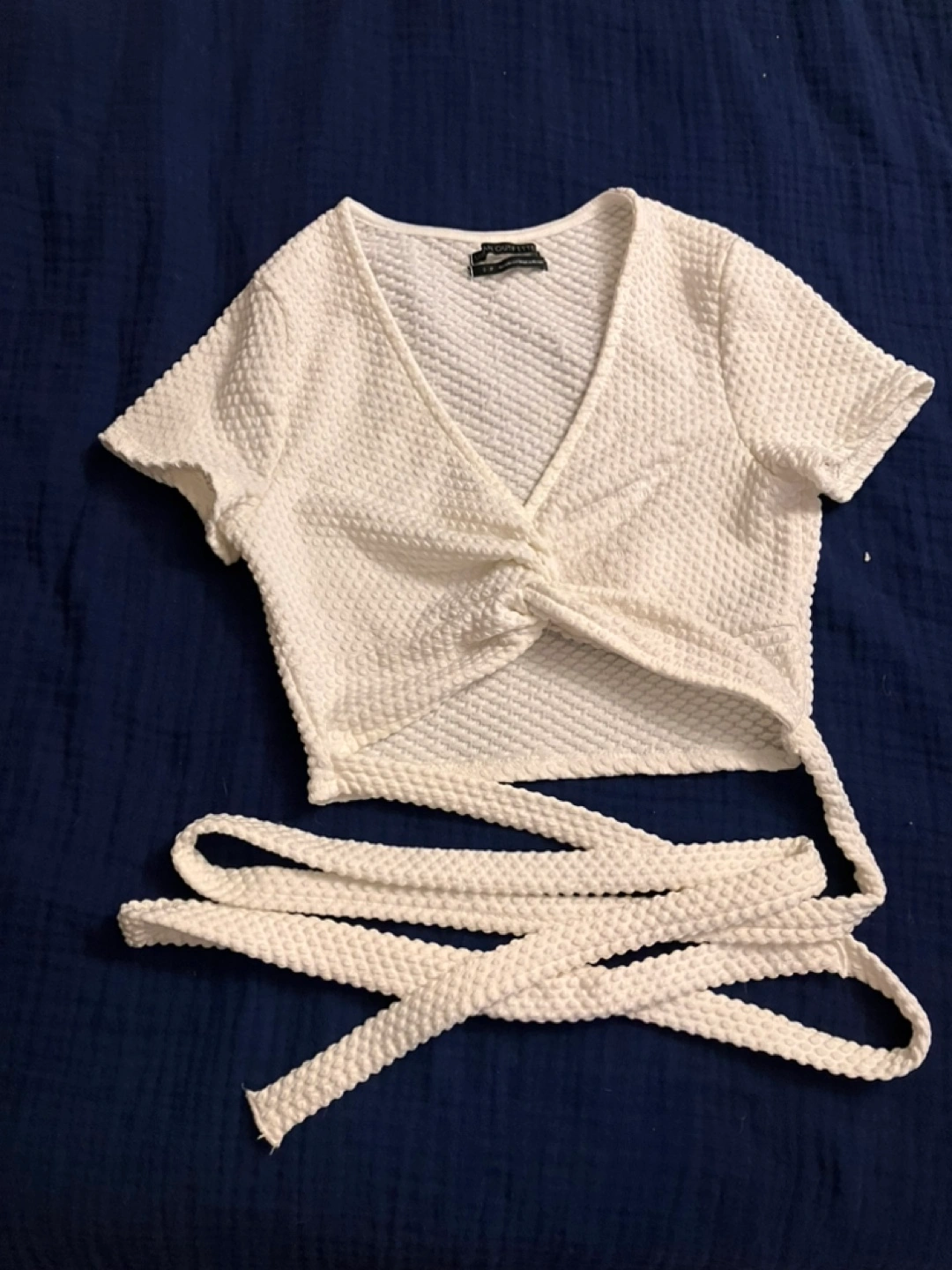 Urban outfitters size small white waffle knit crop top, with ties to wrap around the waist or tie.