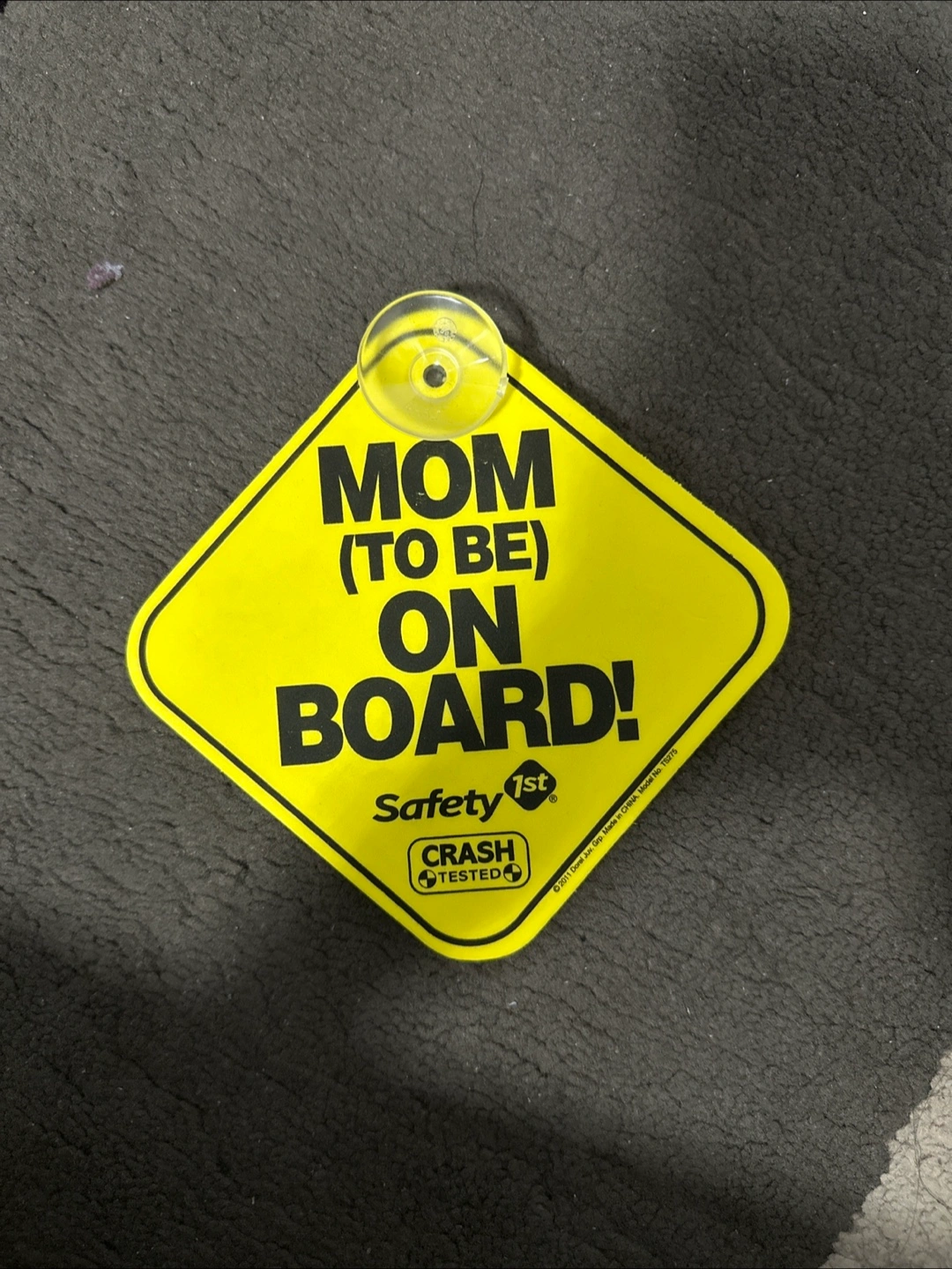 One yellow diamond-shaped car signs. One side says "Baby On Board" and the other side says "Mom (To Be) On Board". Both feature the Safety 1st logo and indicate crash testing. Suction cups for attachment.