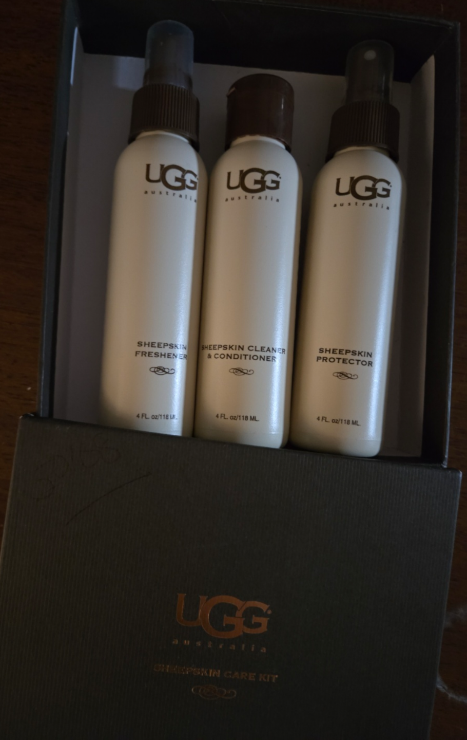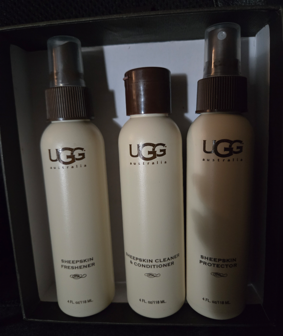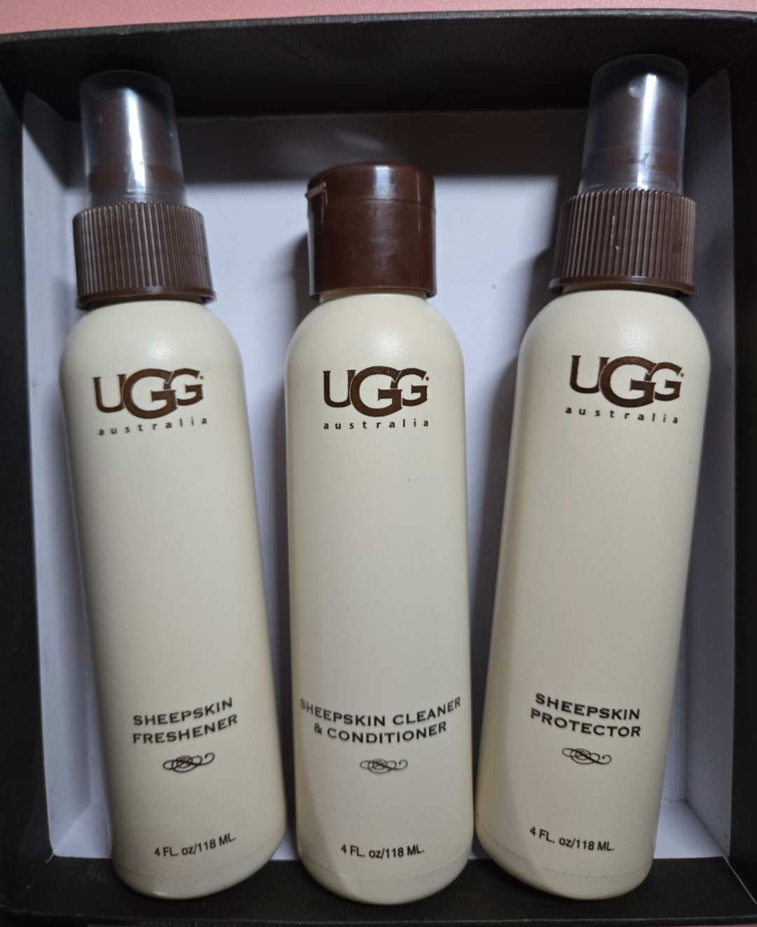 New UGG Australia sheepskin care kit. Includes sheepskin freshener, cleaner & conditioner, and protector. Four ounce bottles. Perfect for keeping your UGGs looking their best.