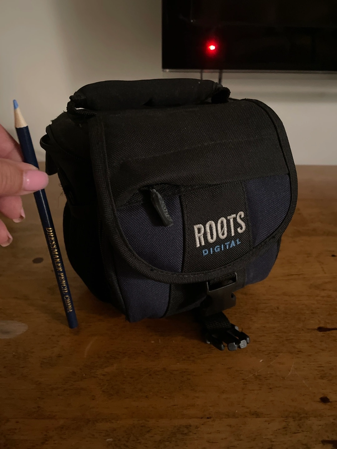 Small camera carrying case. Black and dark blue nylon. Zipper closure. Interior pockets and dividers. Adjustable strap.