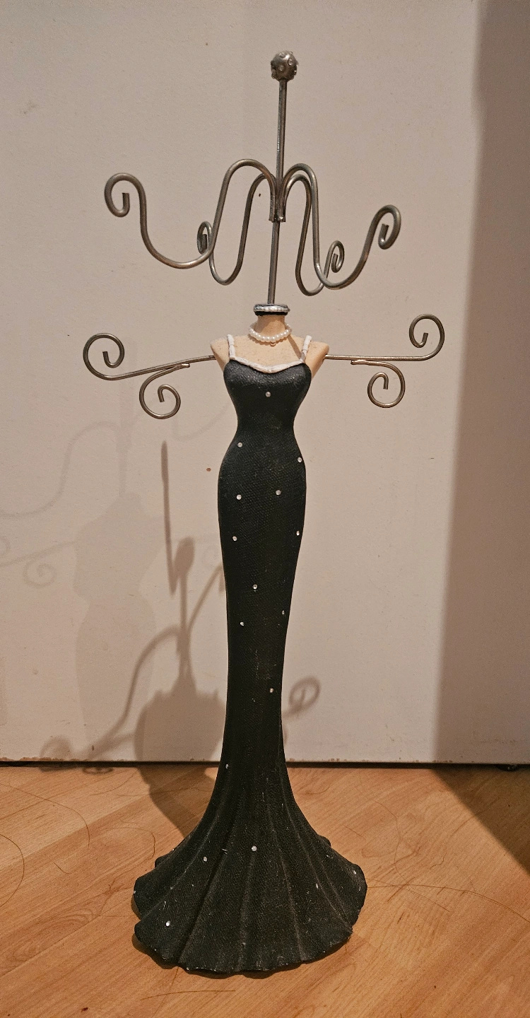 Stylish jewellery holder. Features a black dress figurine with metal hooks for earrings, necklaces and bracelets. Perfect for organizing your accessories.