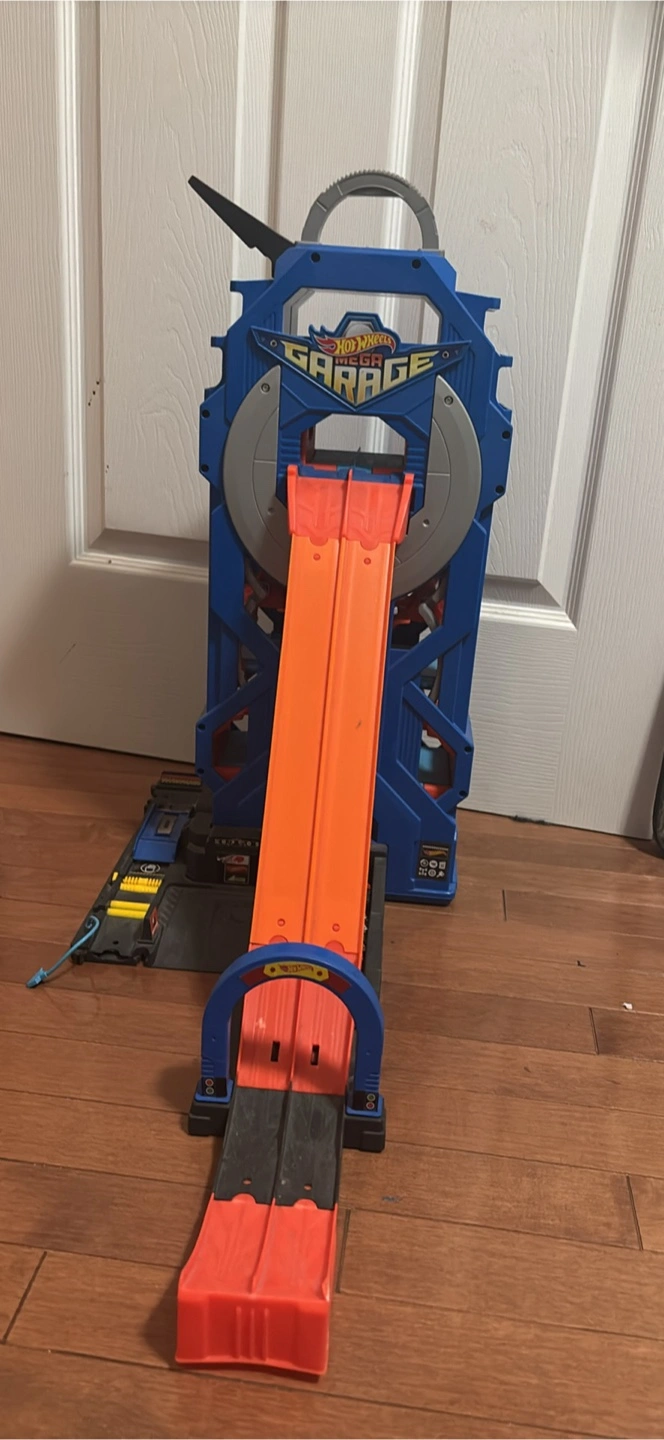 Hot Wheels Mega Garage playset. Features two racing lanes, a lift, and multiple levels. Includes extra track pieces. Great for imaginative play.
