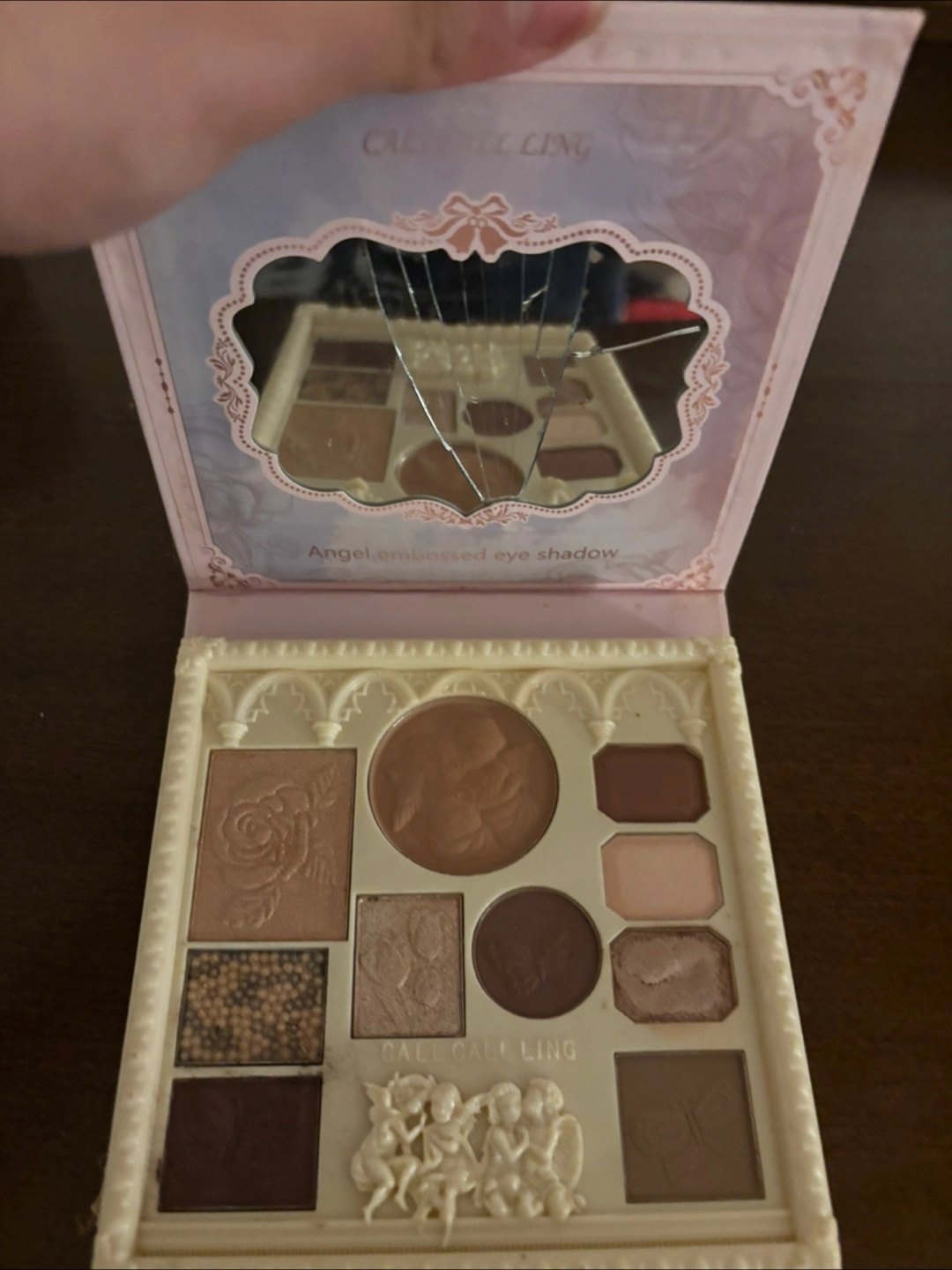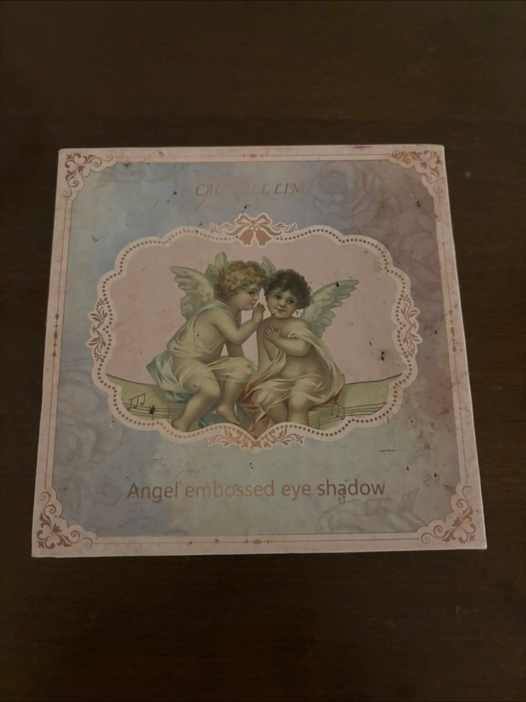Pre-owned eyeshadow palette. Beautiful angel design. Some damage to the compact. Several shades included.