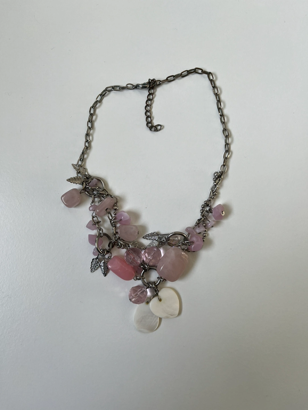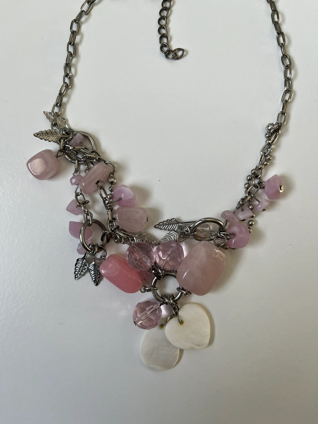Silver necklace featuring pink stone pieces and an ivory heart. Beautiful and hardly worn as I never reach for it. Hoping it can go to a new home!