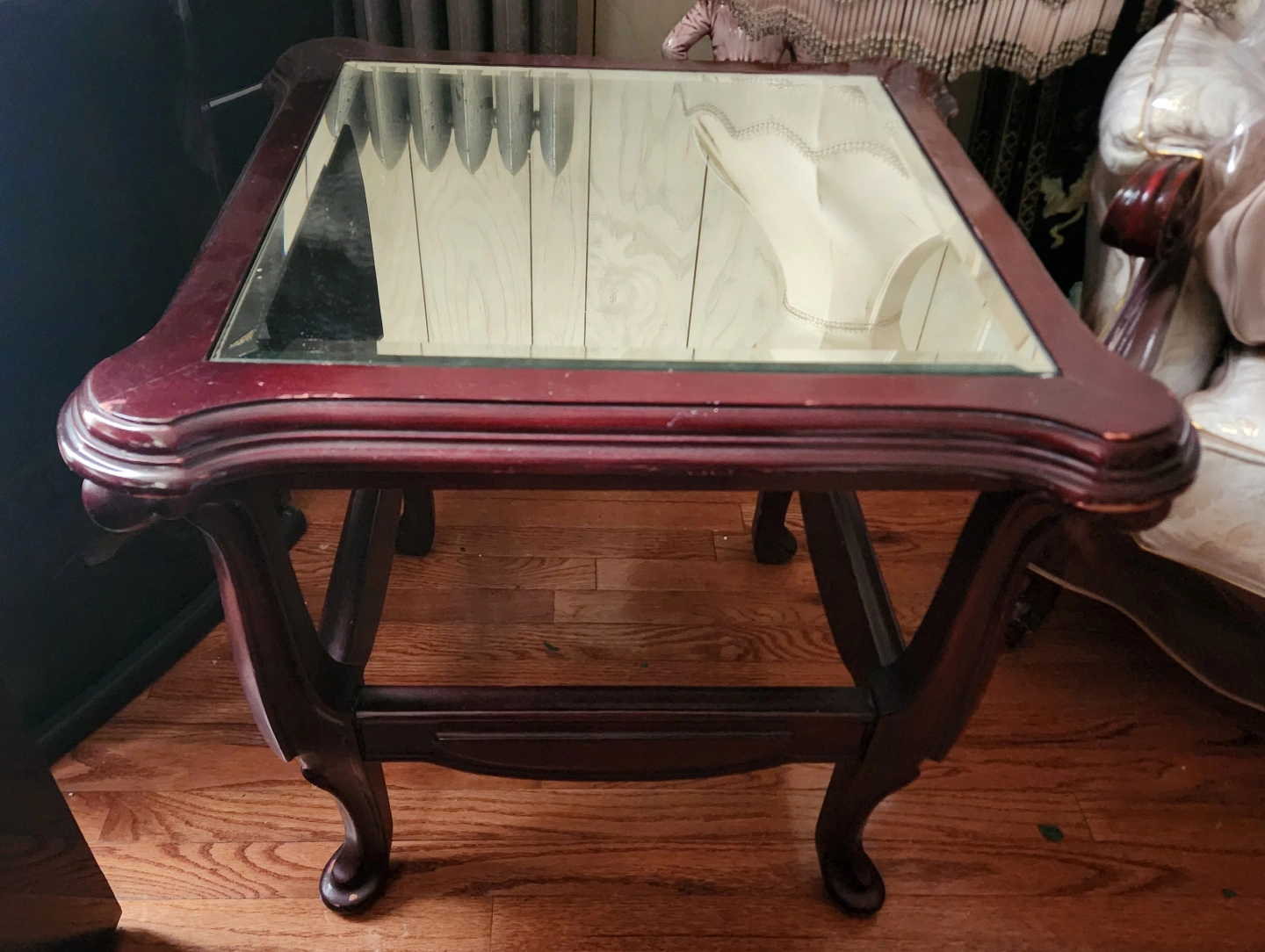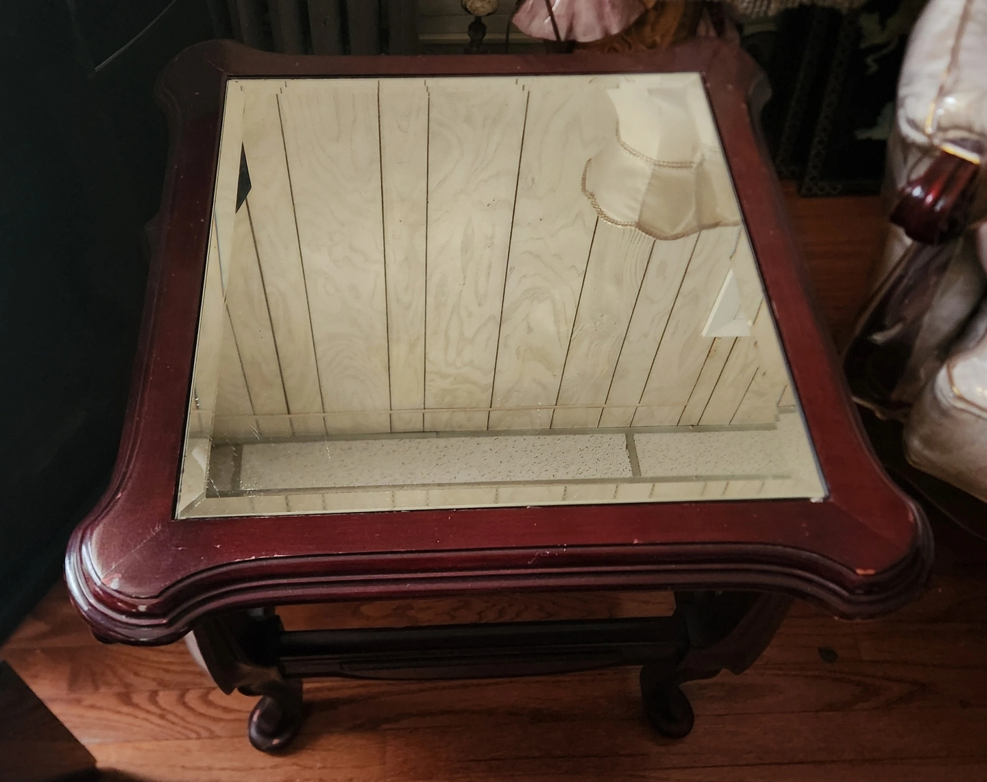 Small end table. Dark wood frame. Mirrored top. Simple design. Slight wear visible.