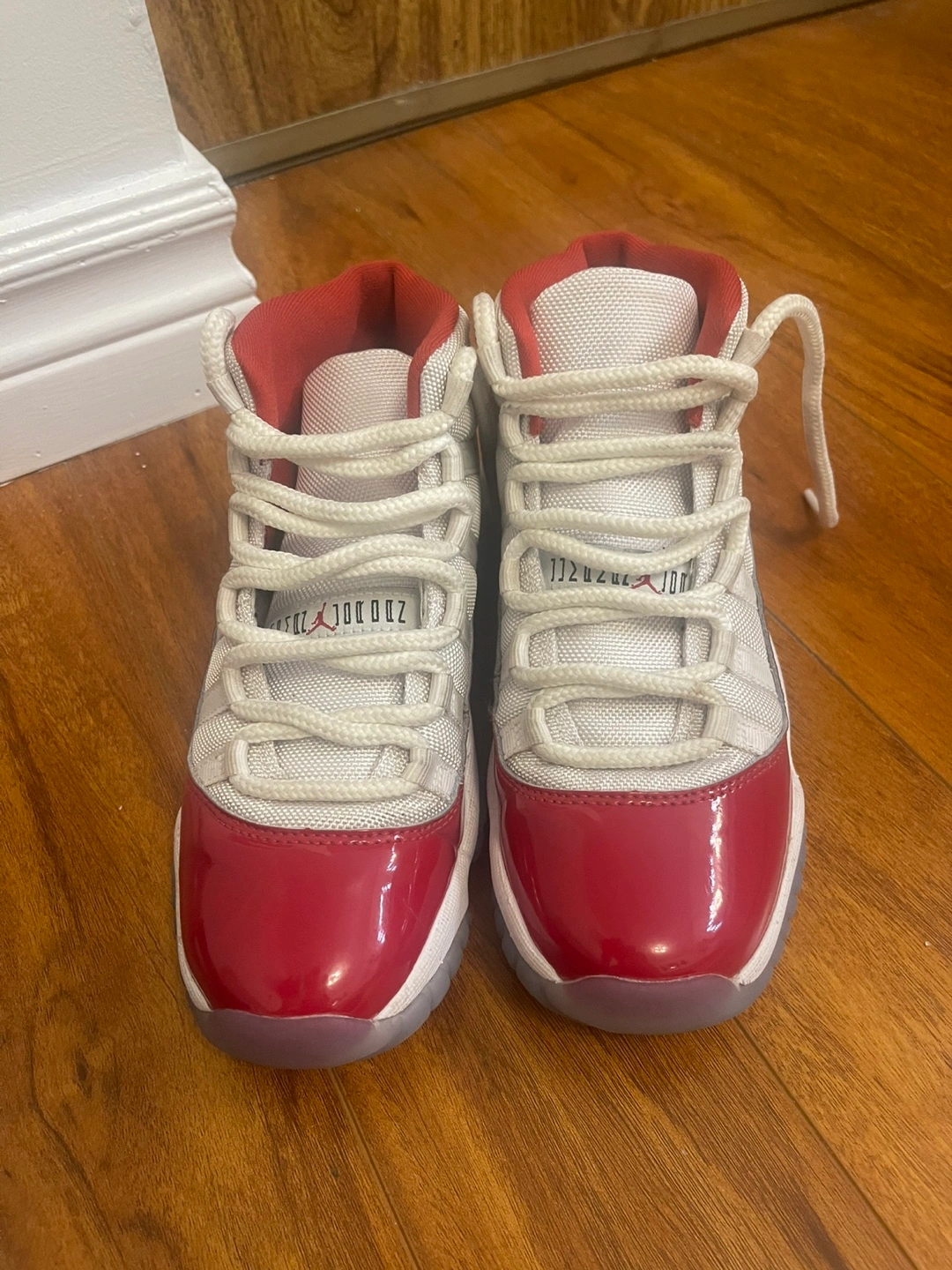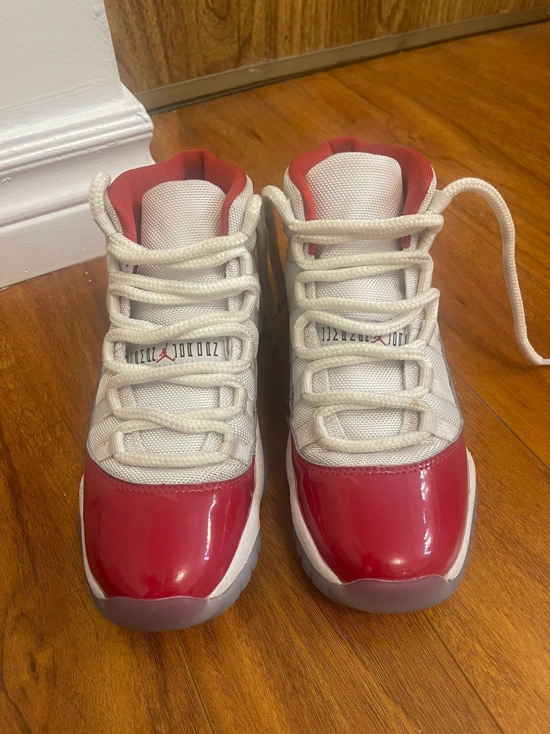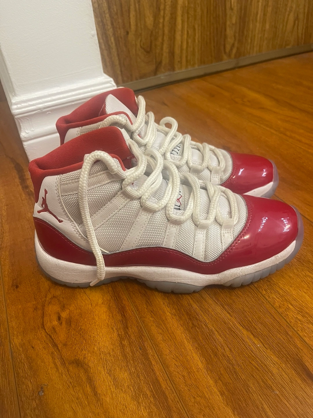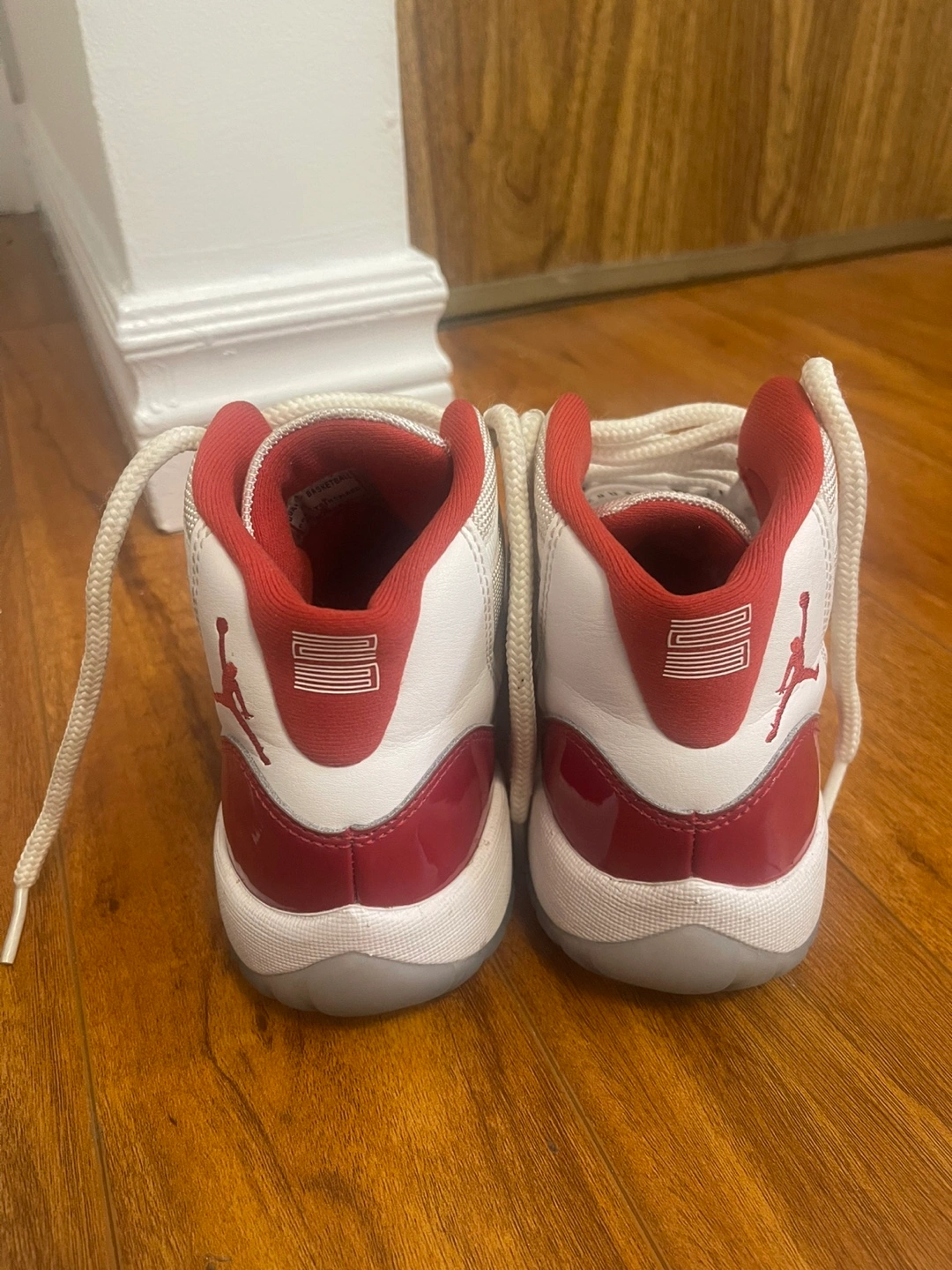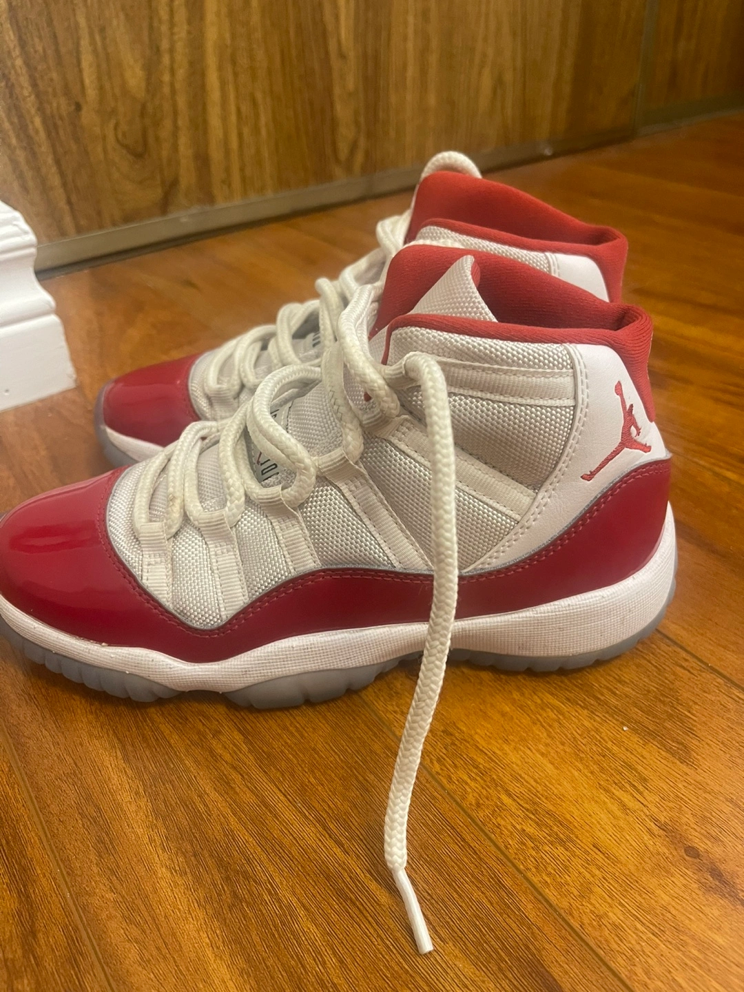 15Girls' Grade School Air Jordan 11 Retro. White and Gym Red colourway. Patent leather accents. Classic design.