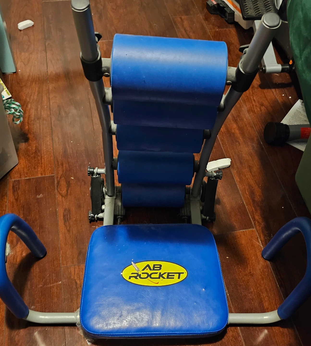 Used AB Rocket ab roller. Good condition. Blue and grey colours. Three roller wheels. Arm supports. Comfortable padded seat.