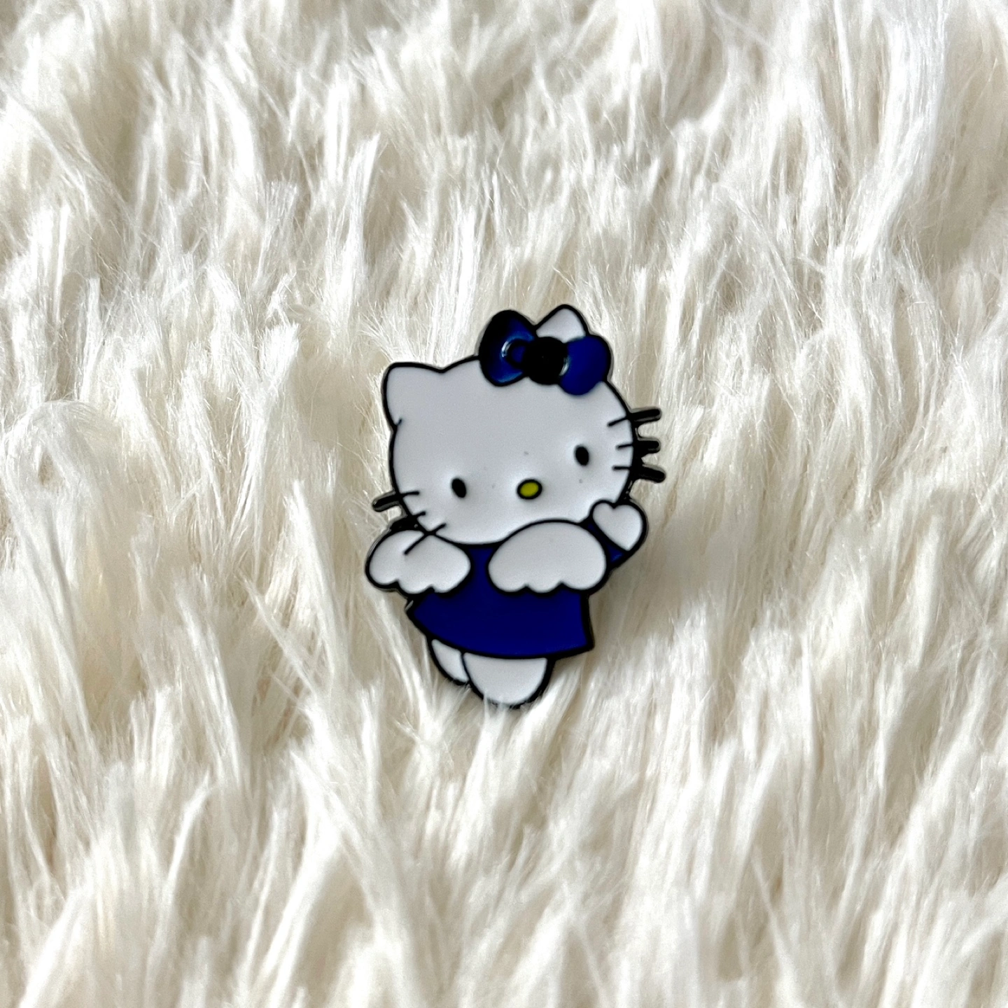 Adorable Hello Kitty enamel pin. Features Hello Kitty in a blue dress. Perfect for bags, jackets, or hats. Collectible item.