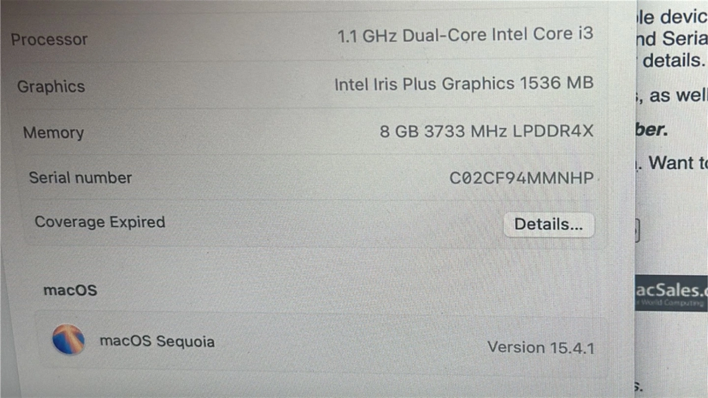 10Used MacBook Air. Silver colour. 13-inch screen. 8 GB memory. 1.1 GHz Dual-Core Intel Core i3 processor. Intel Iris Plus Graphics 1536 MB. macOS Sequoia Version 15.4.1. Serial number available upon request.