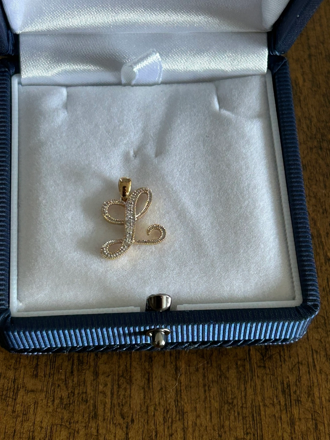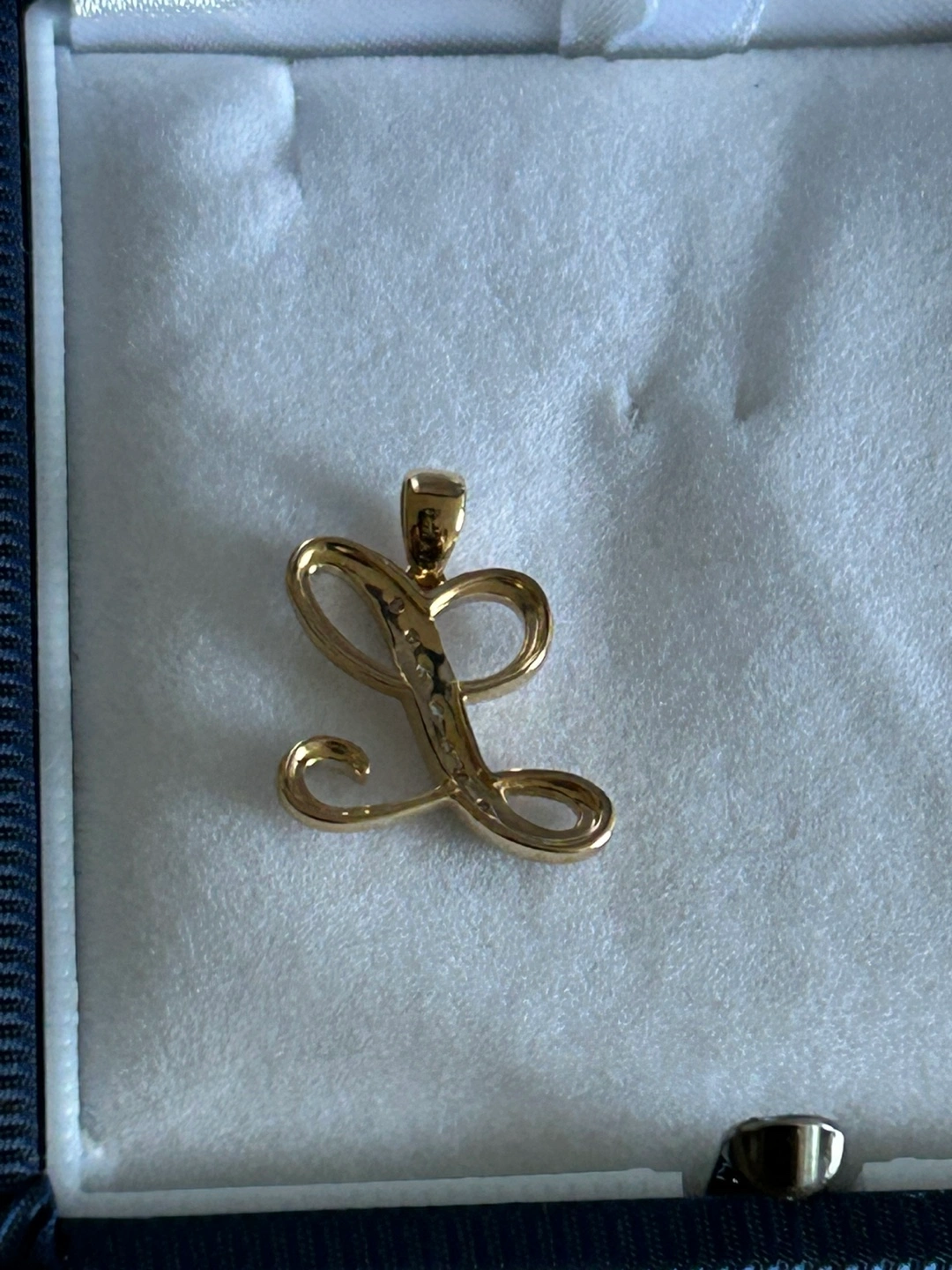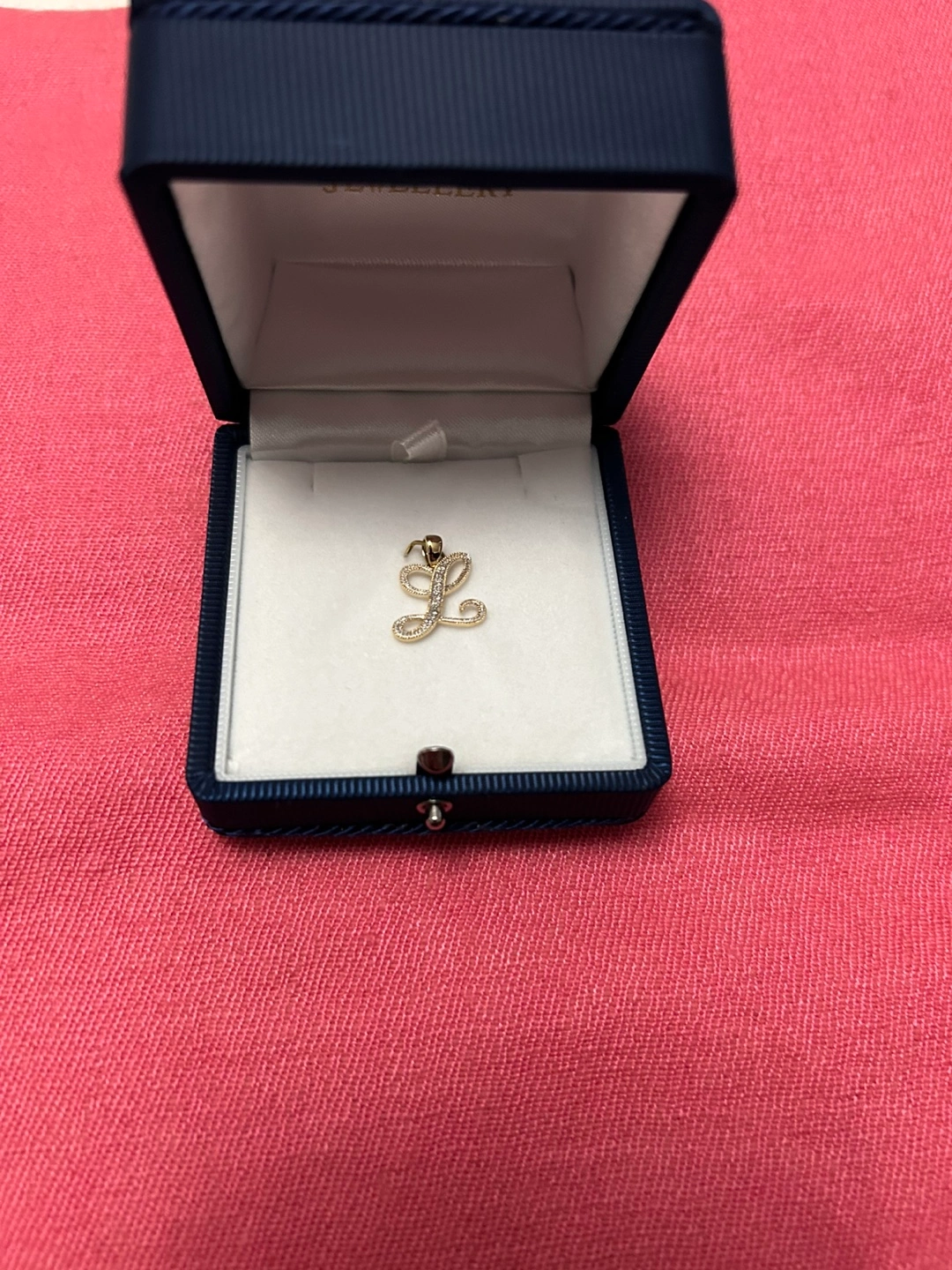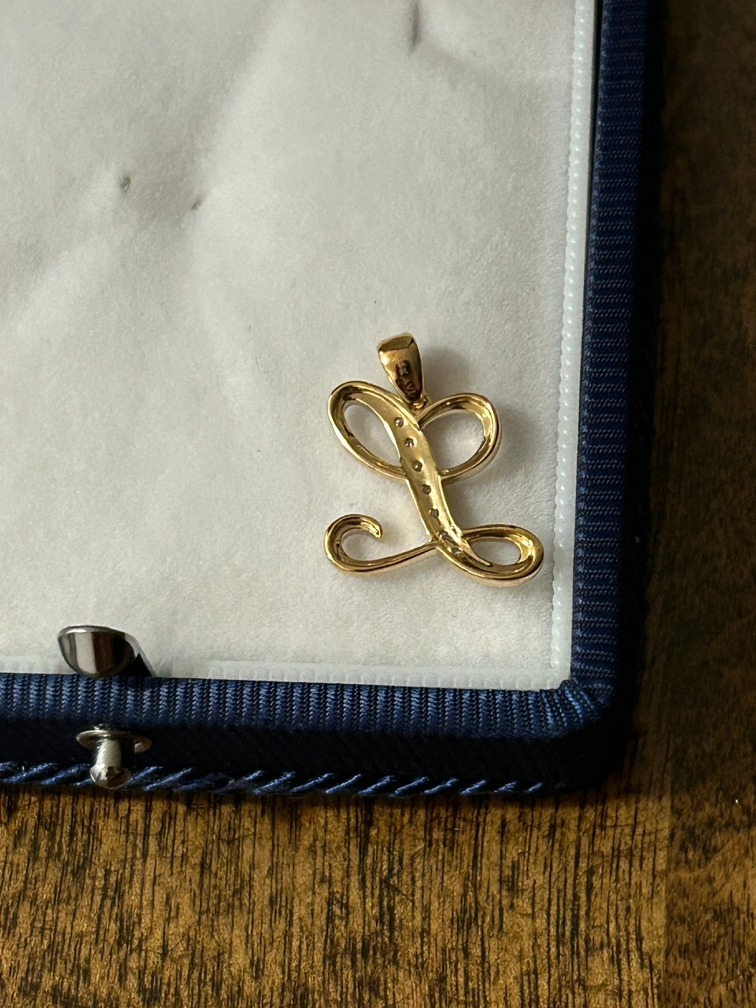 Lovely gold initial L pendant. Features small diamonds. Comes in a nice box. 14k gold.