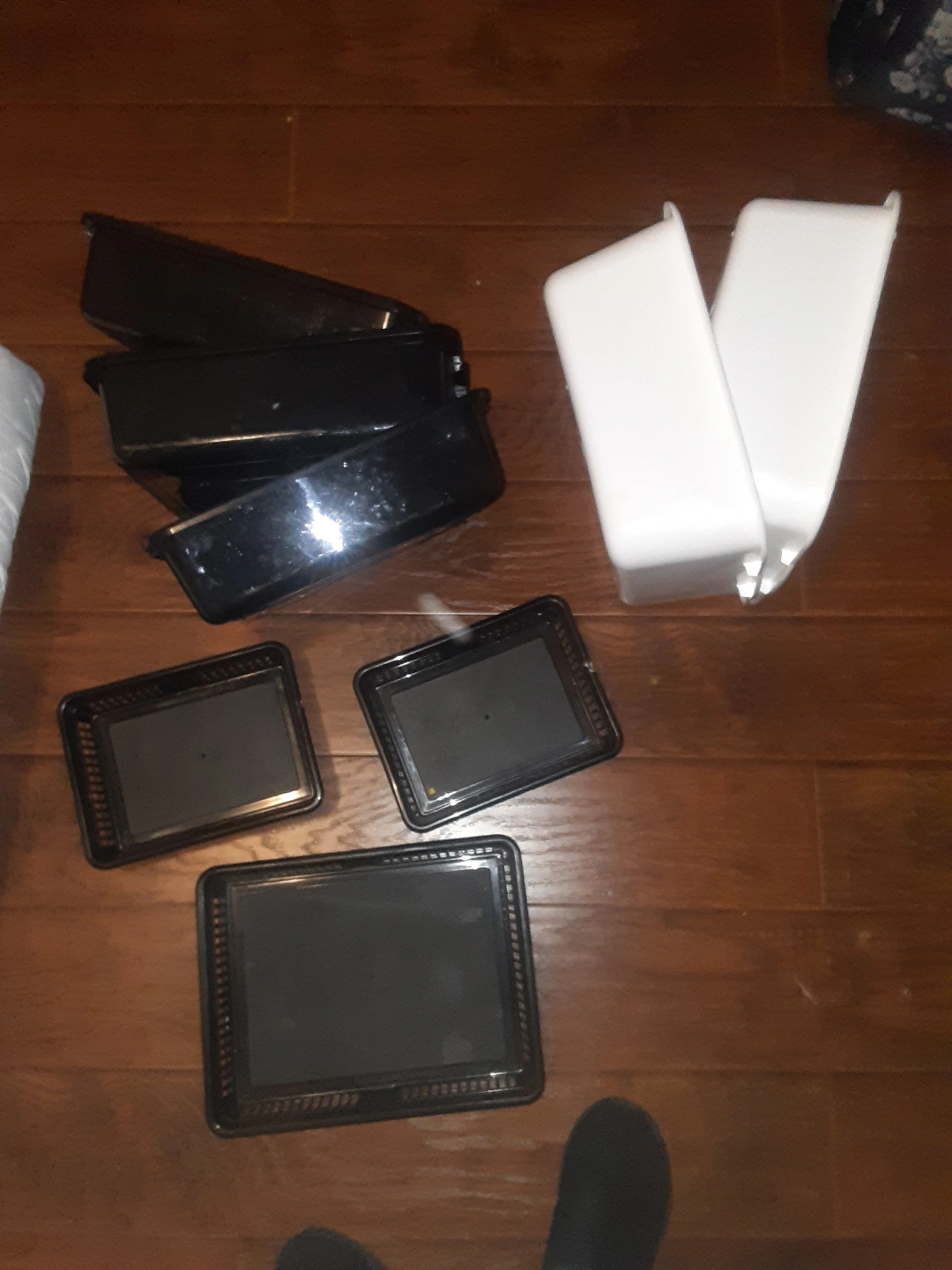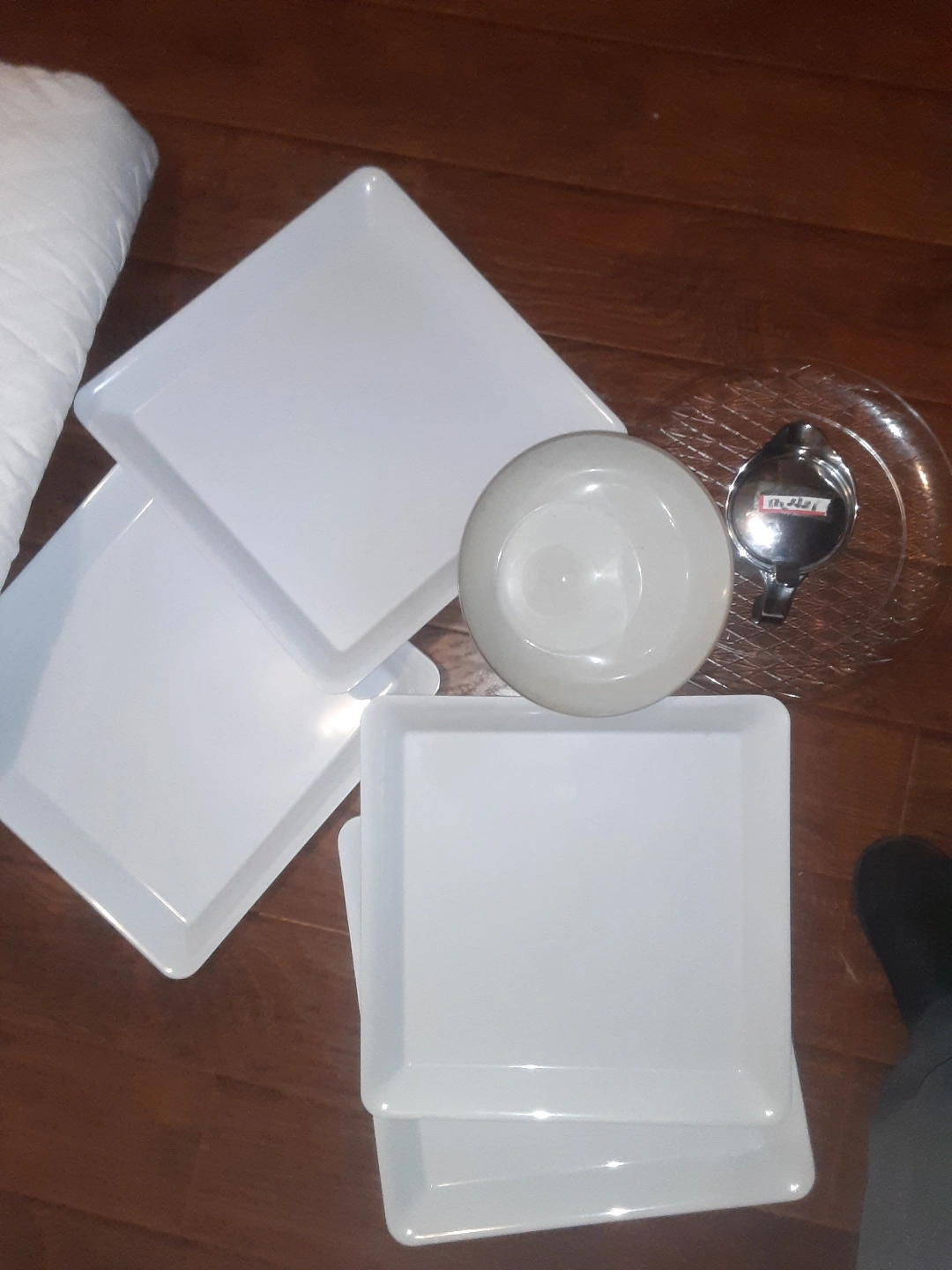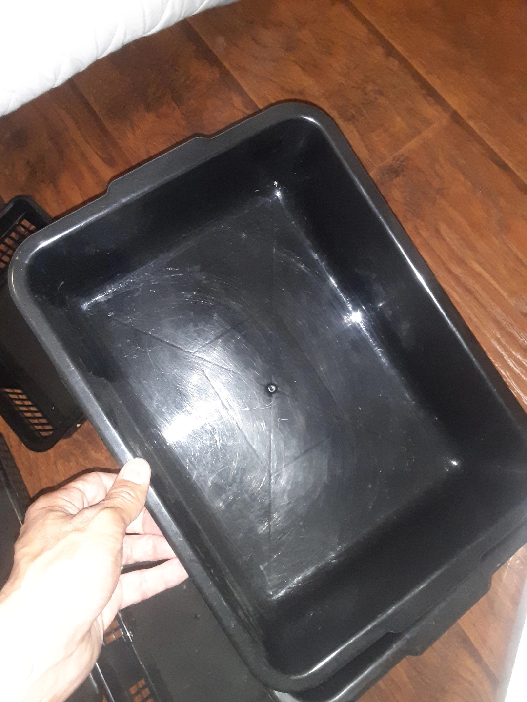Assortment of kitchen items. Includes multiple white plastic serving trays, a stainless steel creamer, and black plastic storage containers. Various sizes and shapes. Pre-owned, minor wear.