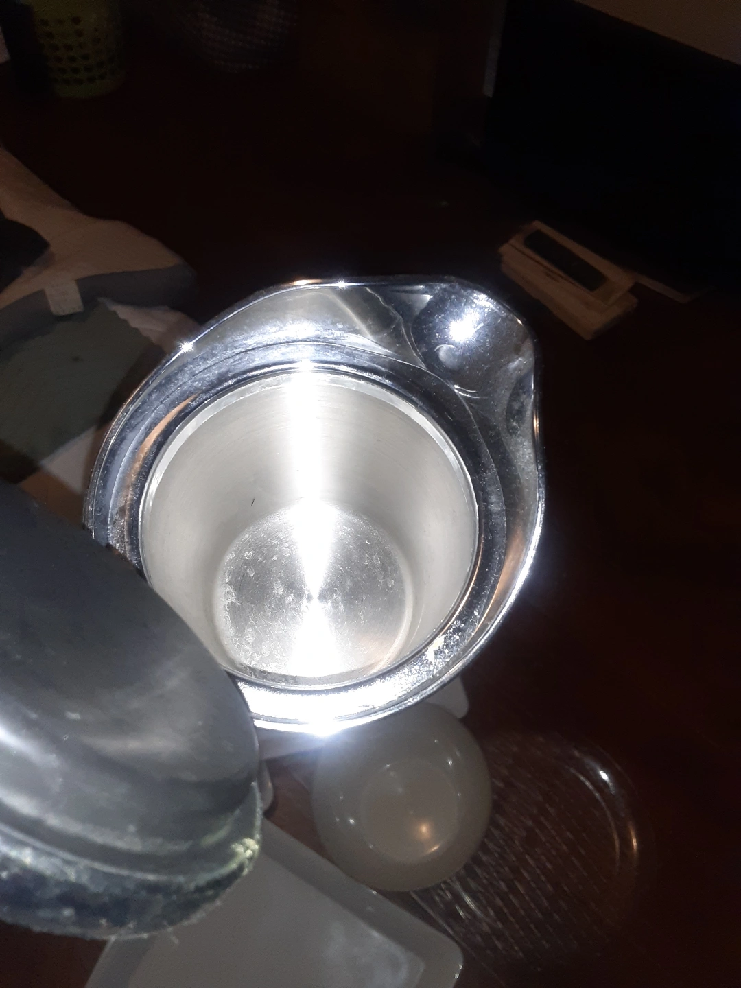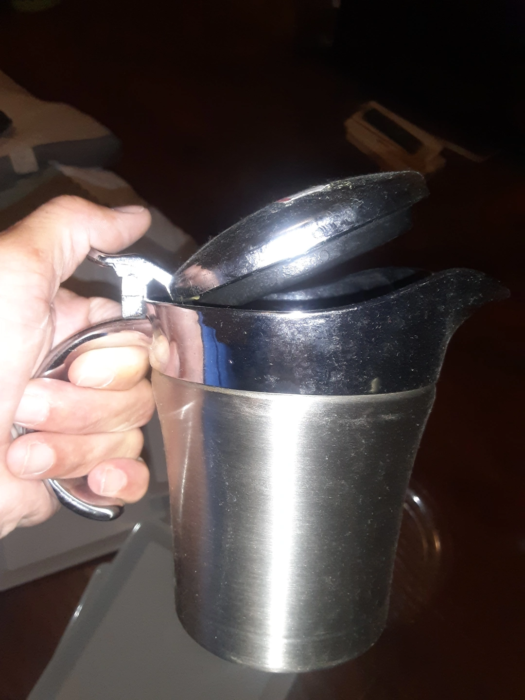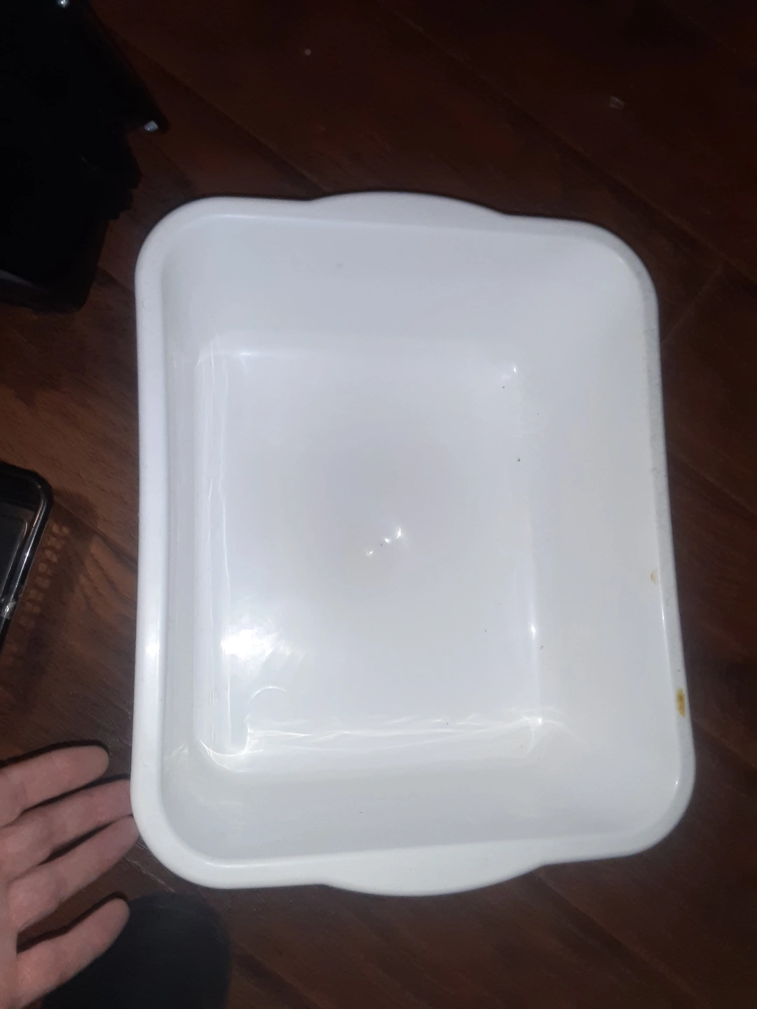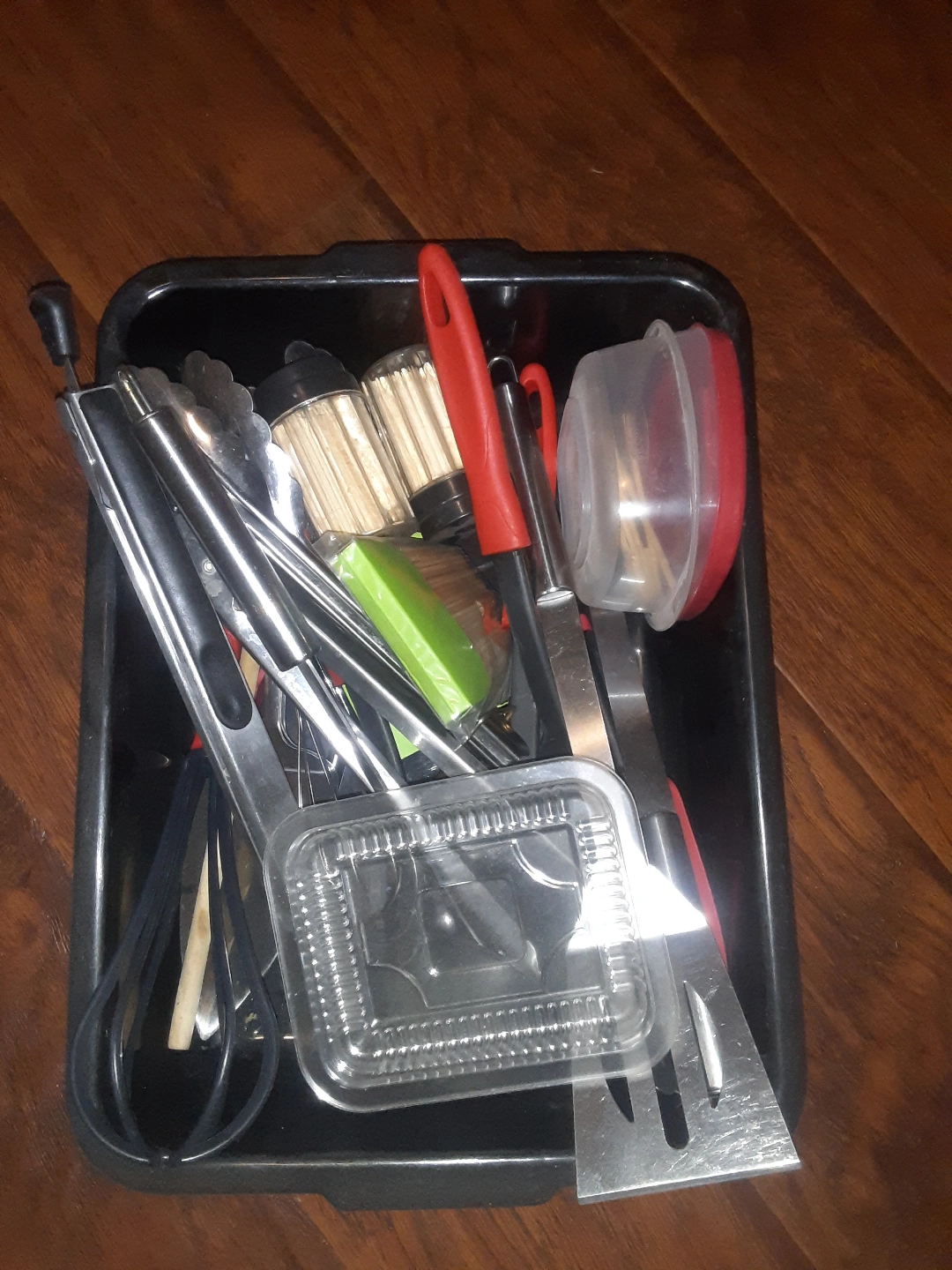 Assortment of kitchen items. Includes multiple white plastic serving trays, a stainless steel creamer, and black plastic storage containers. Various sizes and shapes. Pre-owned, minor wear.
