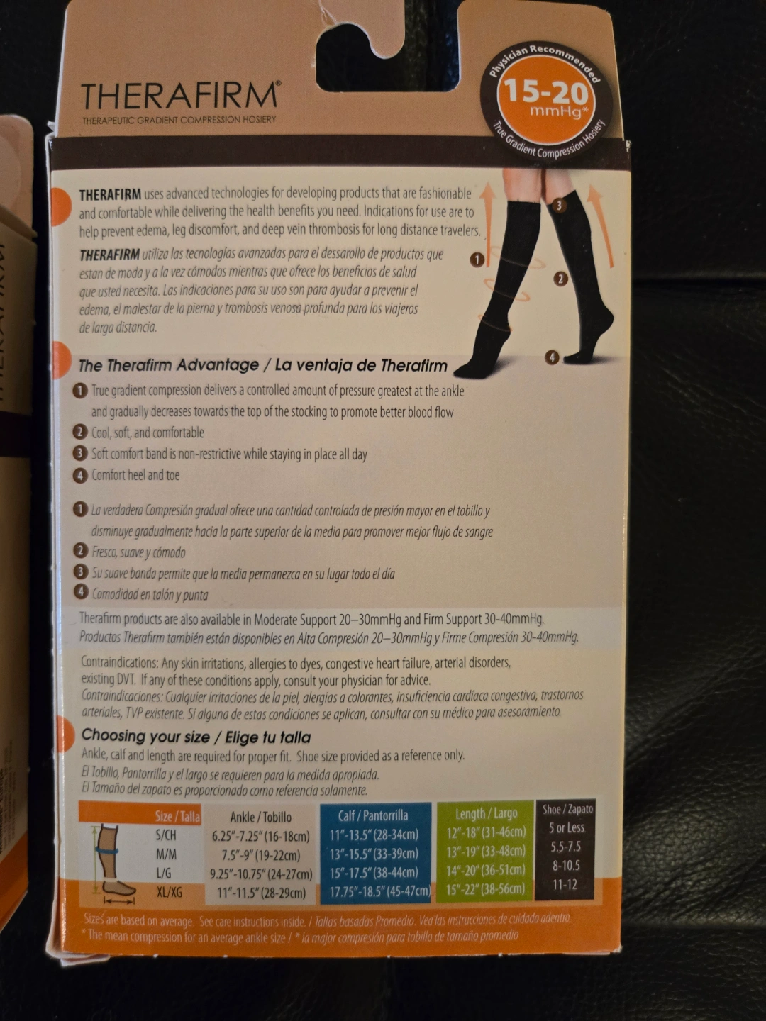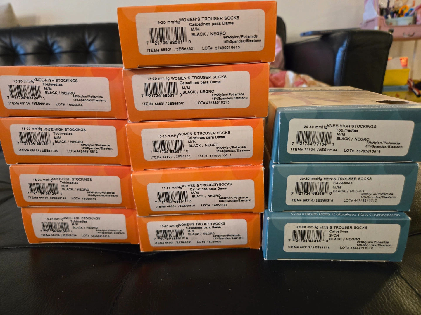 Bulk lot of THERAFIRM compression socks. Various sizes and styles available, including men's and women's options. Moderate and firm compression levels. New in box.