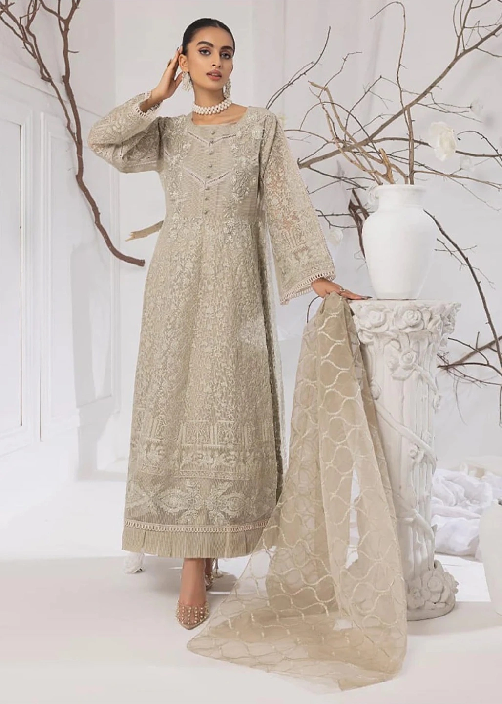 Beautiful Pakistani embroidered maxi dress. Light beige colour. Features long sleeves and a matching dupatta. Delicate embroidery throughout. Perfect for special occasions.