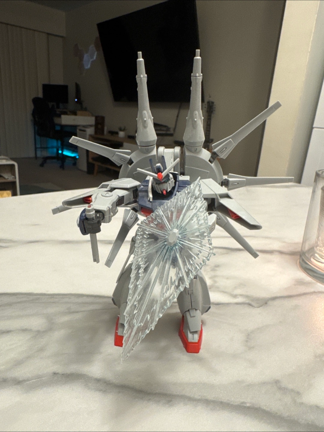 Assembled plastic model kit. Features detailed articulation and weaponry. Includes a large clear shield.