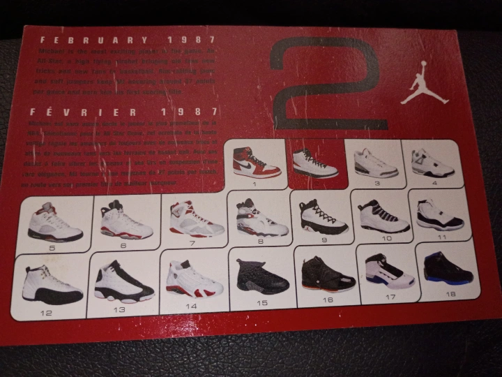 Collectible postcard featuring Air Jordan II imagery. Shows various Air Jordan models. February 1987 date. Great for sneakerheads or collectors.