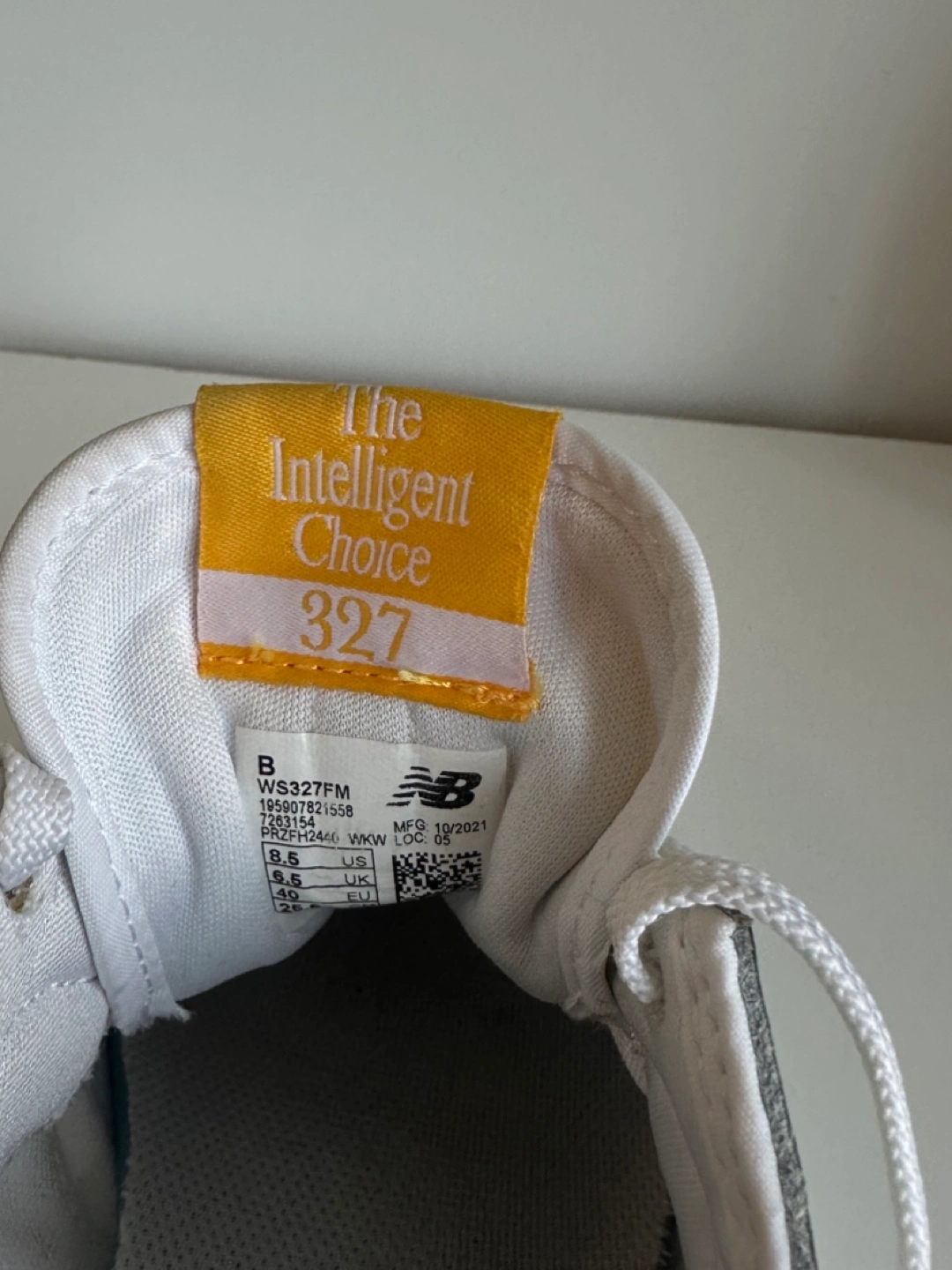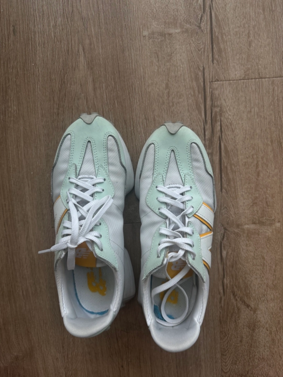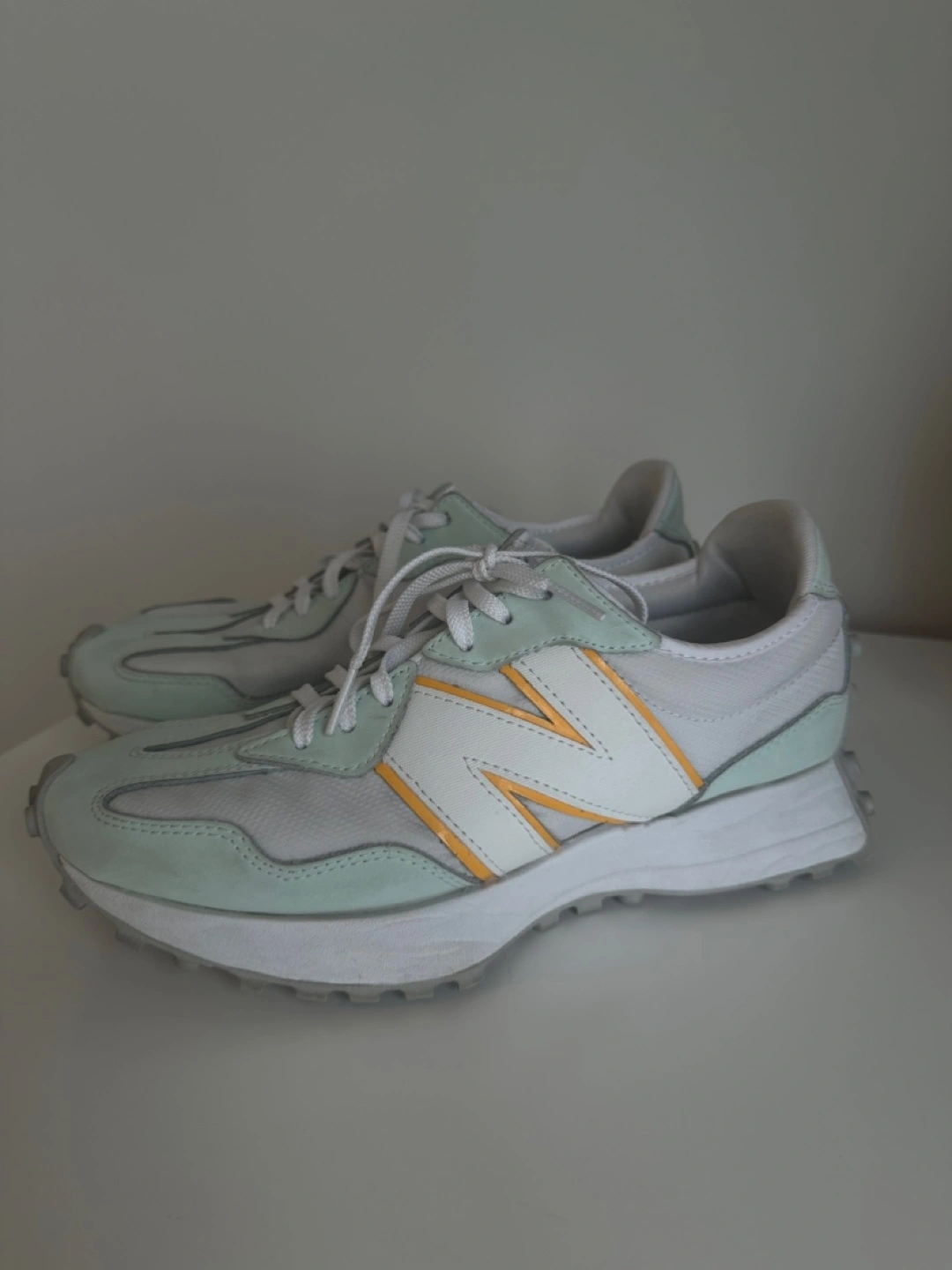 Women's New Balance 327 sneakers. Size 8.5 US. Mint green and white colourway. Slight yellow accents.