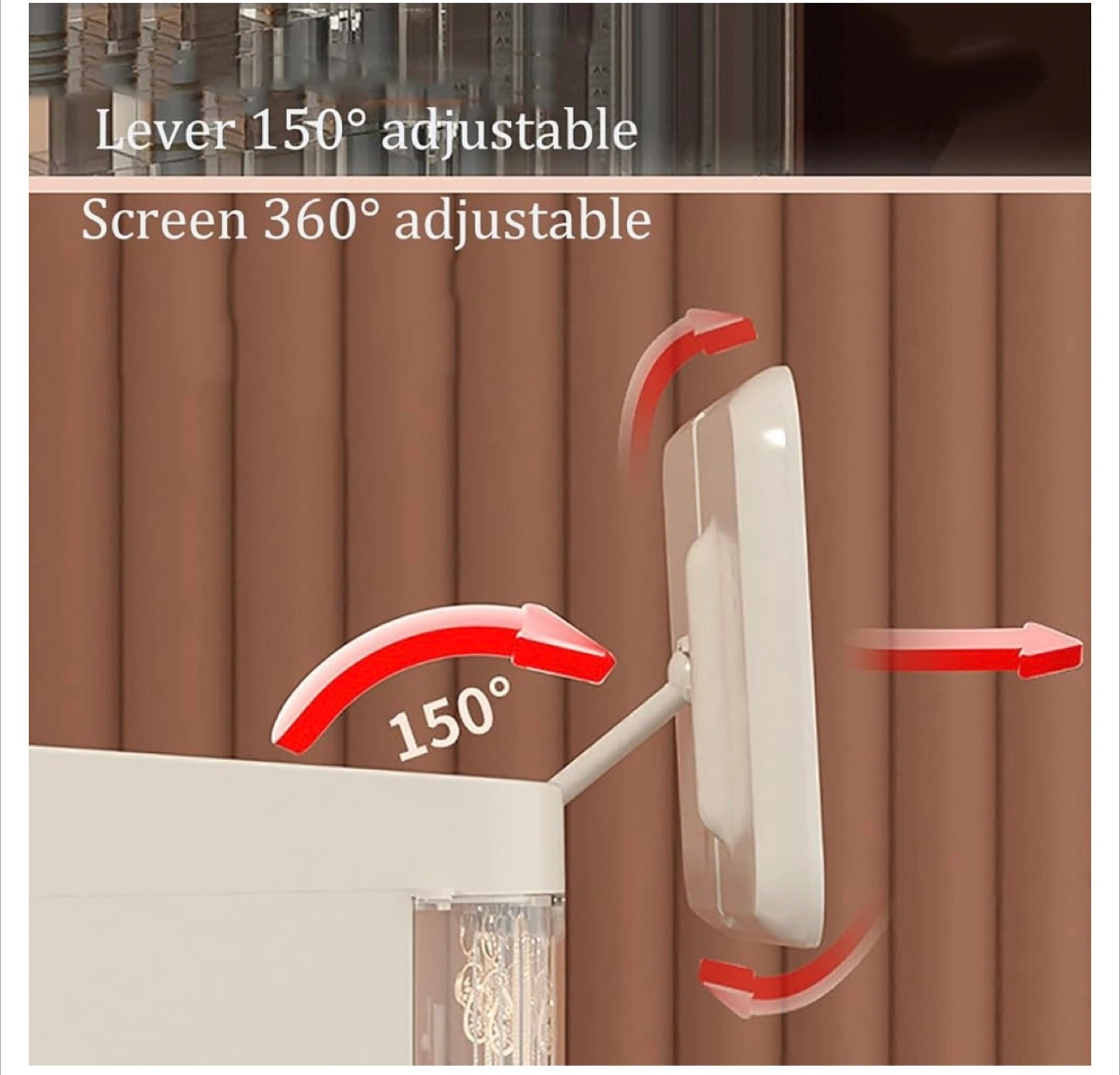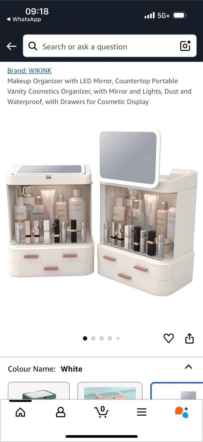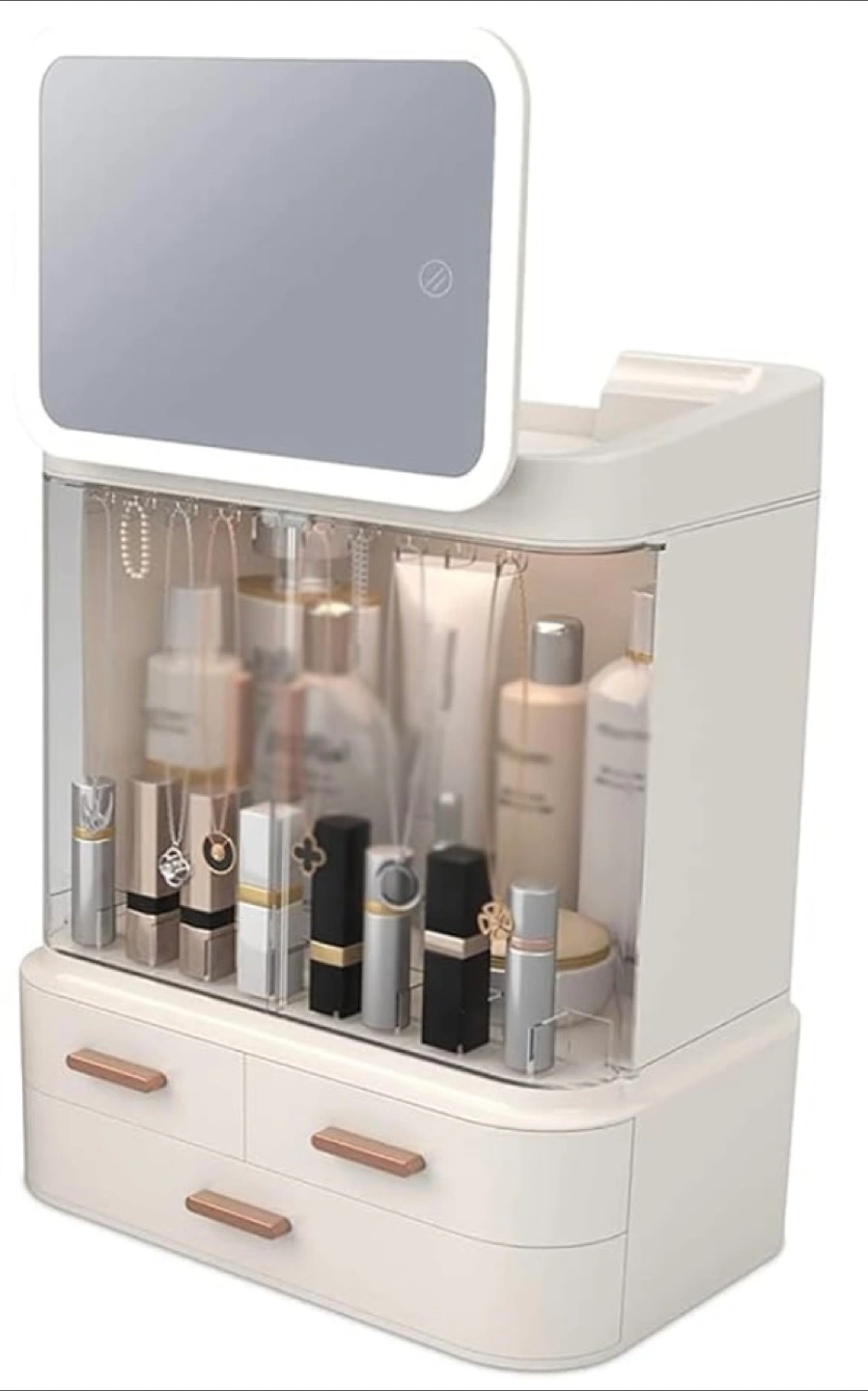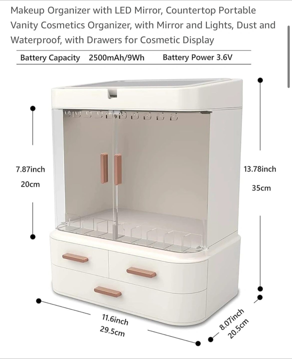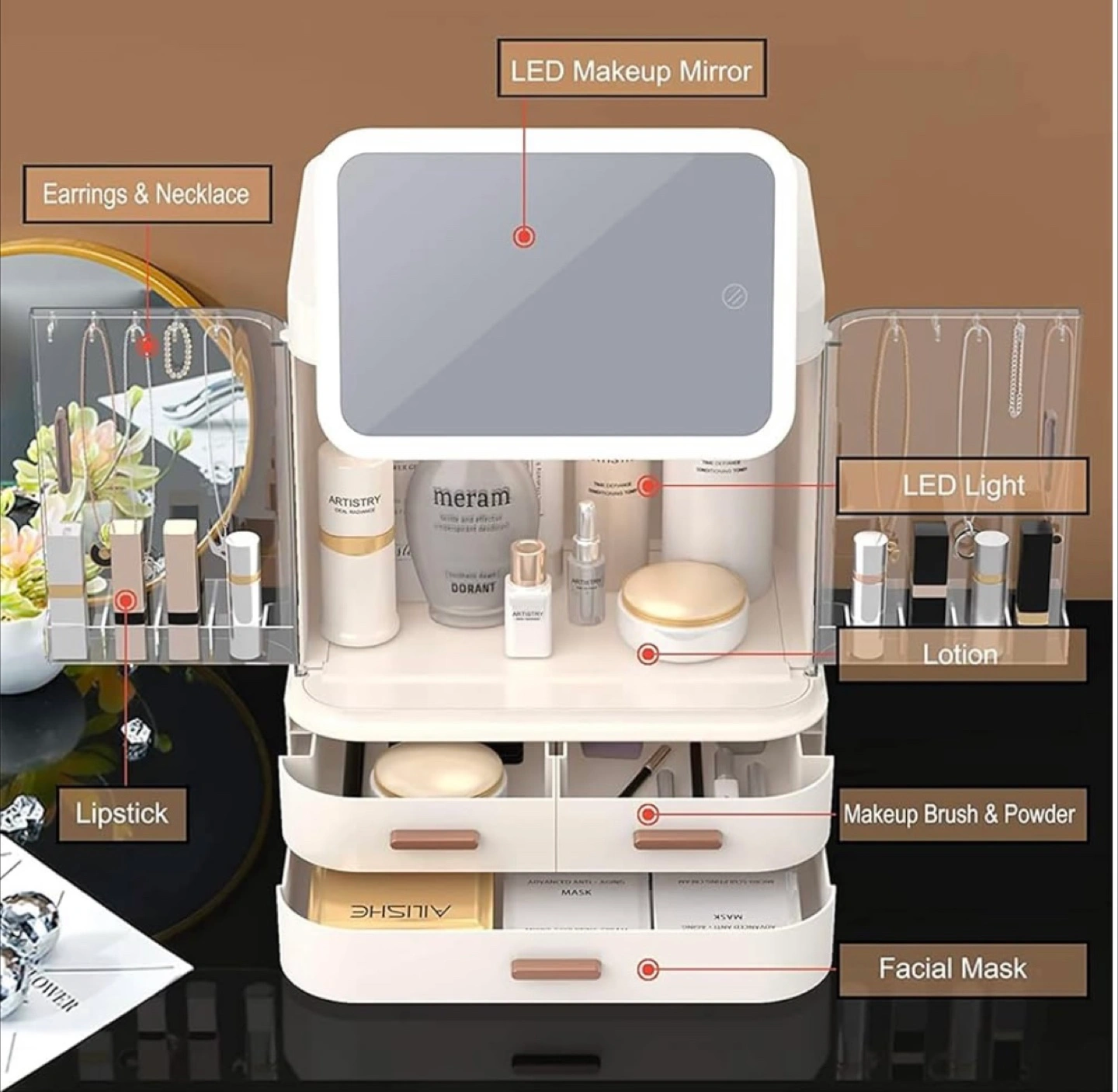 Like new: Countertop vanity organizer. Features LED mirror, lights, drawers, and is dust and waterproof. Adjustable mirror. Holds makeup, jewellery, and other cosmetics.