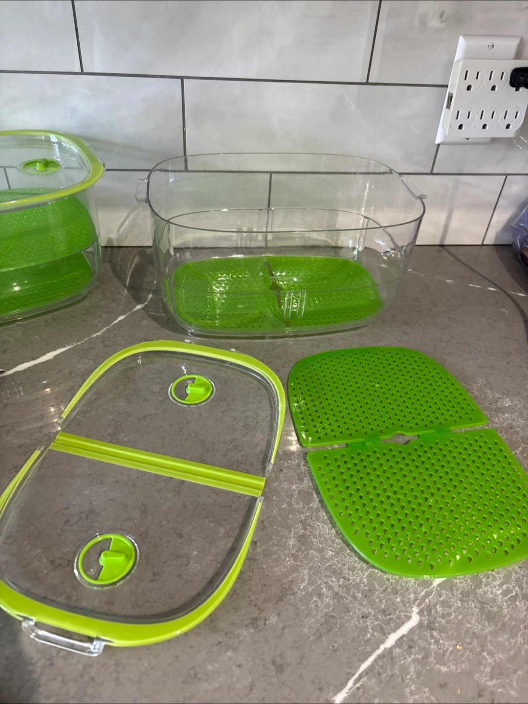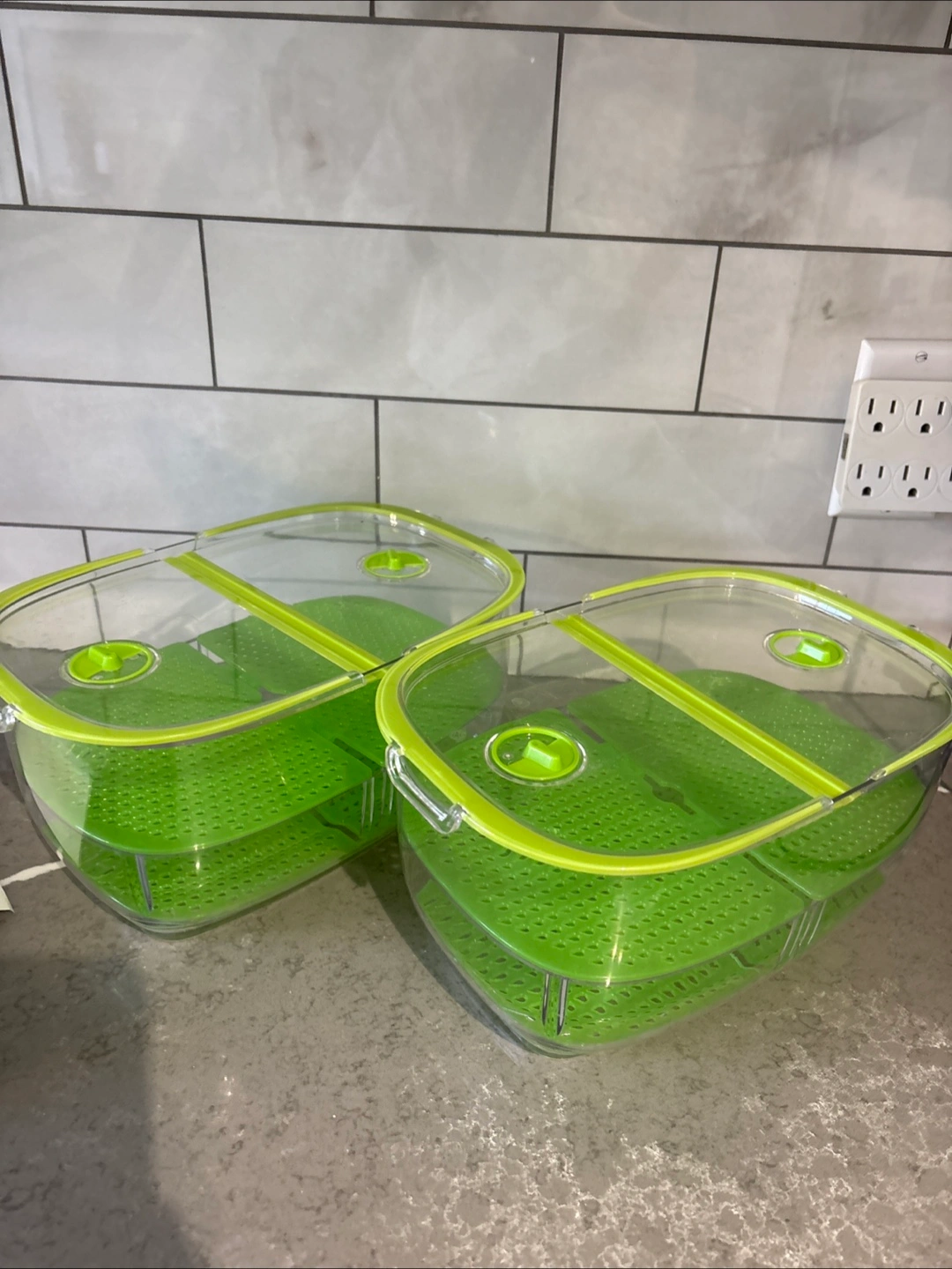 2 NEW large clear 4.7 quart plastic containers with lime green lids and 2 inserts, adjustable air vents on lid, drainer compartment inside. Perfect for storing produce⦠$5 each or 2/$8ā¦pick up on Chandos Drive in Chicopee area of South Kitchener N2A4H8