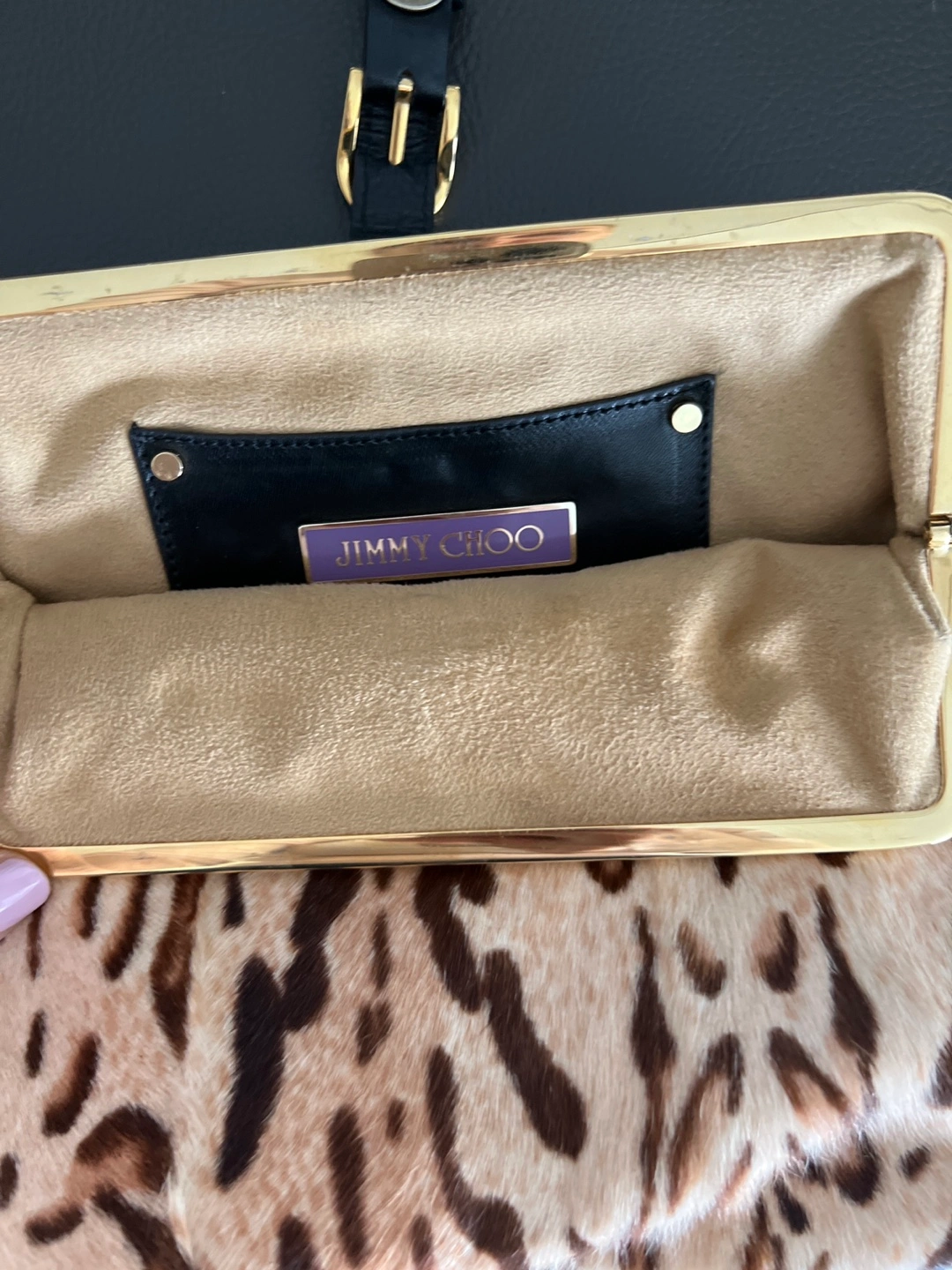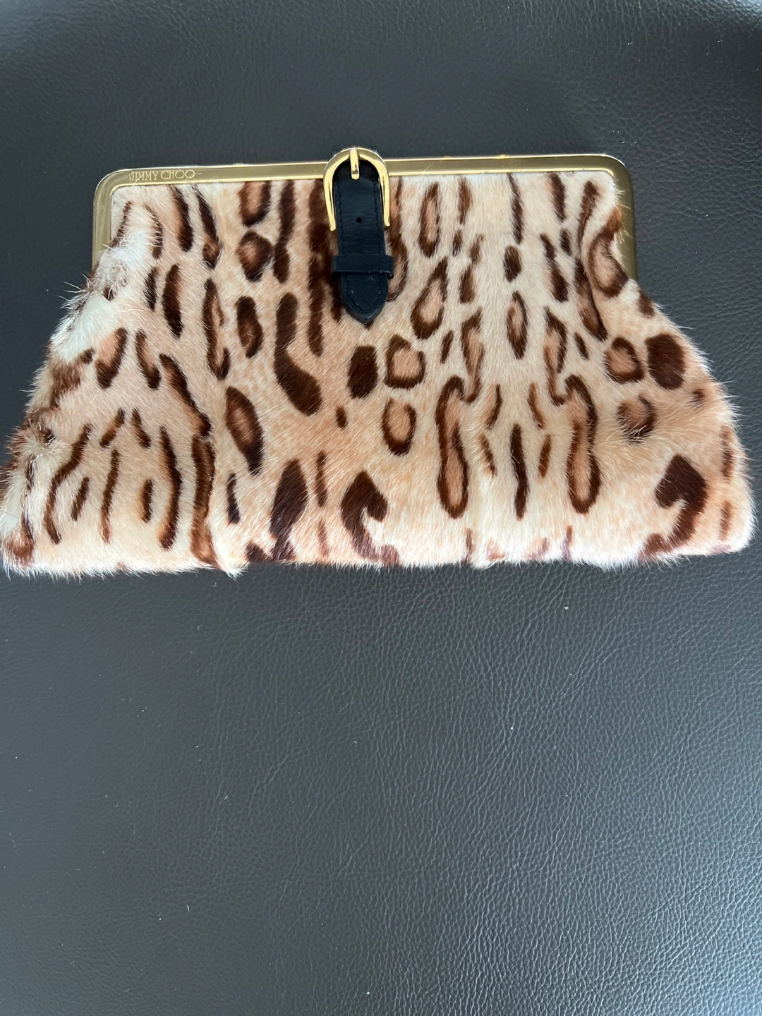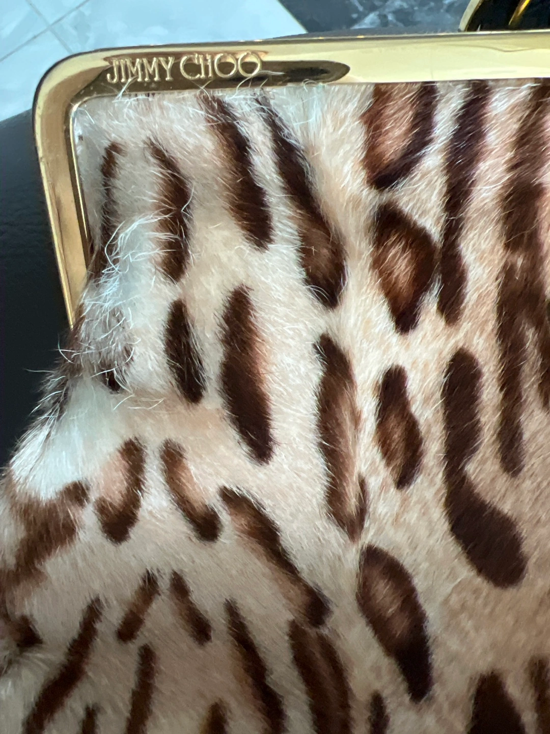 Gorgeous Jimmy Choo clutch. Leopard print fur exterior. Gold-tone hardware. Black leather interior. Small, perfect for evenings.