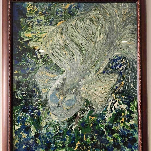 Bring a tranquil touch of flowing water and hidden life into your home with this one-of-a-kind resin painting. Inspired by the graceful movement of a koi or betta fish drifting through lush underwater gardens, each swirl of color is unique and alive with motion. Created on a sturdy panel board, sealed under clear glass, and framed with an elegant carved wooden frame — it’s ready to hang and enjoy. Size: 19.5" W × 22" H. Medium: Acrylic pour & resin on panel board. Framed: Yes — glass front, all one piece. Original: One-of-a-kind, no prints made.