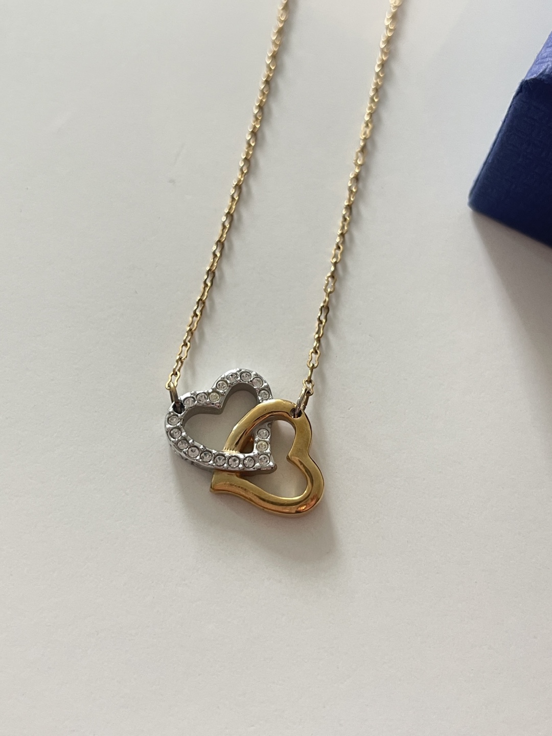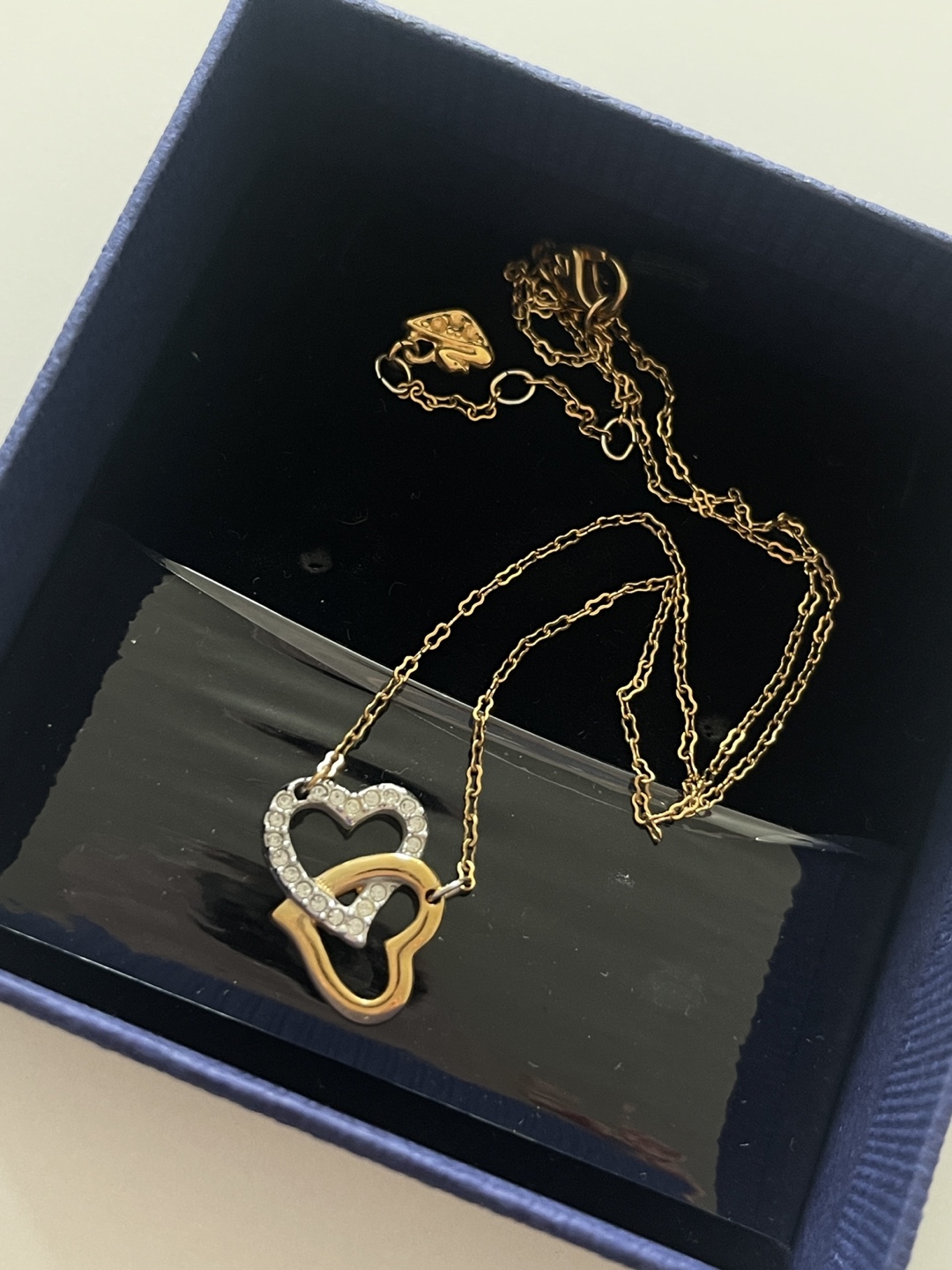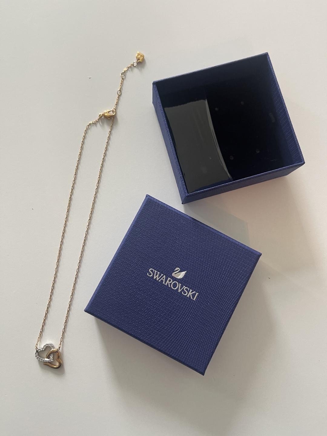 Gold-tone chain and pendant. Features two interlocking hearts, one embellished with clear crystals. Comes with original Swarovski box.