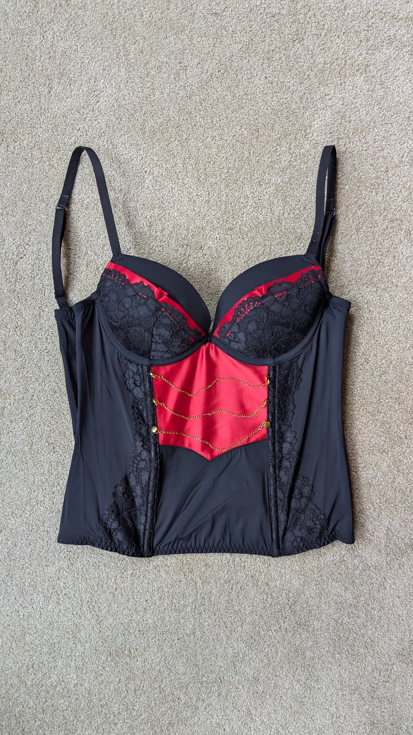 Stunning black corset top. Features red satin accents and delicate black lace. Adjustable straps and a bustier style.