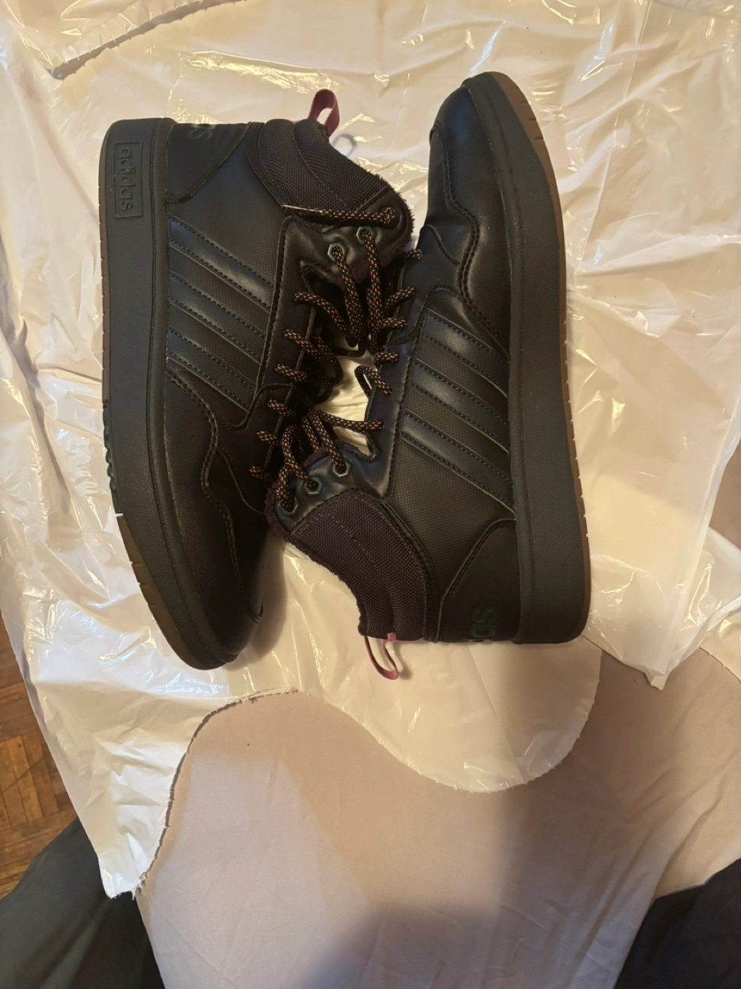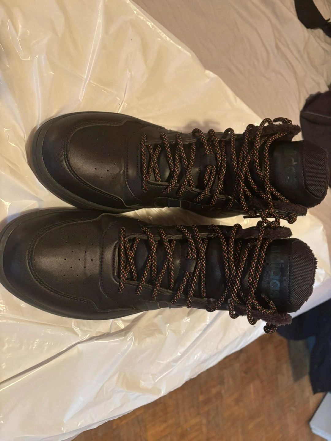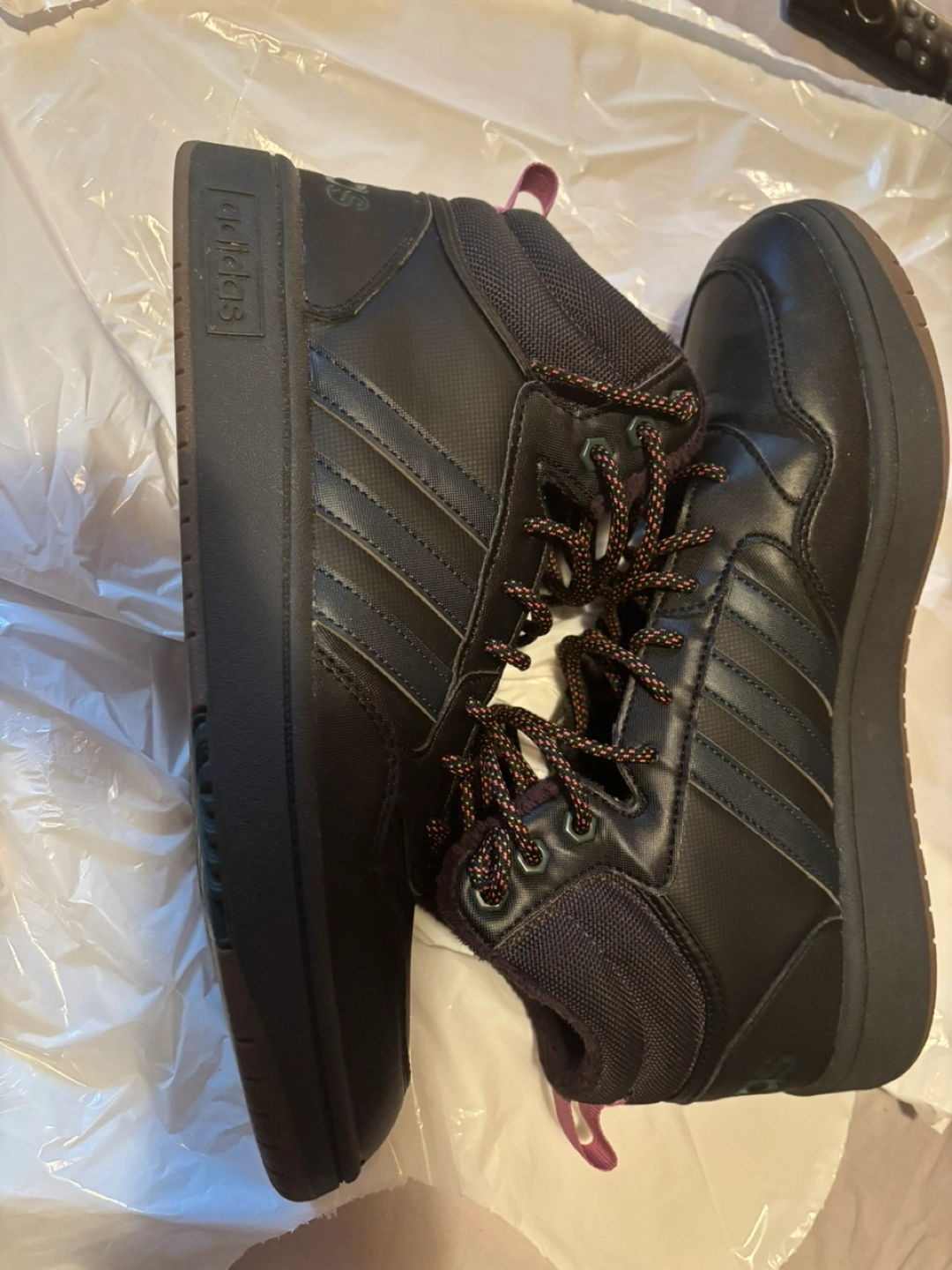 Black high-top sneakers. Brown sole. Lace-up closure. Features Adidas branding. Warm fleece lining.