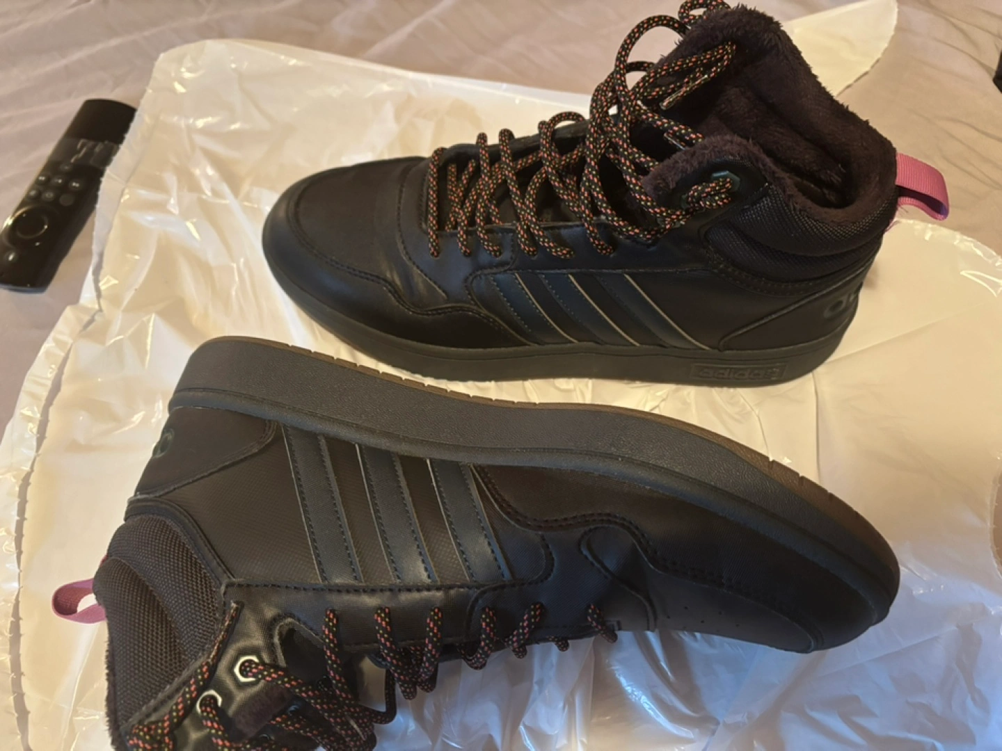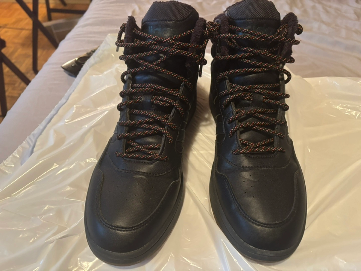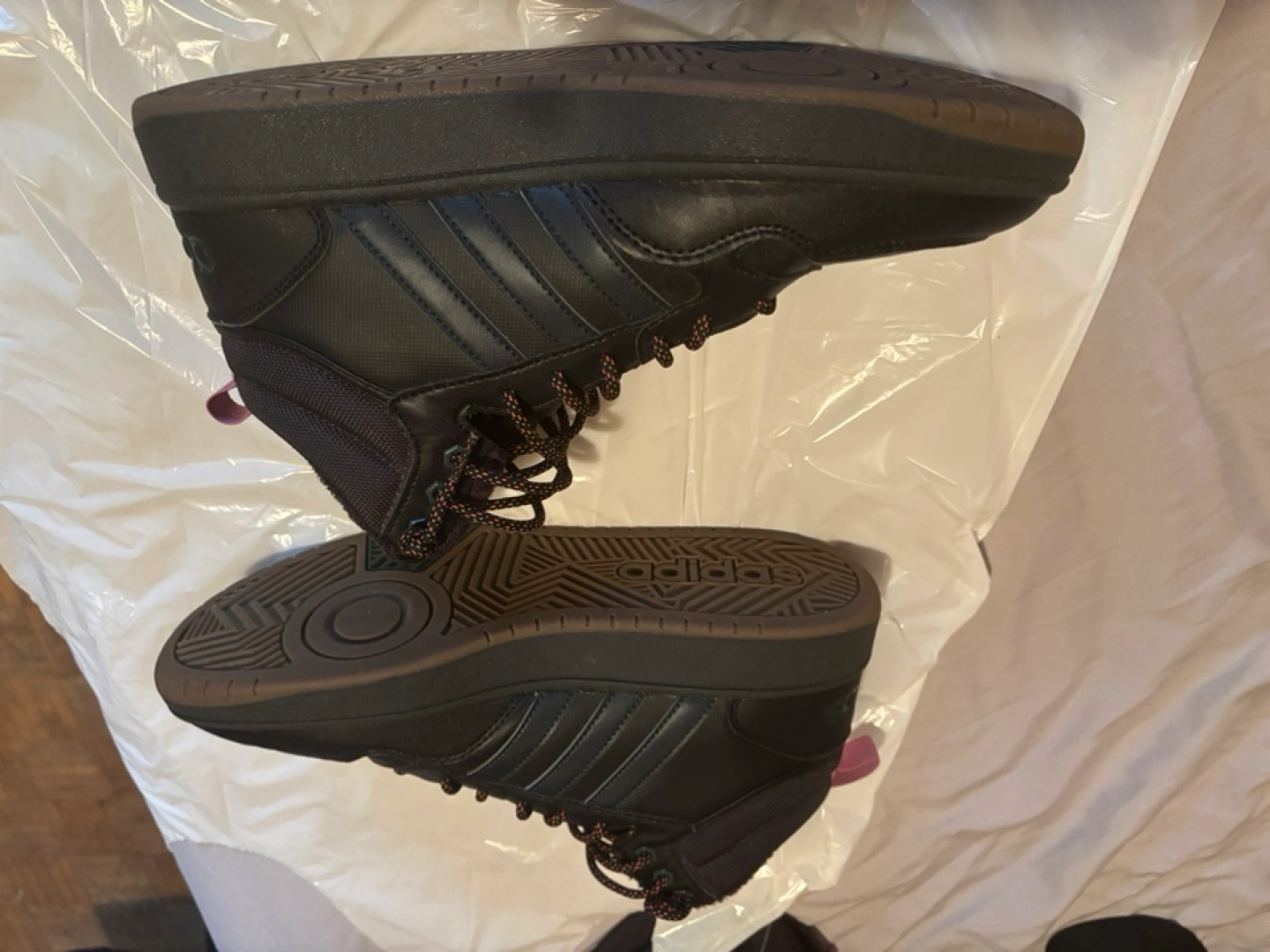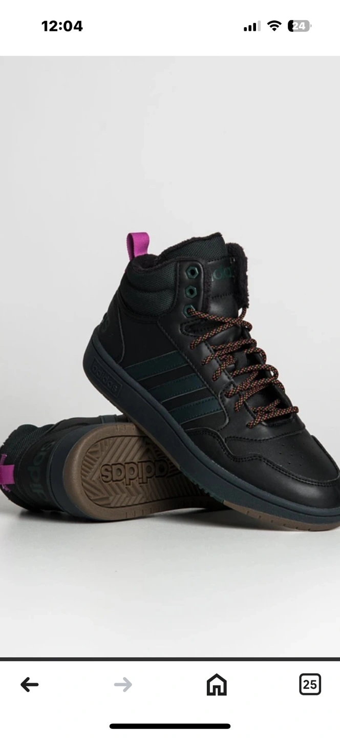 Black high-top sneakers. Brown sole. Lace-up closure. Features Adidas branding. Warm fleece lining.