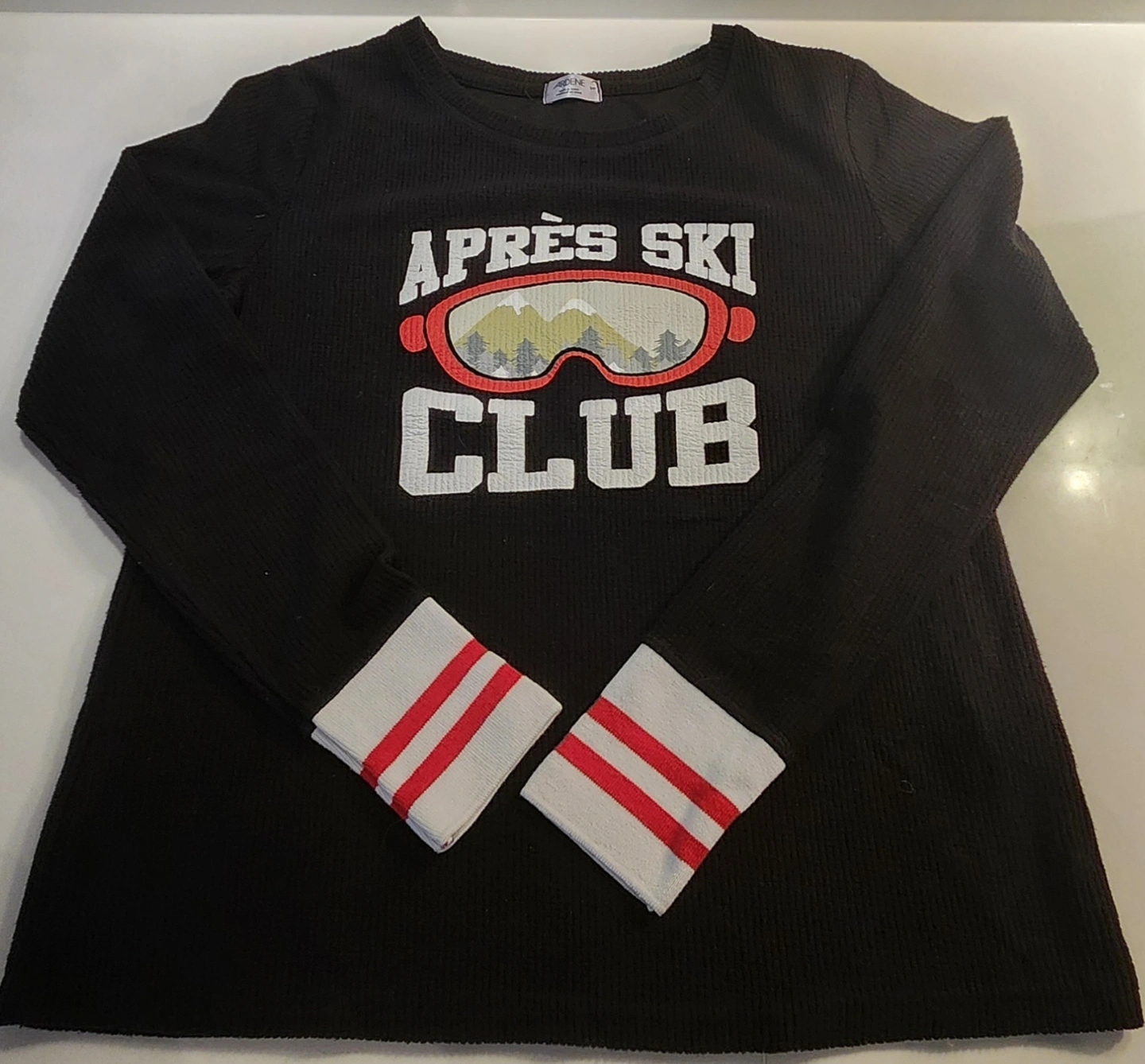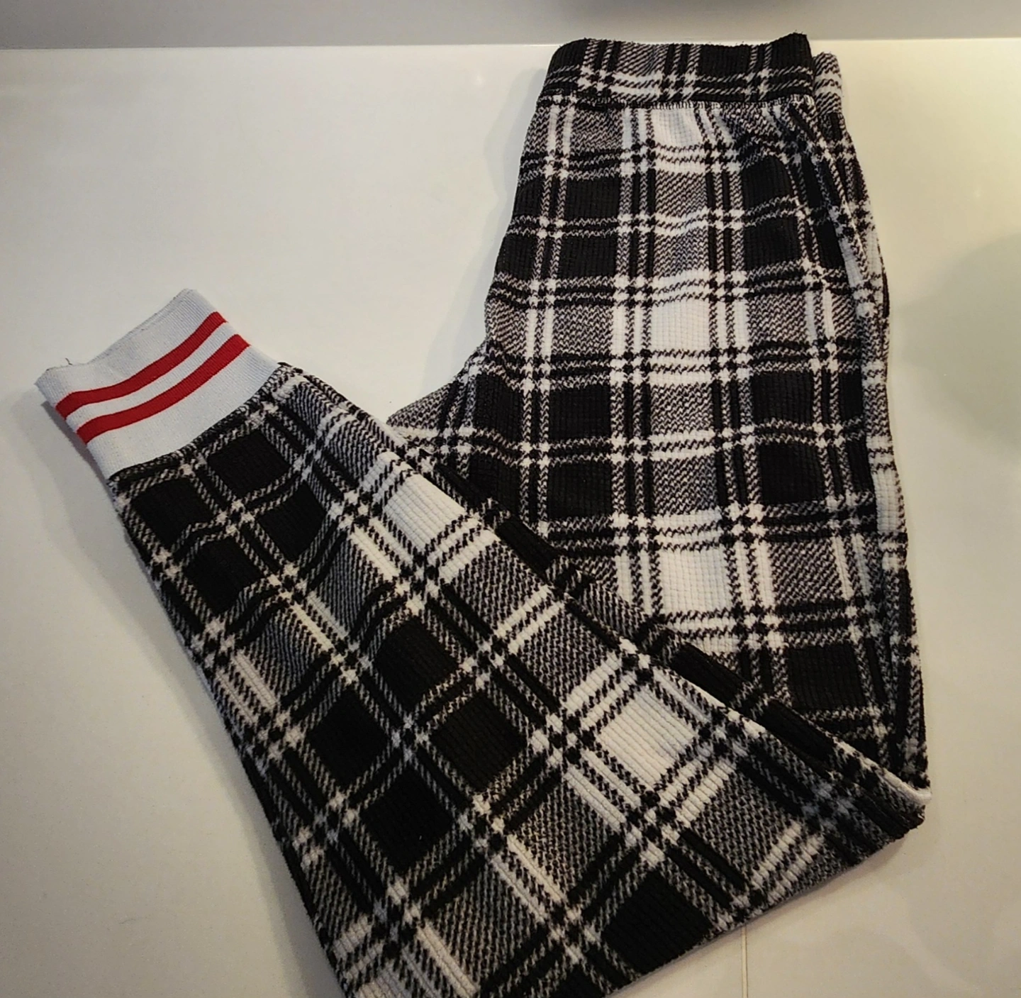 Black and white plaid waffle knit lounge top and pants set. Red and white ribbed cuffs. Drawstring waist. Size Small.