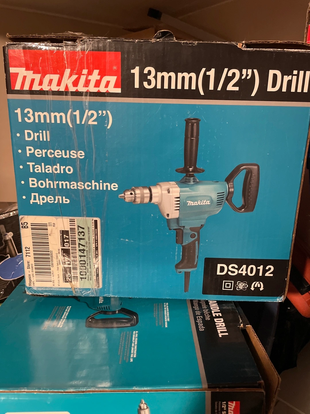 78New Makita 13mm (1/2") drill. Single speed, all ball bearing construction. Includes handle. Model DS4012.