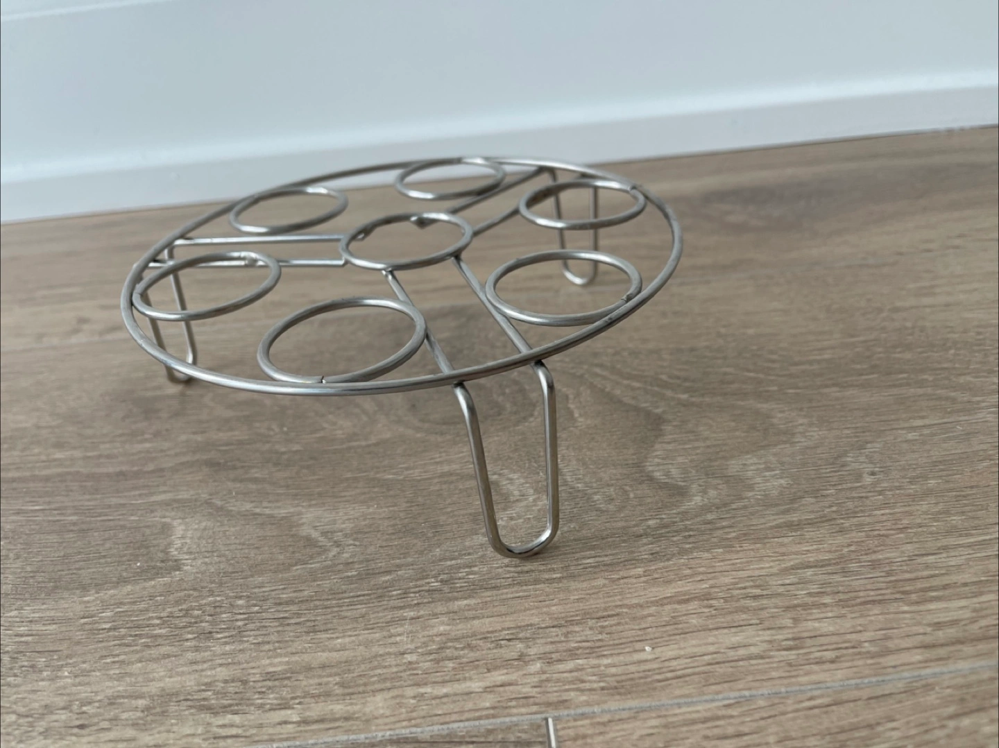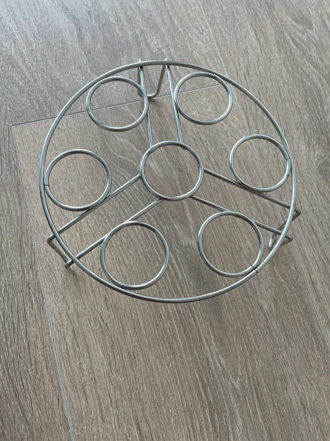152Circular egg poacher. Holds six eggs. Stainless steel construction. Small stand for stability.