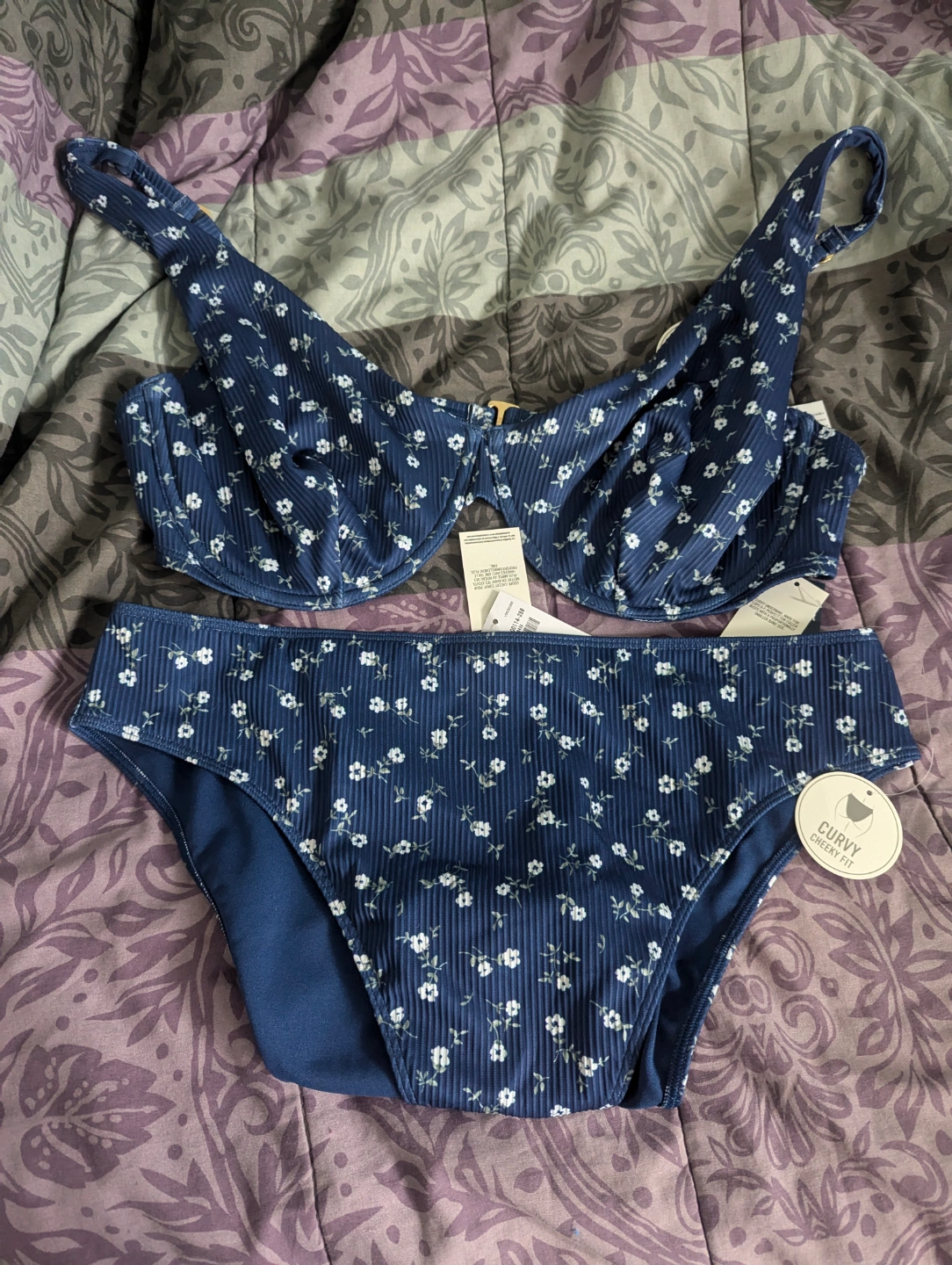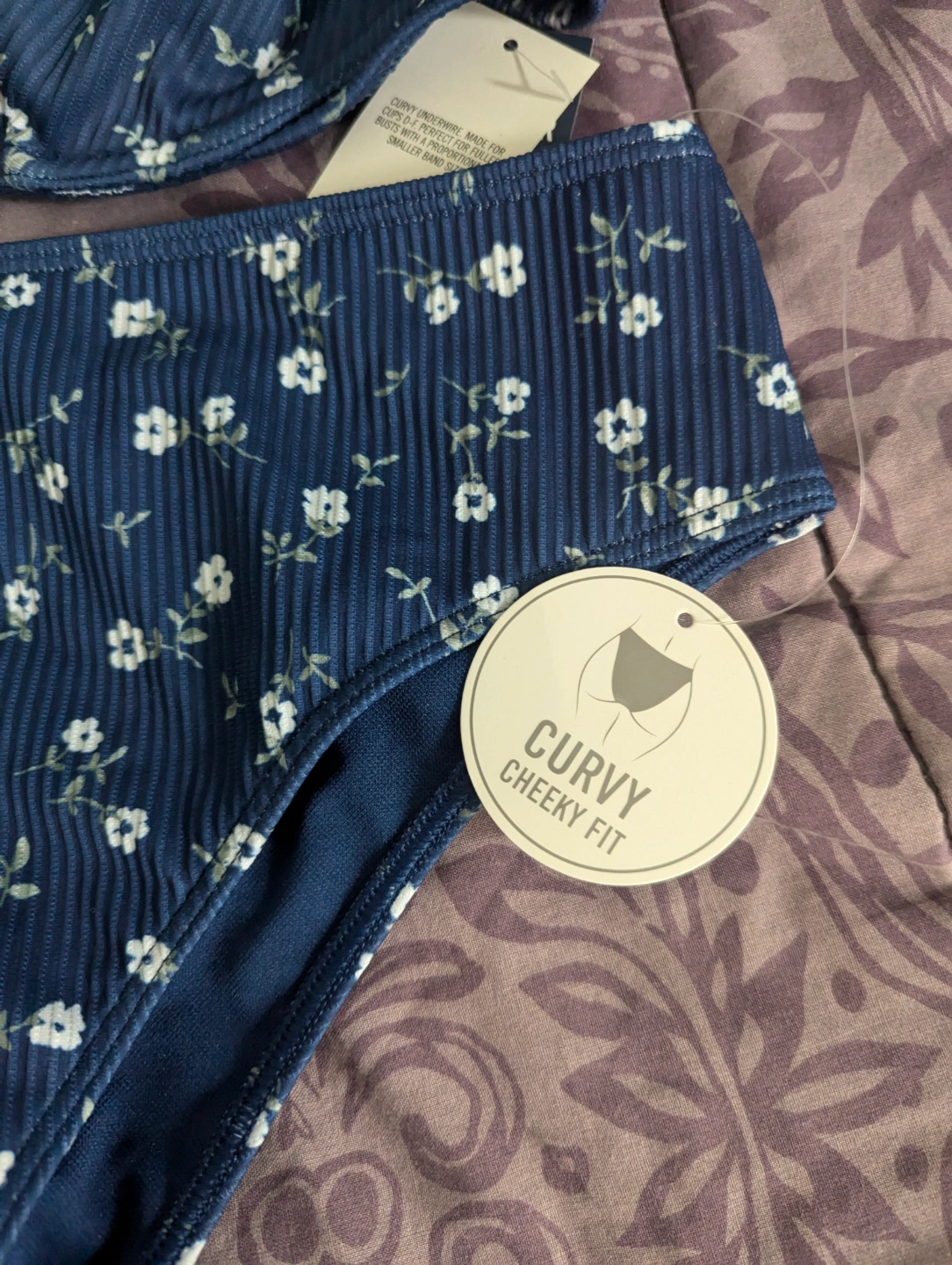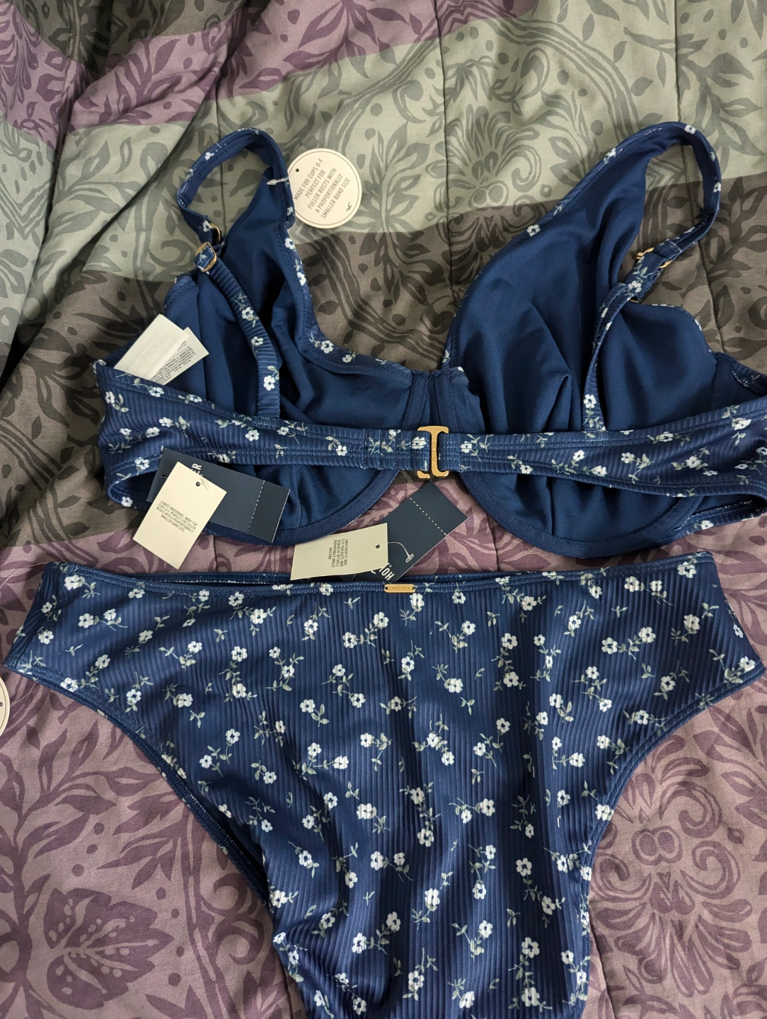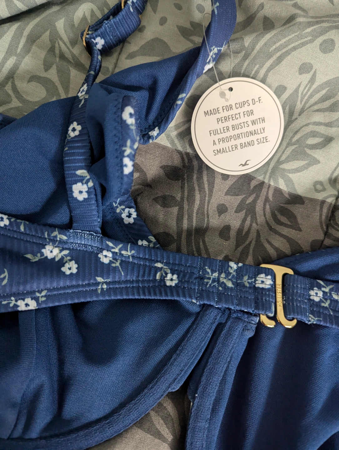 Hollister wired bikini. Navy blue with white floral print. Ribbed fabric. Curvy cheeky fit. New with tags.