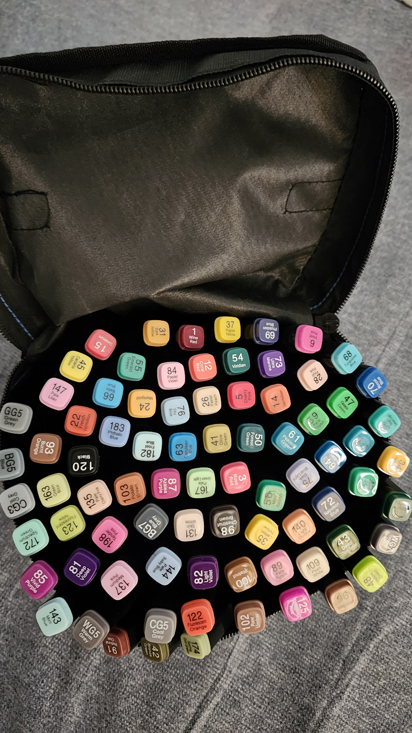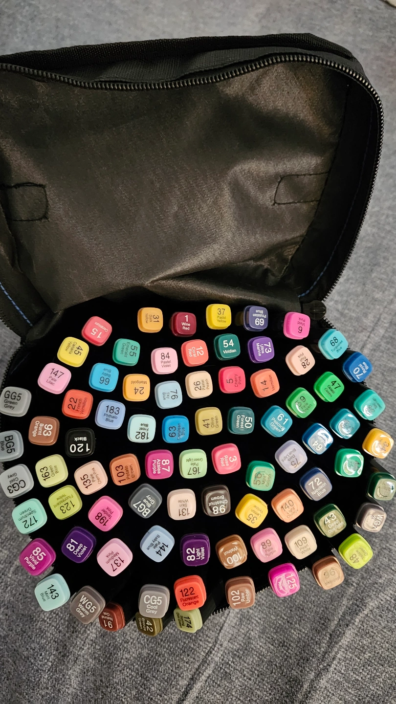 Set of 80 alcohol-based markers. Various colours. Comes in a black carrying case. Great for artists and hobbyists.