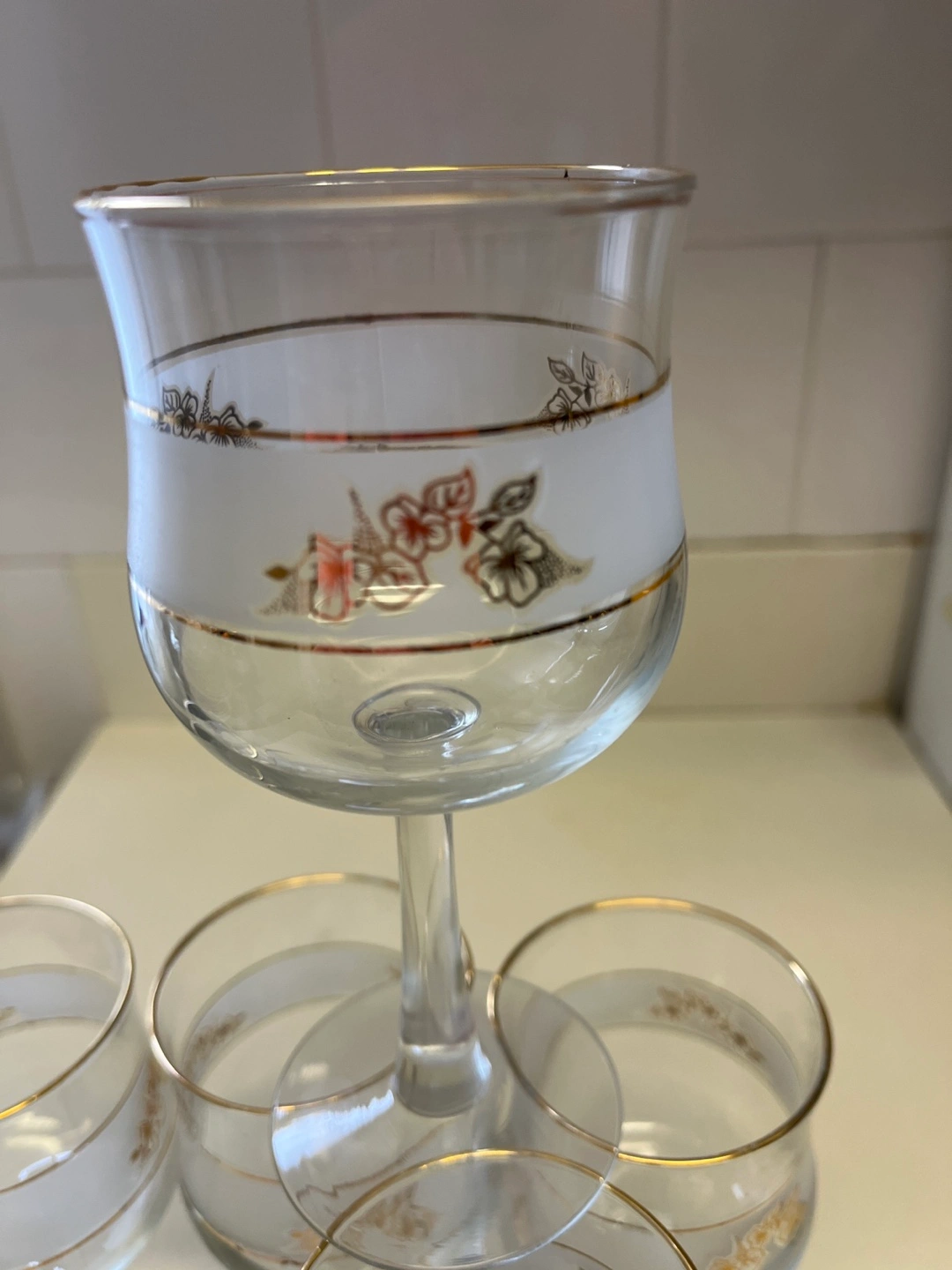 Set of 5 vintage stemmed wine glasses. Clear glass with frosted band and gold accents. Floral design. Approximately 6 inches tall.