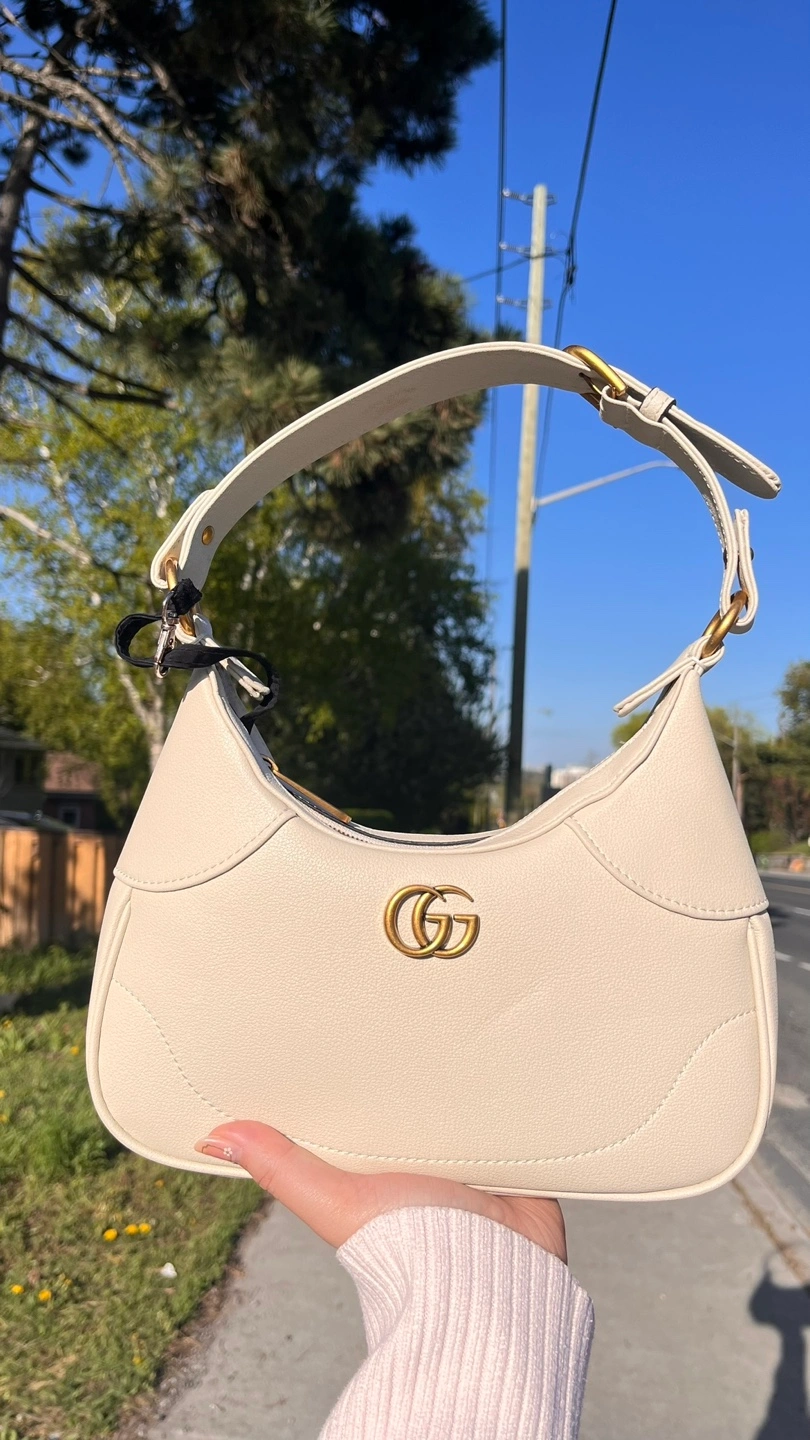 Cream coloured leather handbag. Features gold-toned hardware and signature GG logo. Small, crescent shaped bag. Top handle and zip closure. With extra two strap: golden short strap and adjustable long leather strap