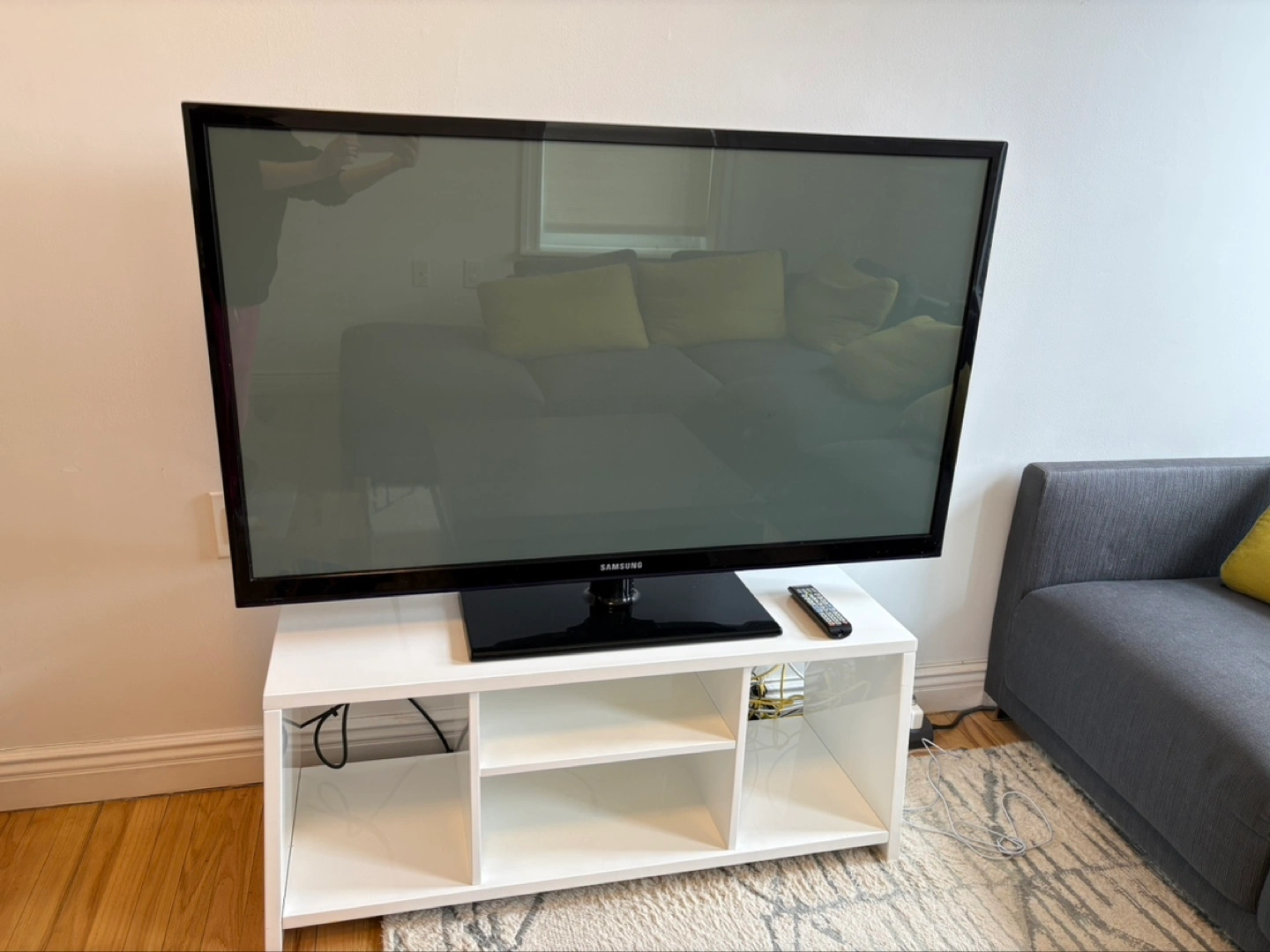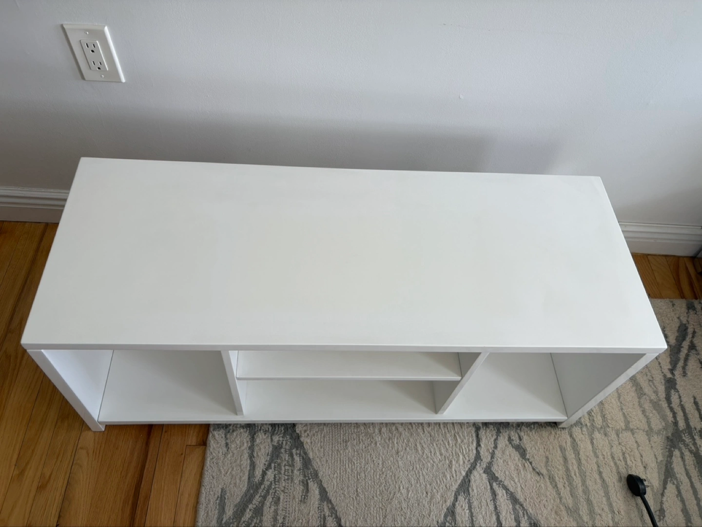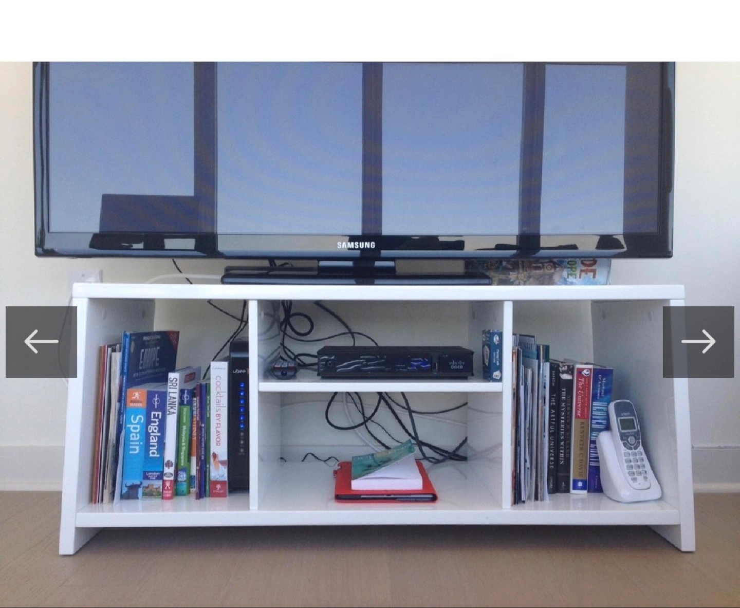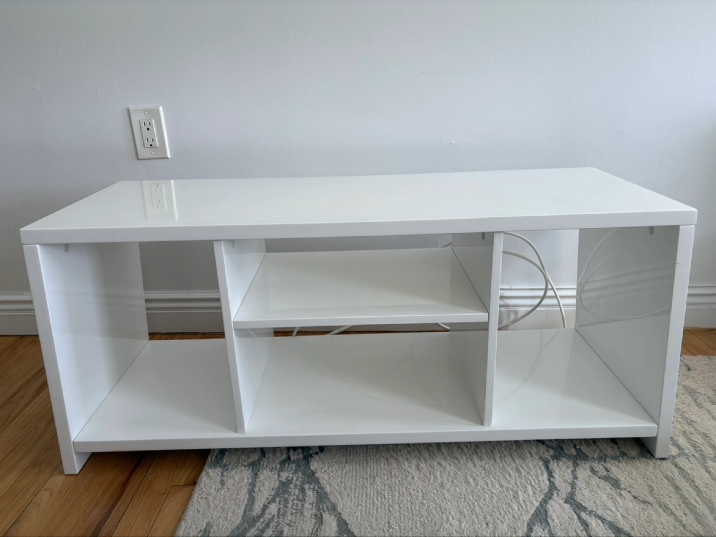 CB2 White TV stand with multiple compartments. Great for storing media components and other items. Clean and modern design. Sturdy construction.