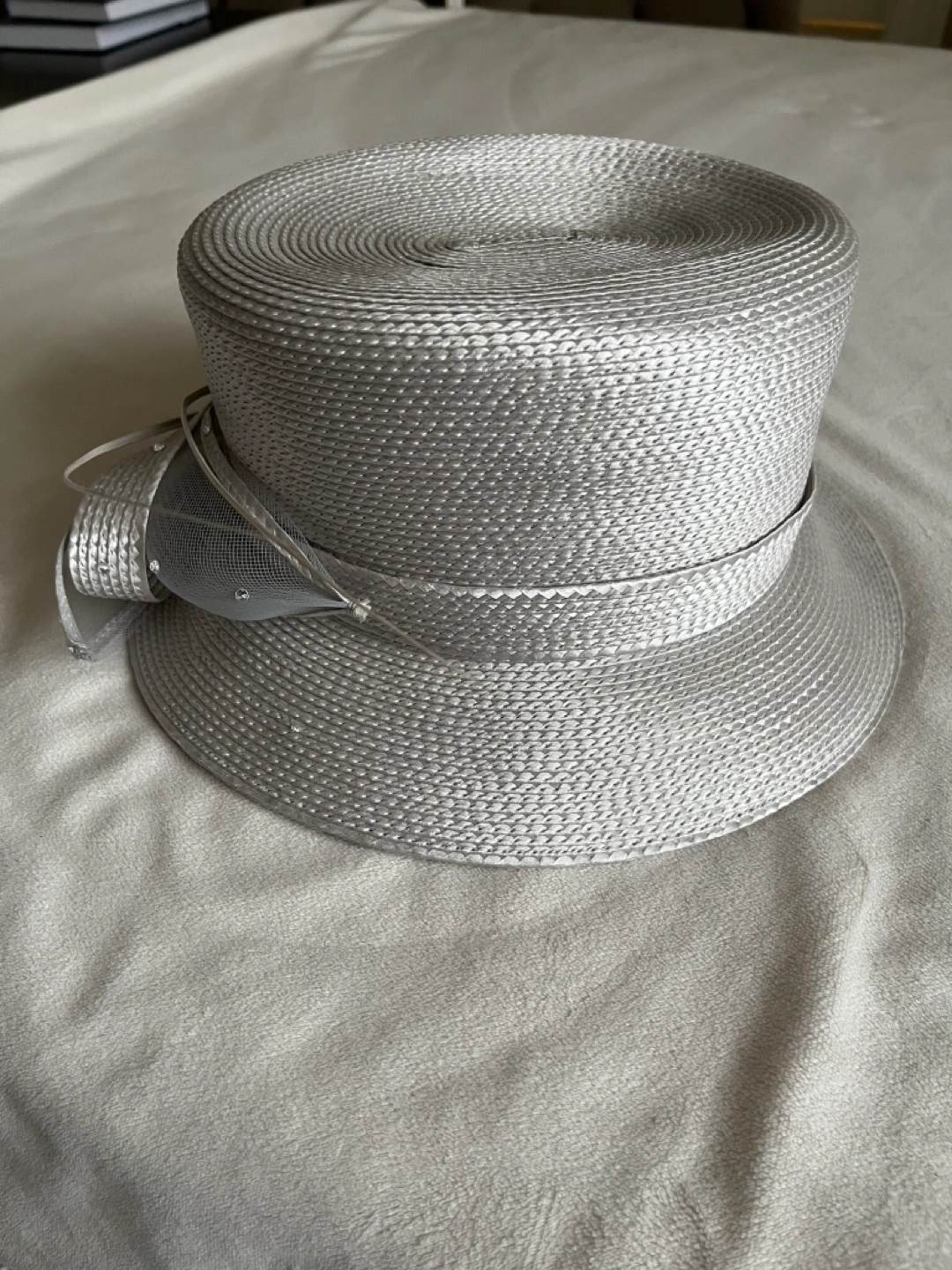 Elegant silver hat, perfect for weddings or other formal events. Features a stylish bow and feather accents. Lightweight and comfortable. Cash only Bathurst And Steeles Pick up