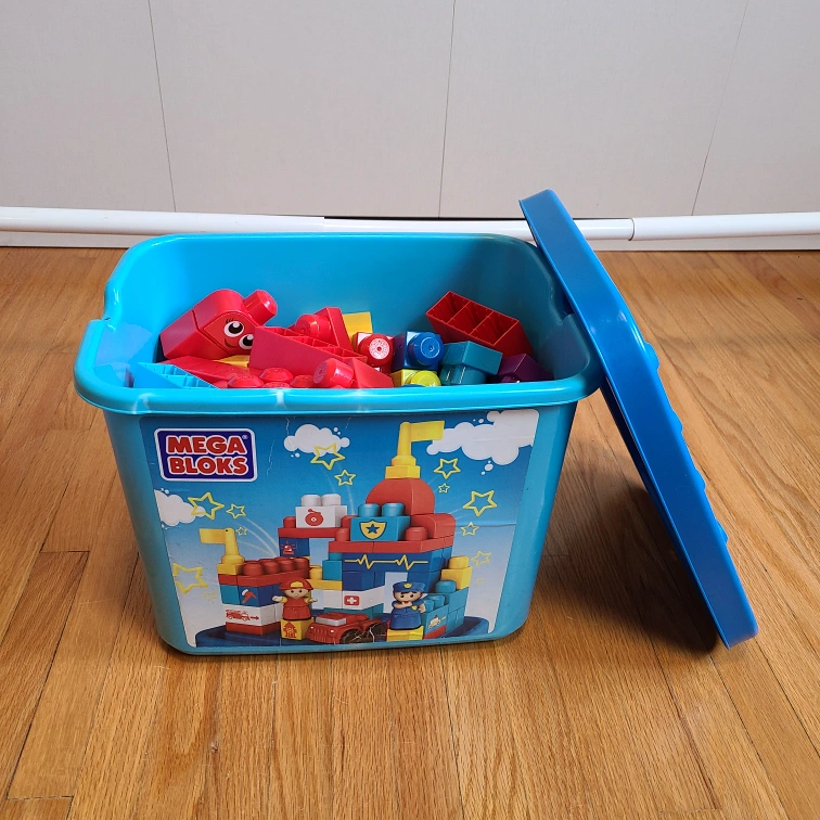 Large collection of Mega Bloks building blocks. Various colours and shapes. Includes a blue plastic storage container with lid. Great for imaginative play.