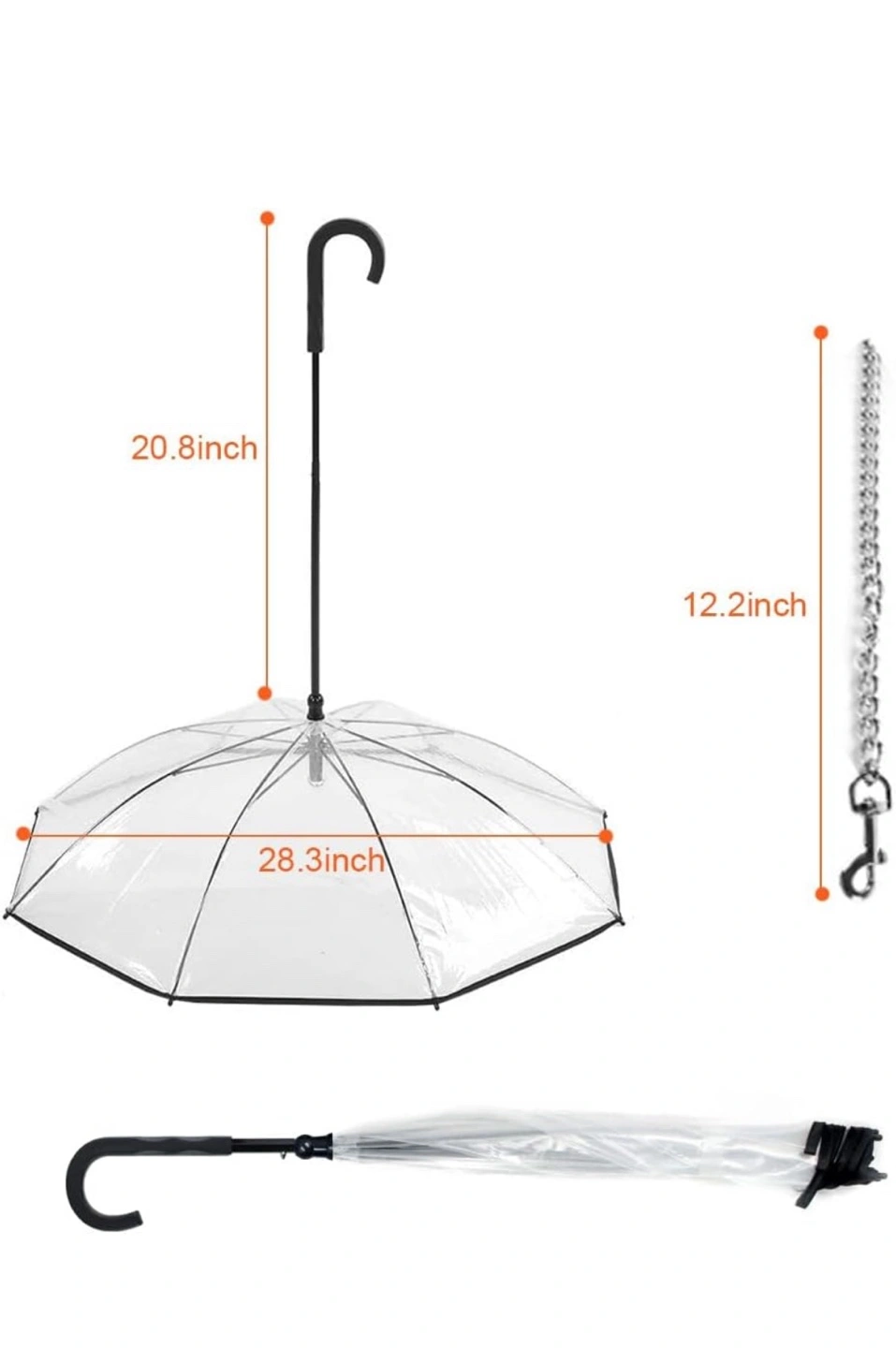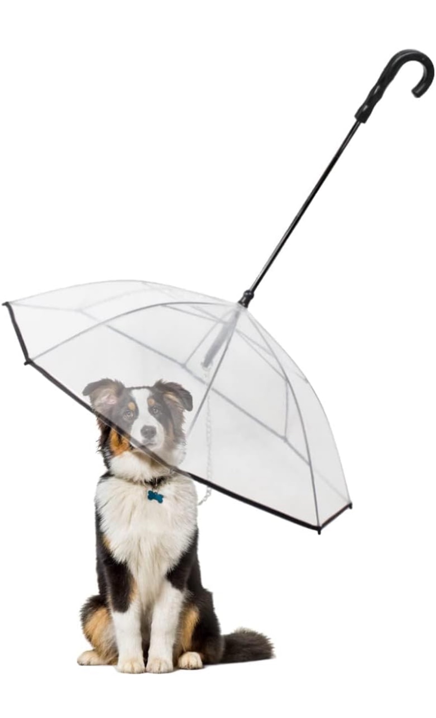 Transparent dome umbrella for pets. Keeps your furry friend dry. Features a hook for leash attachment. Durable, see-through design. Compact and easy to store. brand new