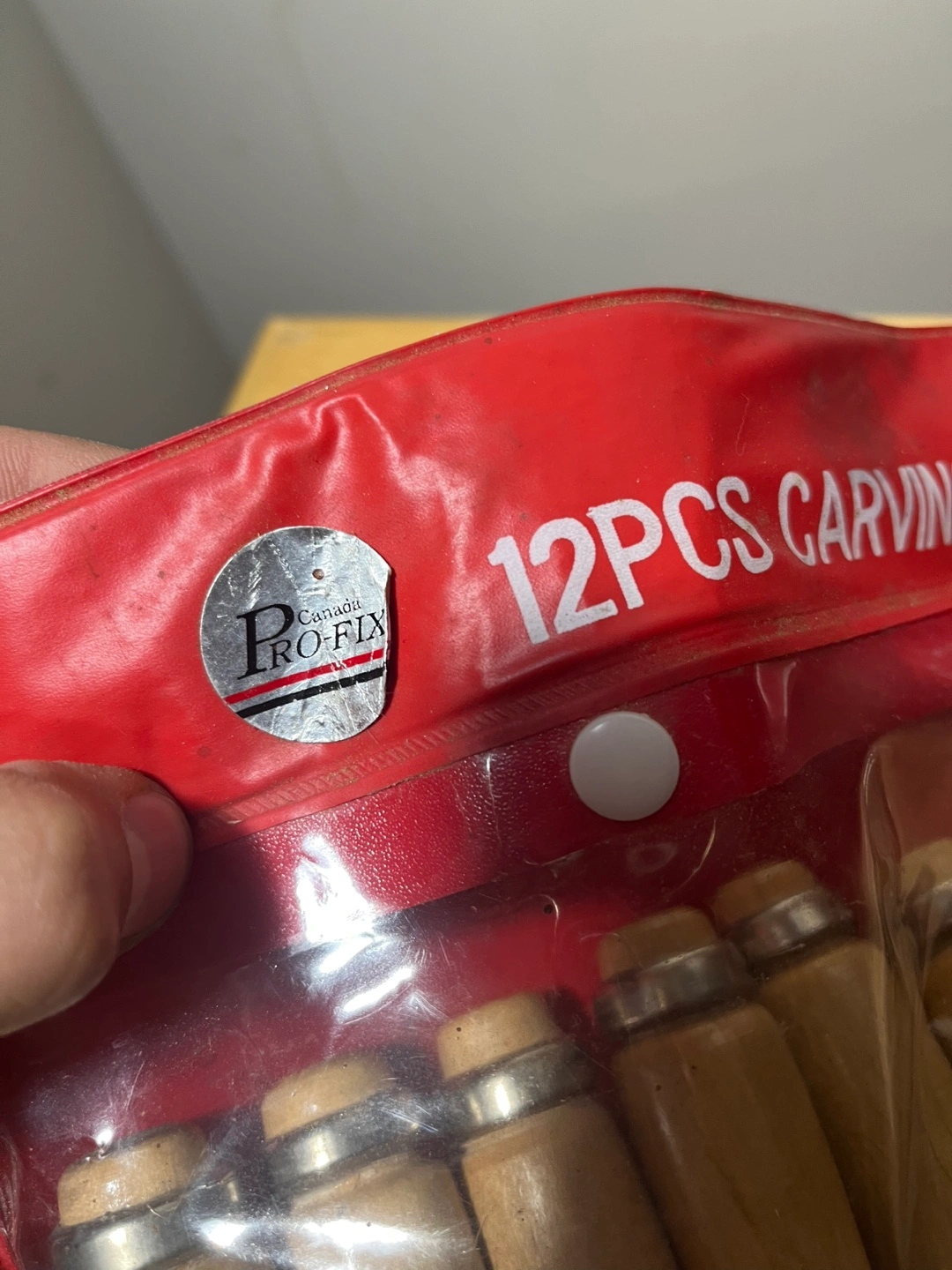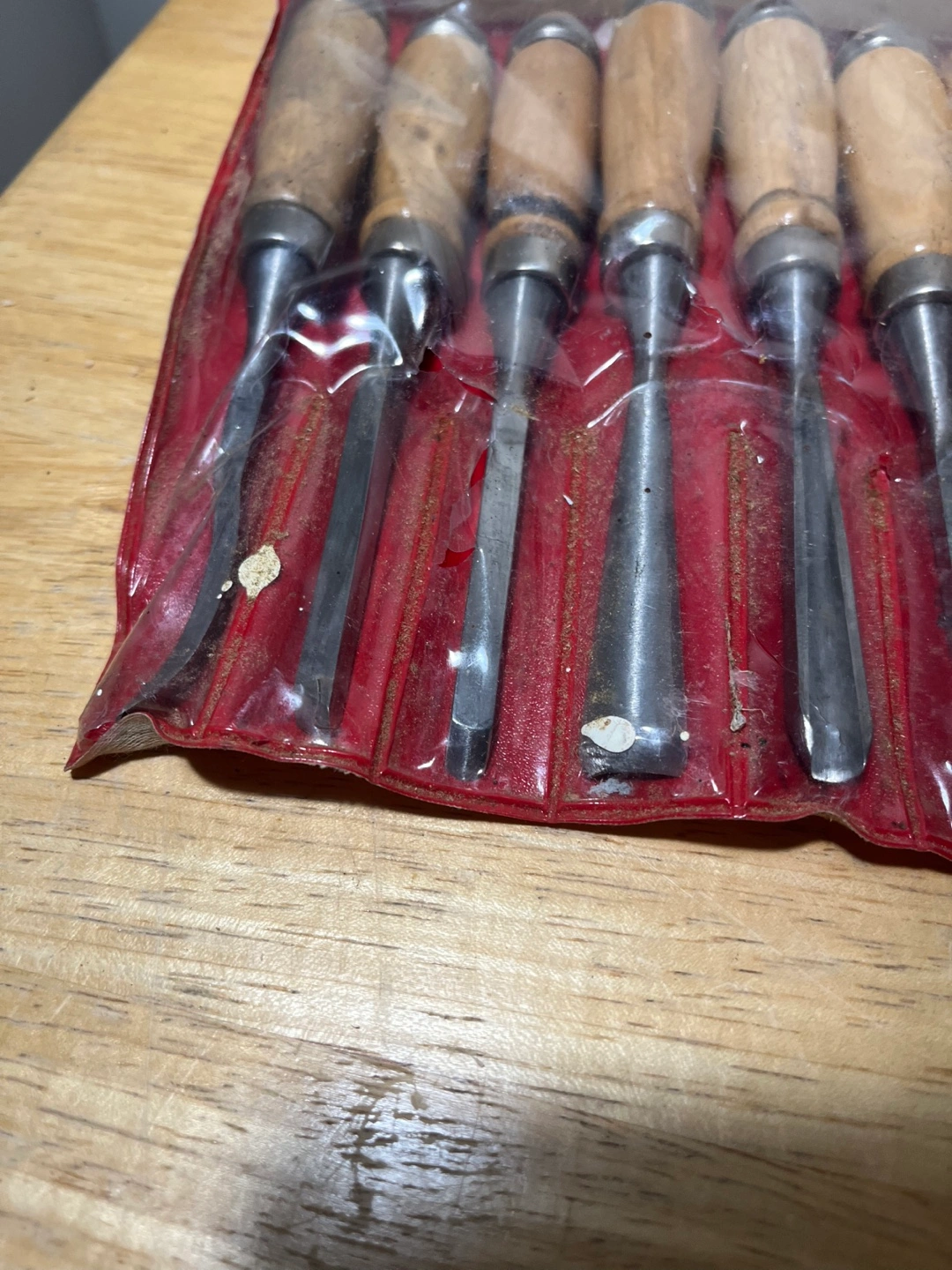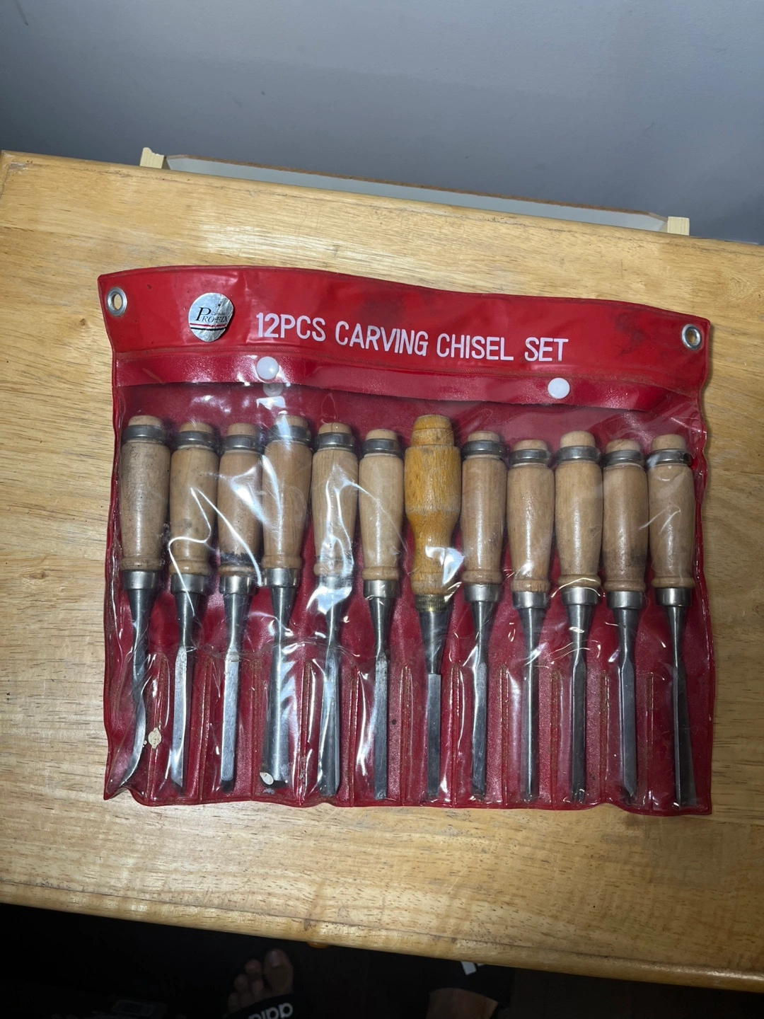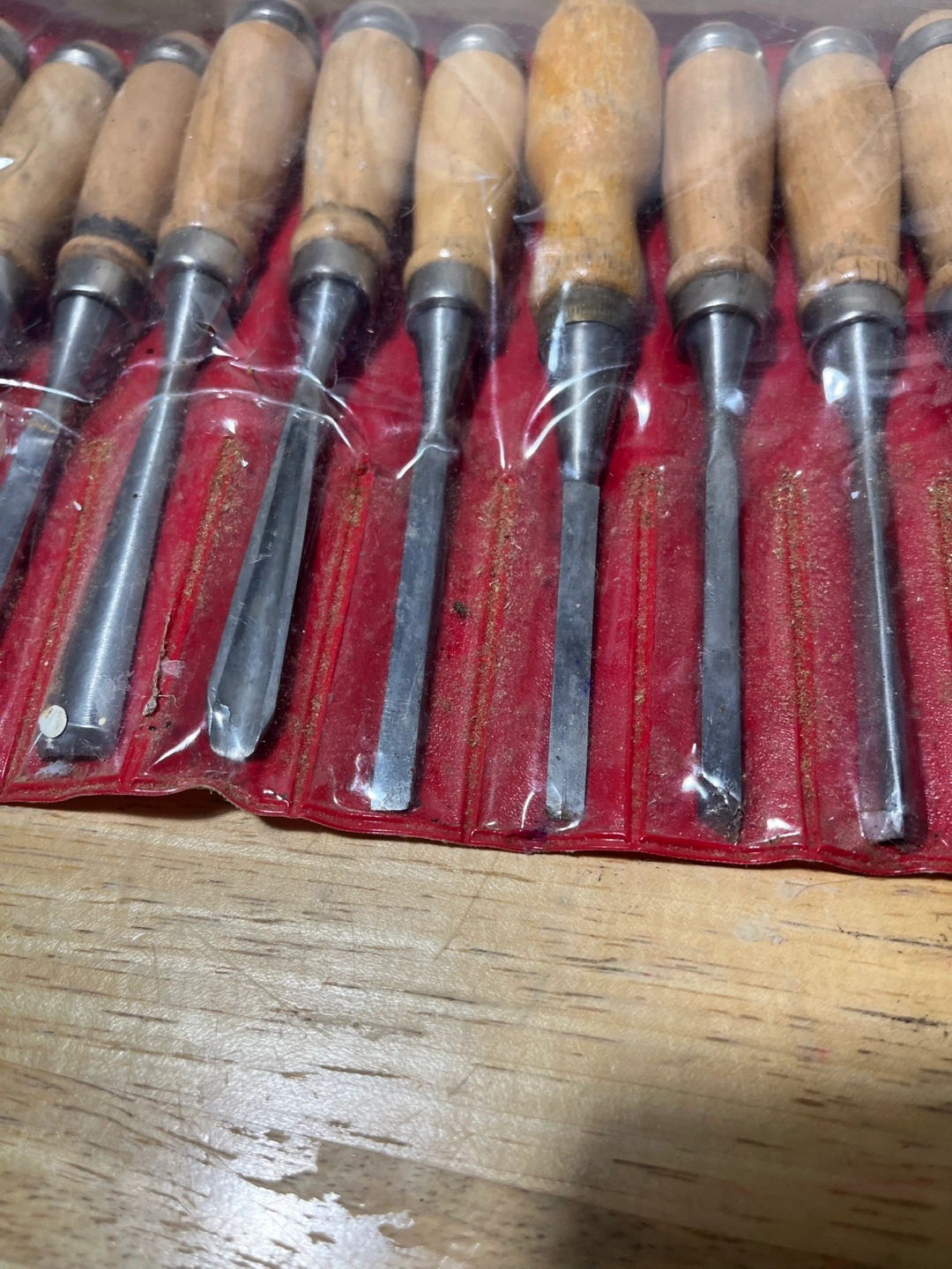 The set includes several carving chisels. They are kept in a red plastic case. The chisels have wooden handles. This set is great for artistic woodworking projects, helping you to relax and create art.