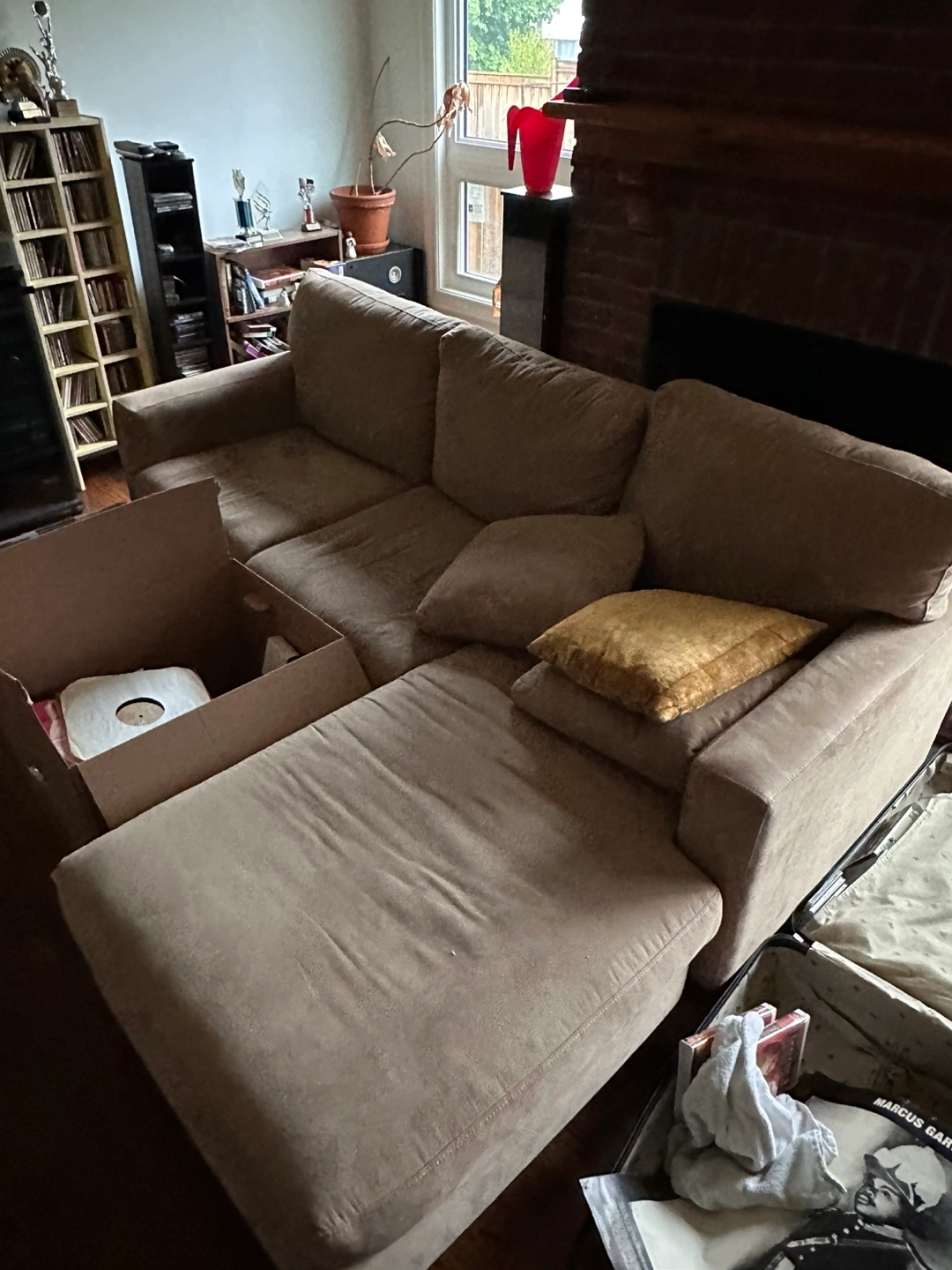Sectional sofa. Includes a chaise lounge. Fabric appears to be neutral coloured. Includes multiple cushions. Imagine yourself sinking into its softness after a long day.