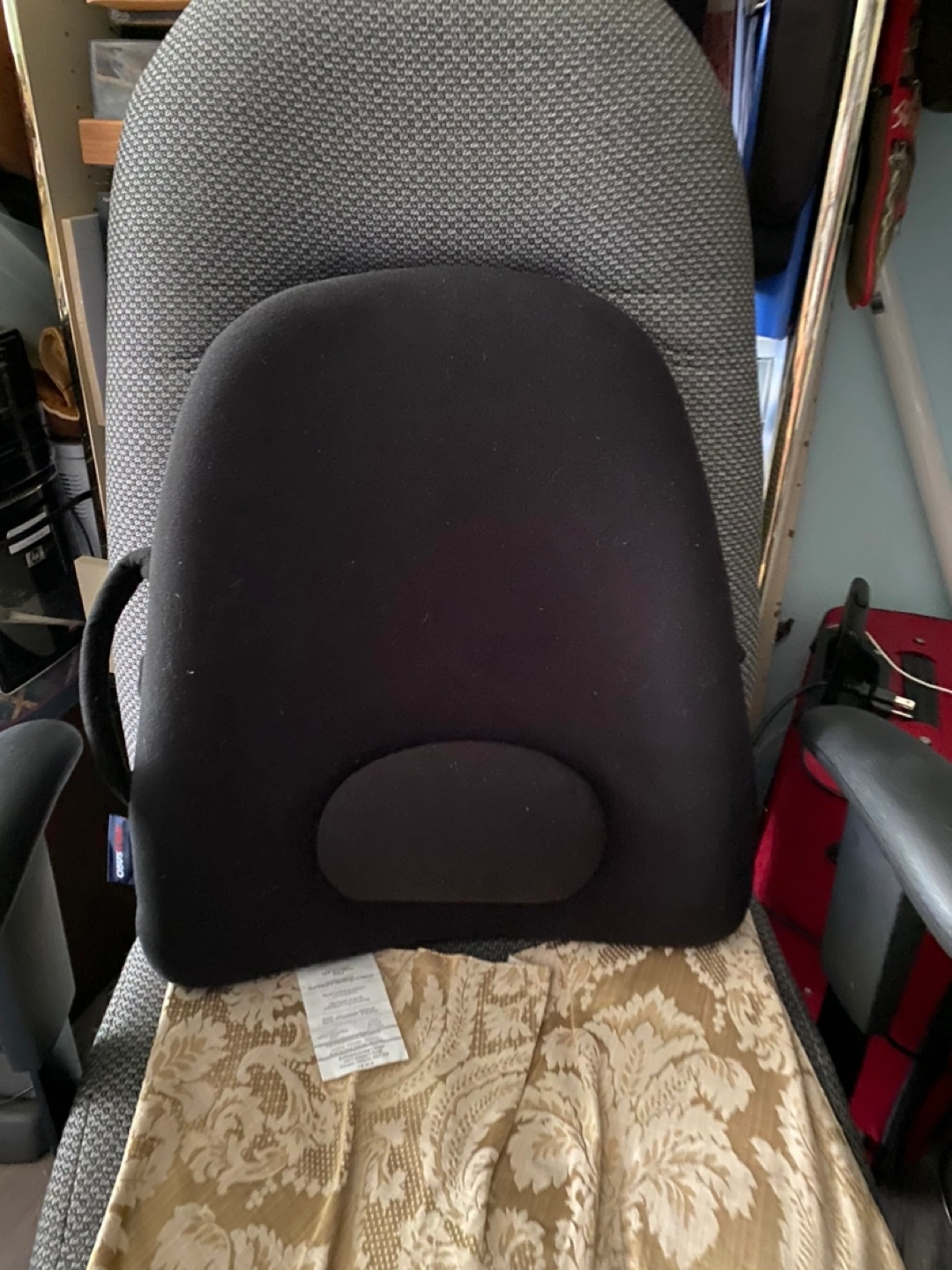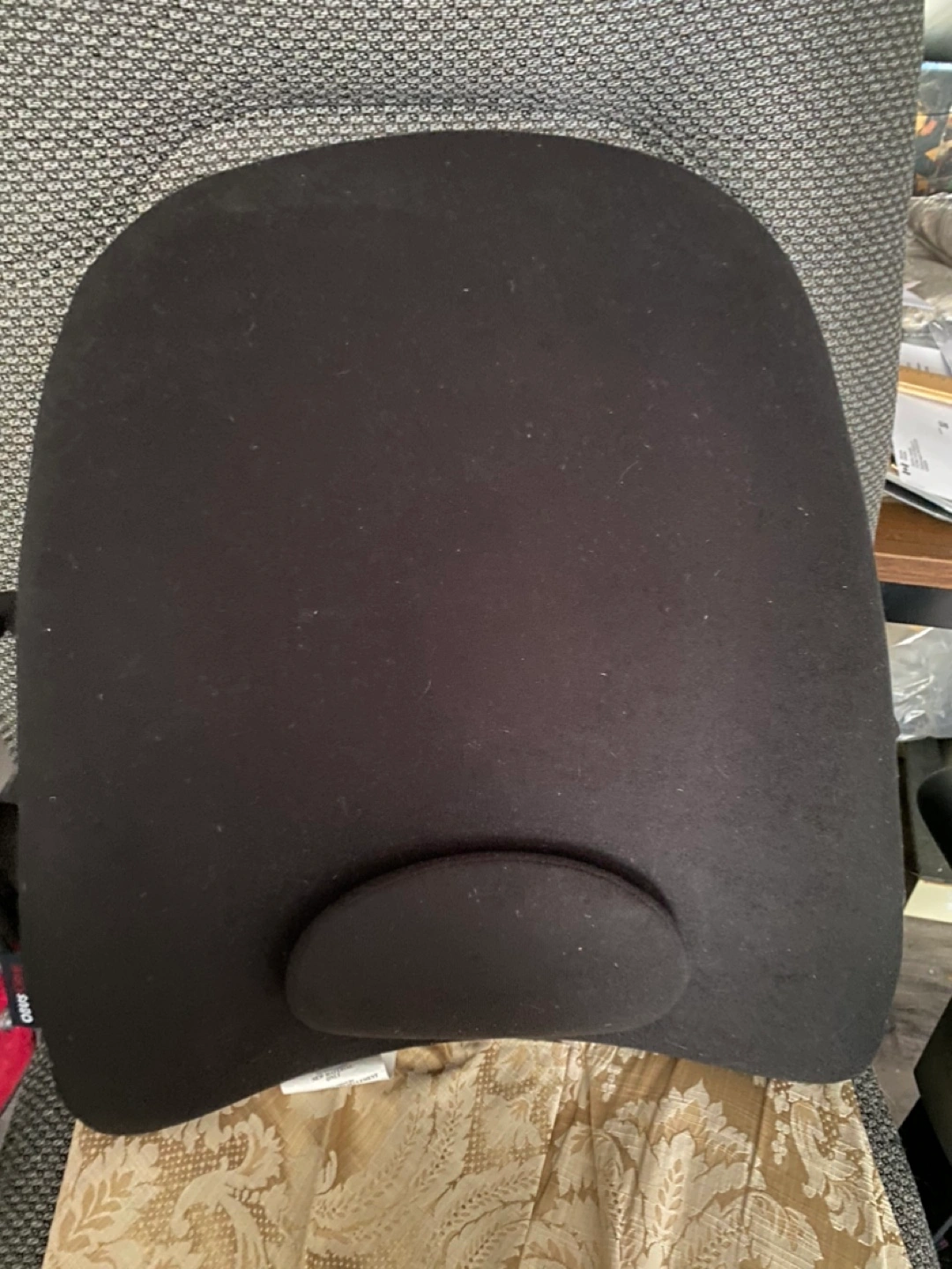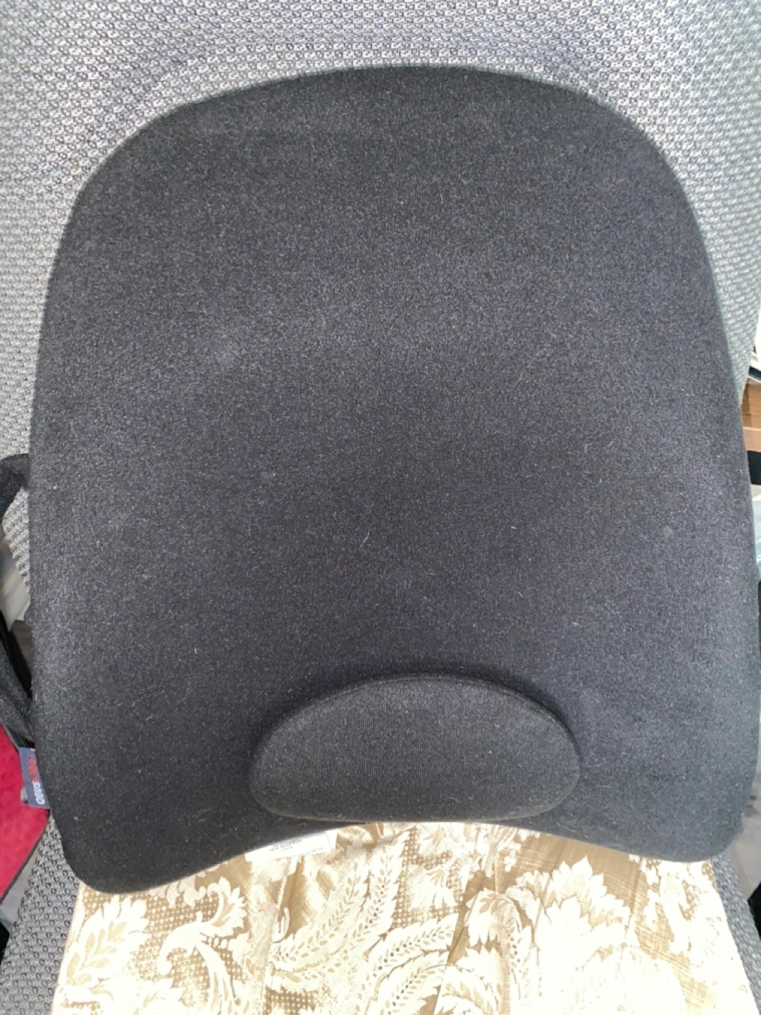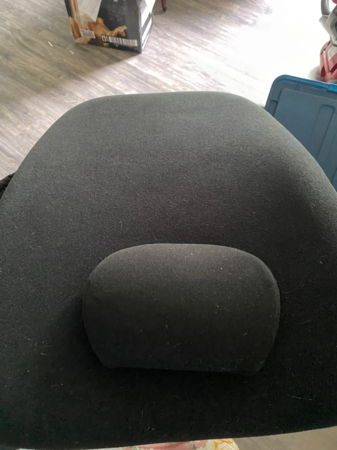Black back rest support. Appears to have a headrest. Perfect to help you relax after a long day.